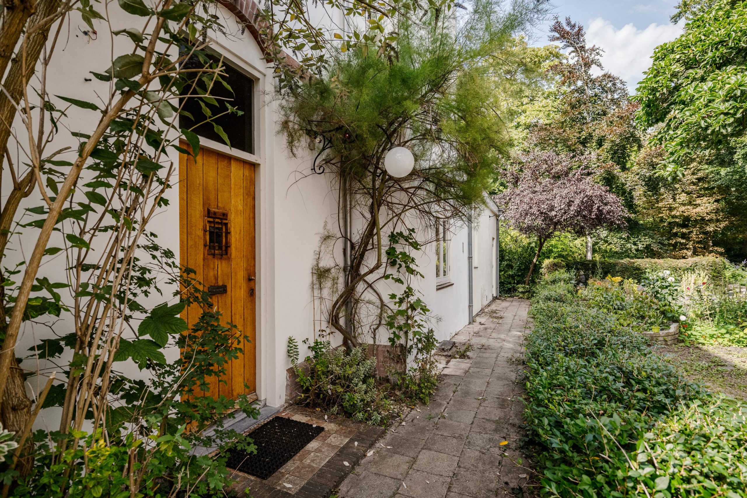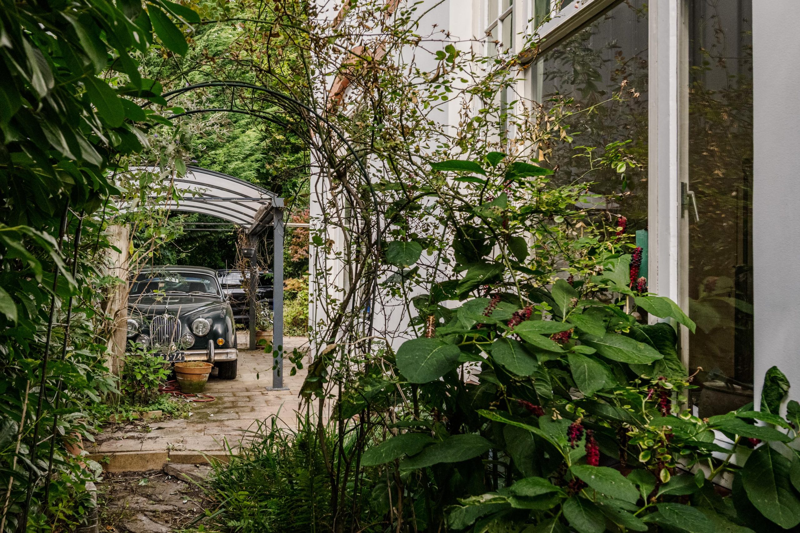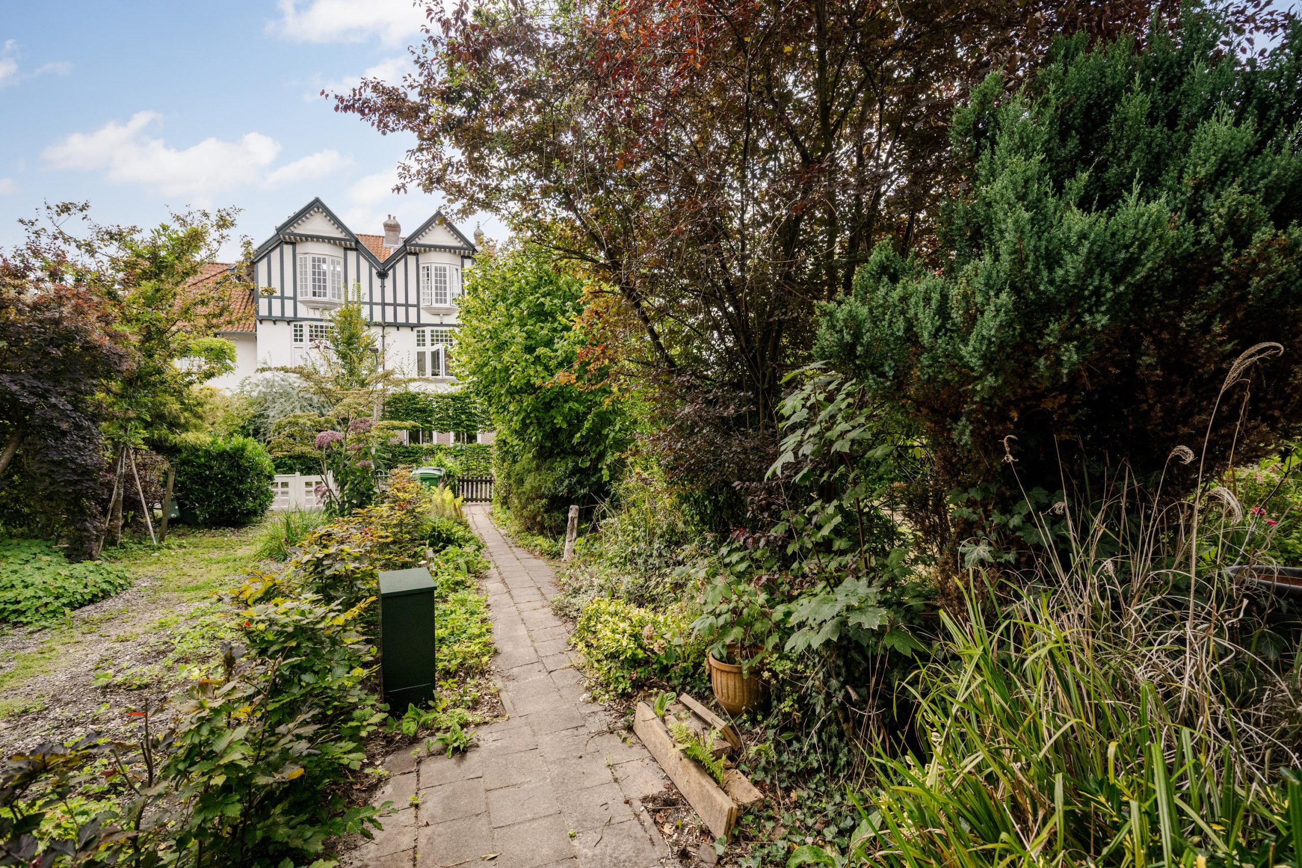 De tuin loopt rondom de woning, met zowel een zonnige voortuin op het zuiden als een diepe achtertuin met achterom. Door het volwassen groen ervaar je hier veel privacy. In de achtertuin bevindt zich tevens een vrijstaande houten berging en ruimte om meerdere auto’s op eigen terrein te parkeren.