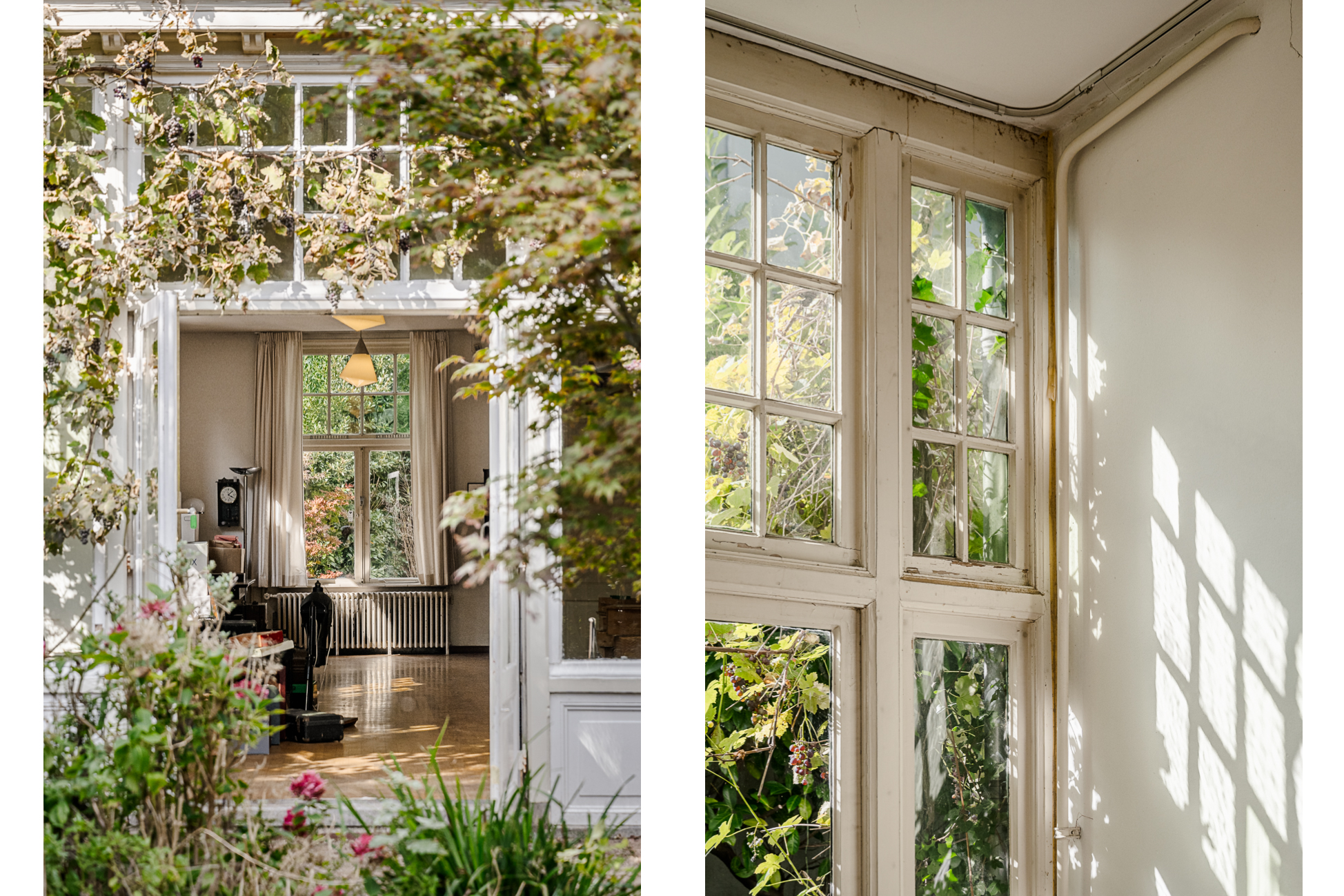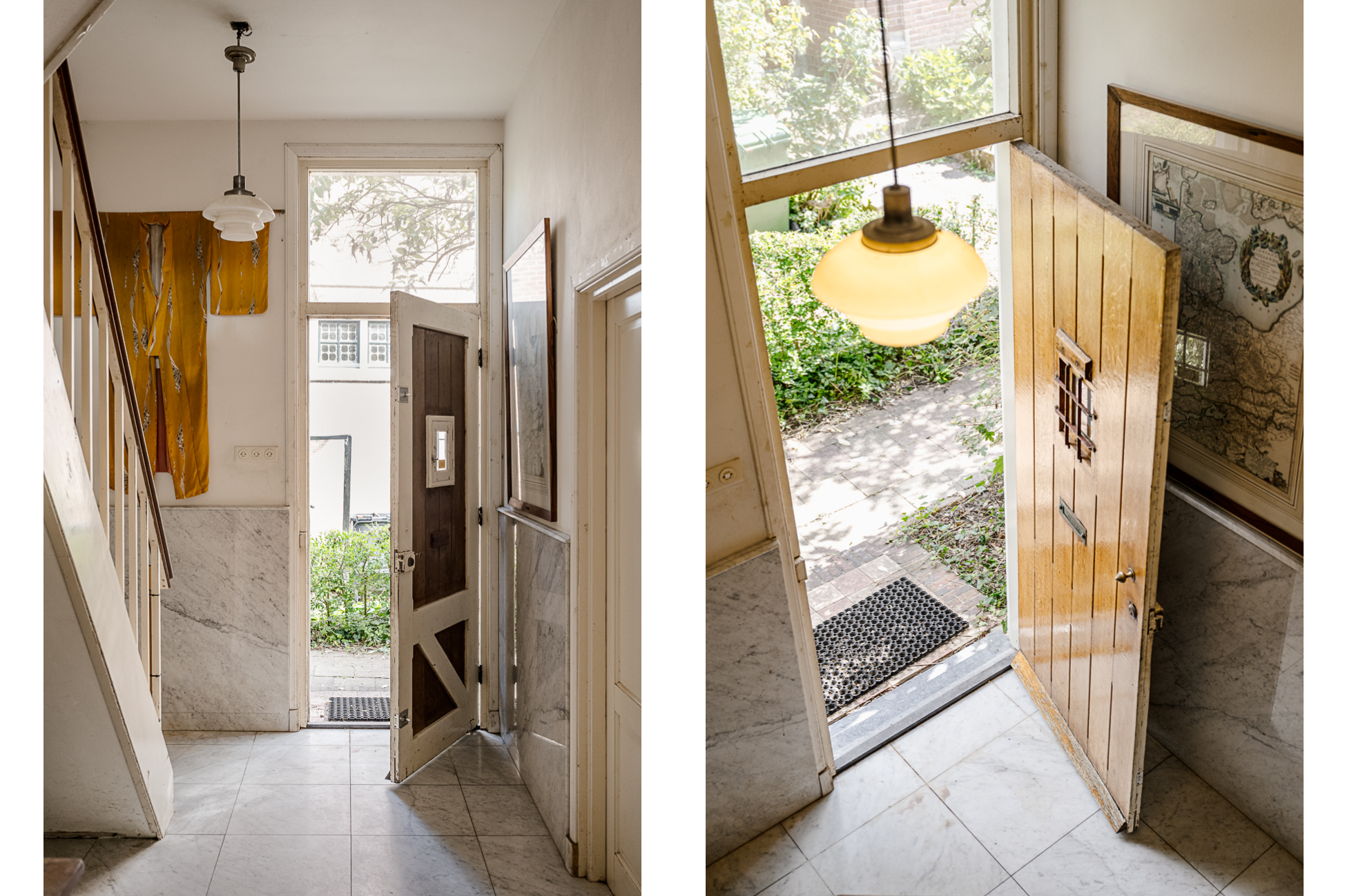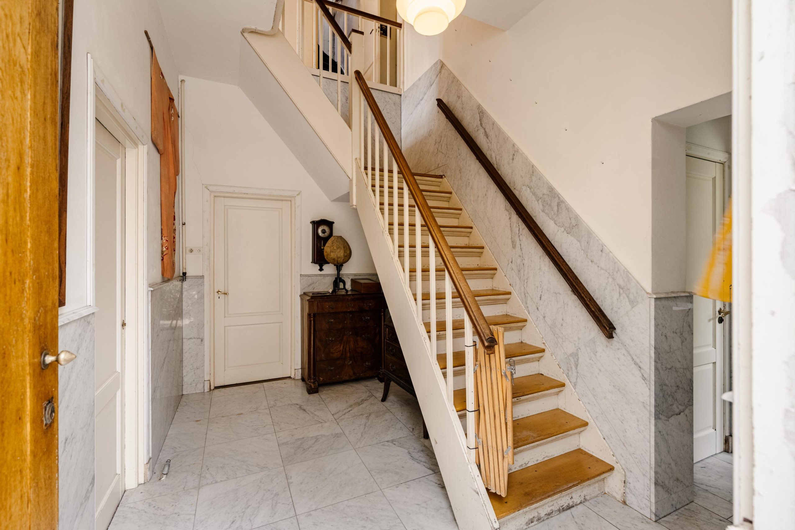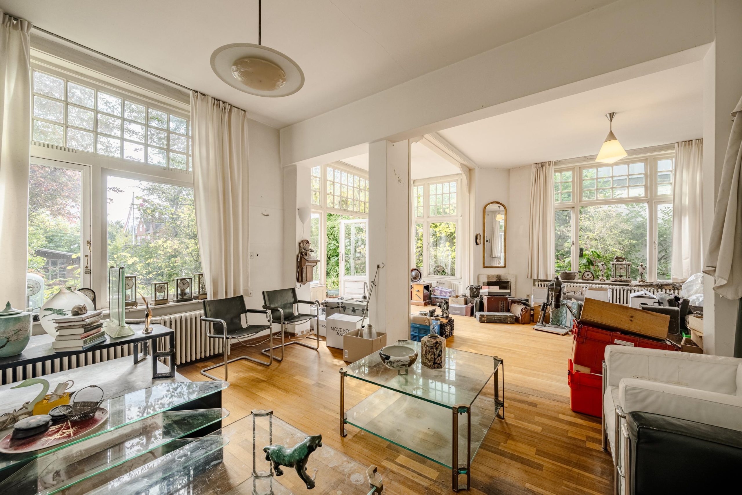 Via de statige entree betreed je de ruime hal met marmeren vloer. Hier bevinden zich de garderobe, het toilet en de trapopgang. Aan de voorzijde ligt de royale woonkamer met hoge plafonds, veel glas rondom en openslaande deuren naar de voortuin op het zuiden. Dankzij ramen aan drie zijden is het een uitzonderlijk lichte ruimte, met karakteristieke details zoals glas-in-lood en houten kozijnen. Aan de achterzijde van de woonkamer geven openslaande deuren toegang tot de beschutte achtertuin.