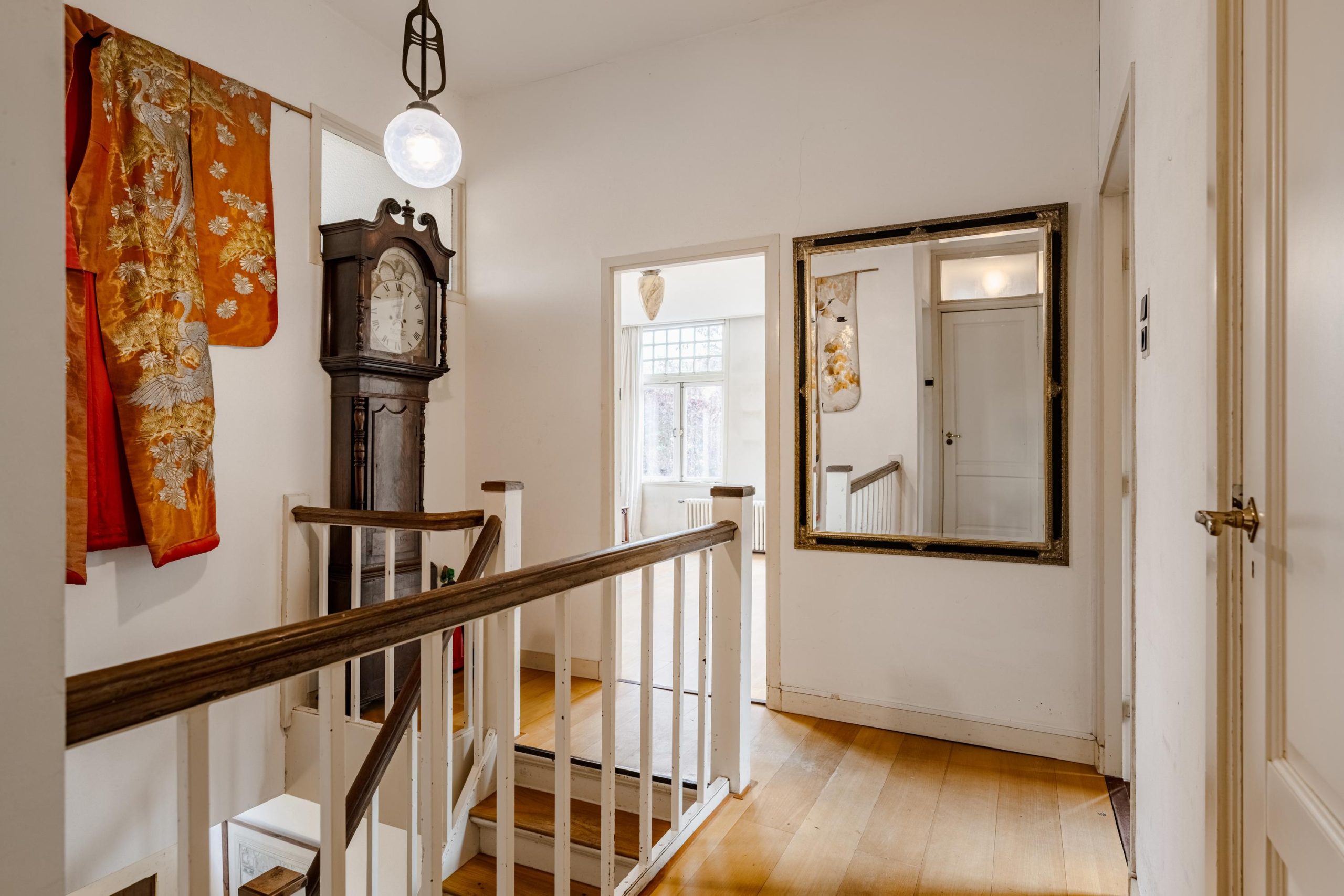 Ruime overloop met toegang tot vier slaapkamers en twee badkamers. Aan de voorzijde bevindt zich de ouderslaapkamer met houten kozijnen met dubbel glas én een eigen badkamer voorzien van ligbad en wastafel. Daarnaast een tweede slaapkamer met inbouwkasten. Aan de achterzijde nog twee ruime slaapkamers en een tweede badkamer met inloopdouche, toilet en wastafel.