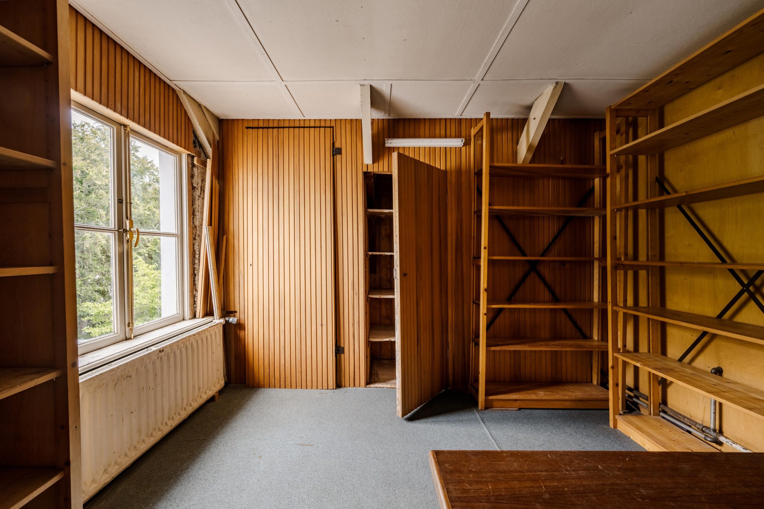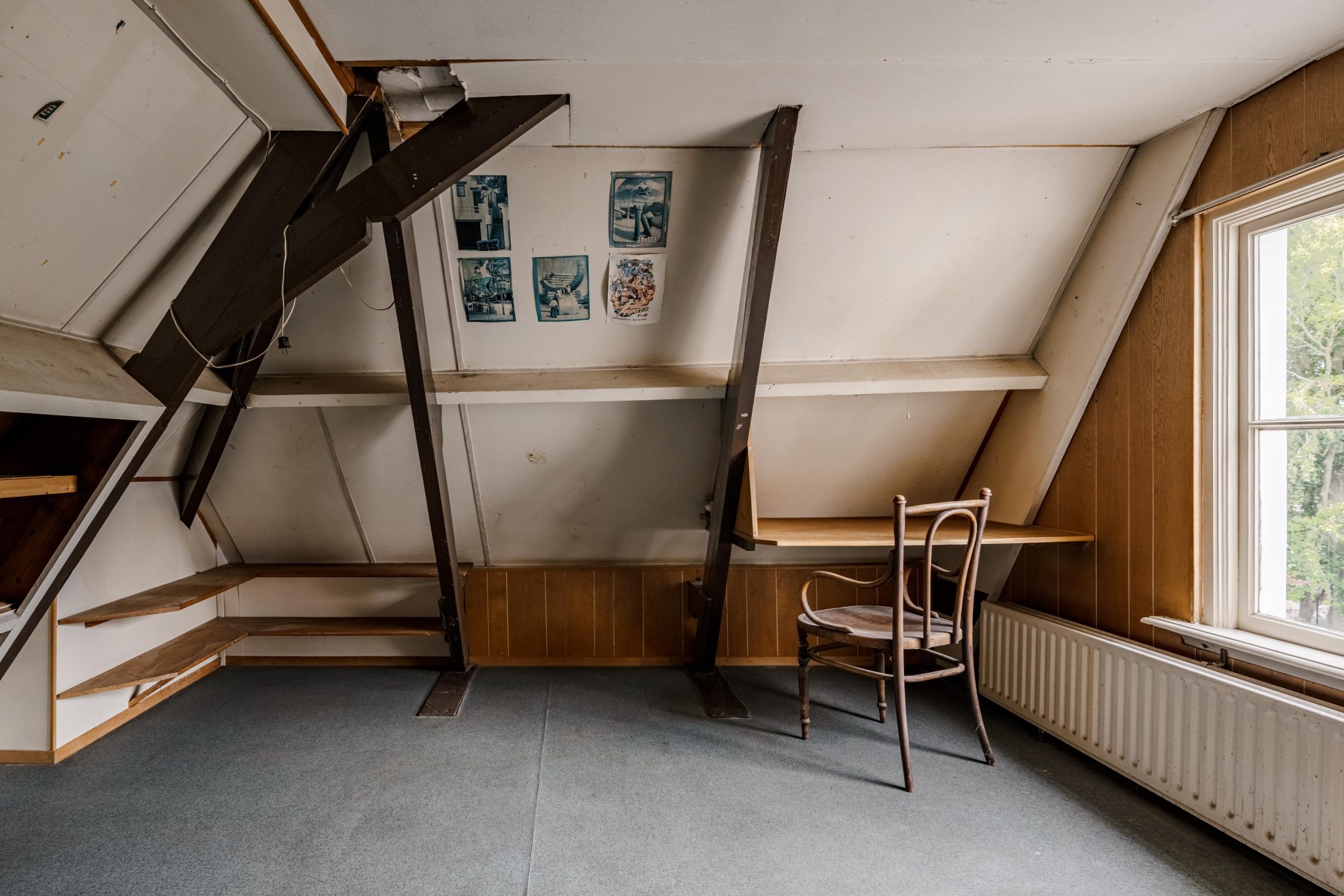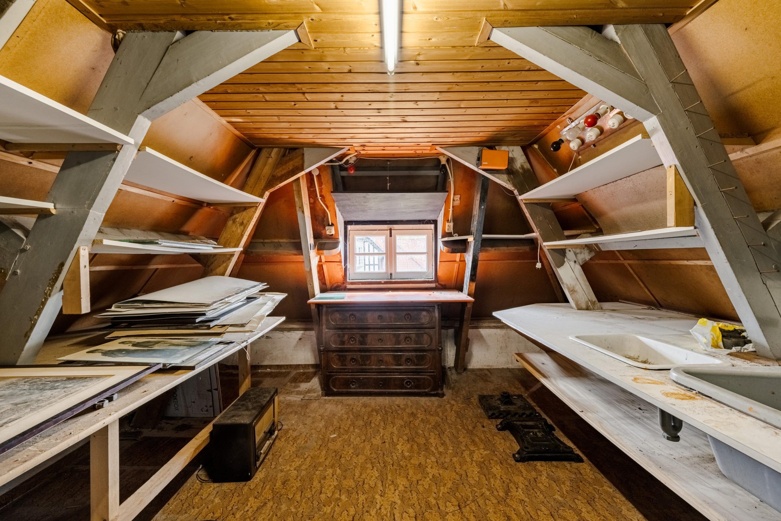 Op de zolderverdieping vinden we opnieuw een ruime overloop met veel inbouwkasten. Aan de voorzijde een sfeervolle slaapkamer met authentieke geiserinstallatie. Aan de achterzijde nog twee volwaardige slaapkamers, beide met karakteristieke daklijnen en veel kastruimte. Daarnaast is er nog voldoende ruimte om eventueel een derde badkamer te realiseren.