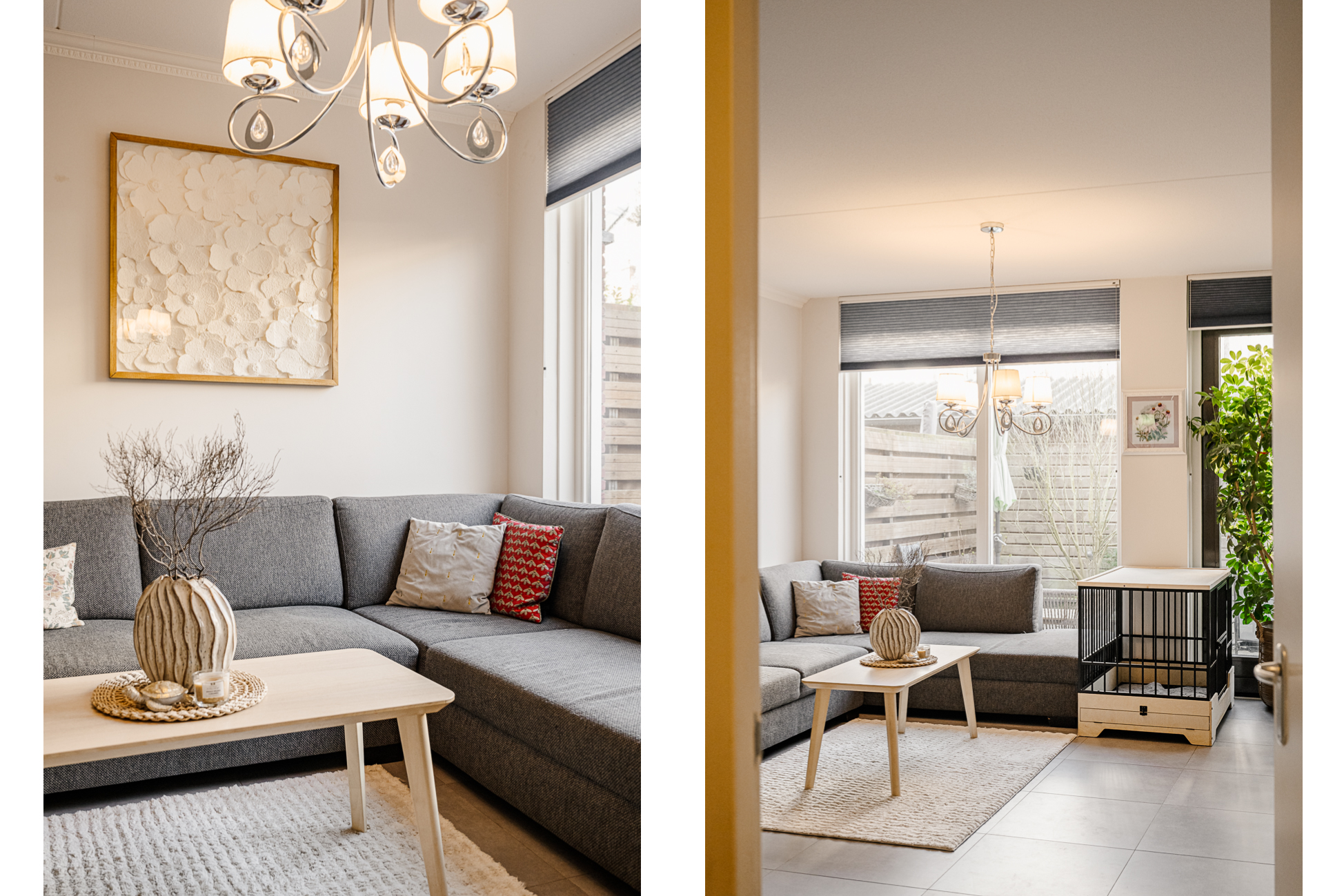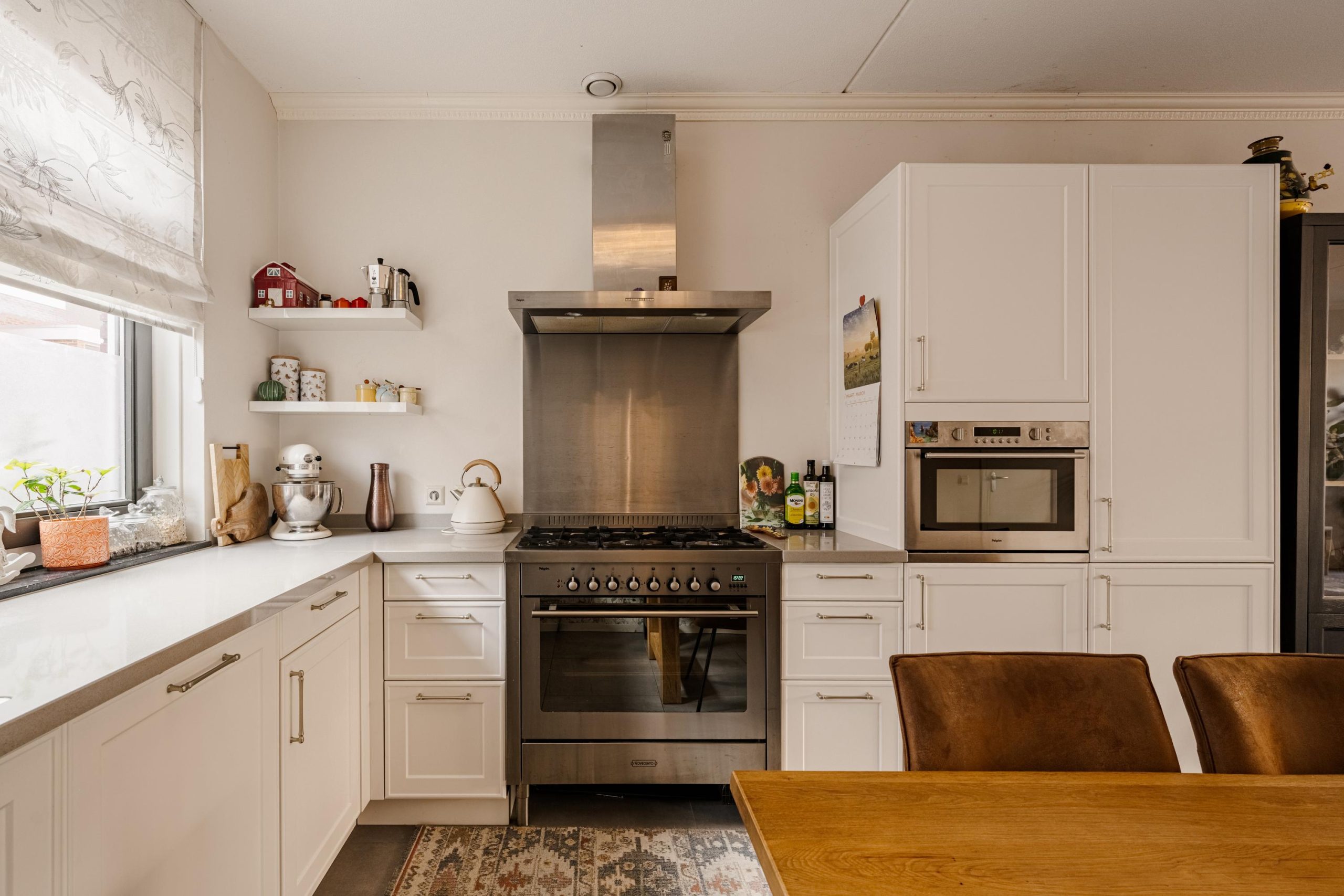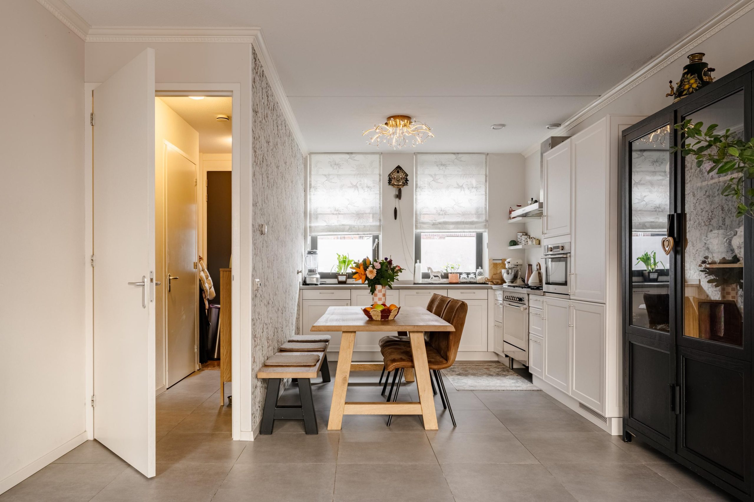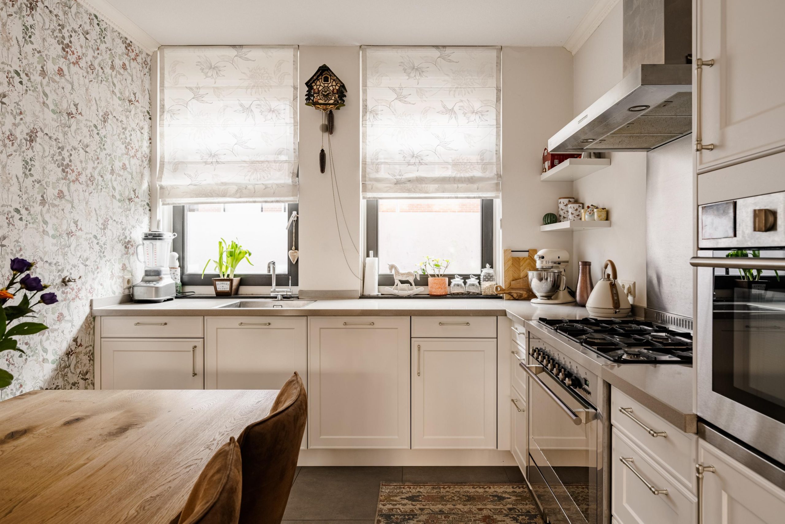 Bij binnenkomst betreed je de ruime entree met meterkast en een modern toilet met fontein. De lichte woonkamer is voorzien van een fraaie keramische tegelvloer, een praktische trapkast en een moderne keuken in hoekopstelling. De keuken is uitgerust met hoogwaardige inbouwapparatuur, waaronder een groot zes-pits gasfornuis met oven en afzuigkap, een combimagnetron een vaatwasser en koel/vriescombinatie. De gehele begane grond is voorzien van comfortabele vloerverwarming. Via openslaande deuren kom je in de fraai aangelegde achtertuin met een ruime houten berging en een achterom naar het afgesloten achterpad.