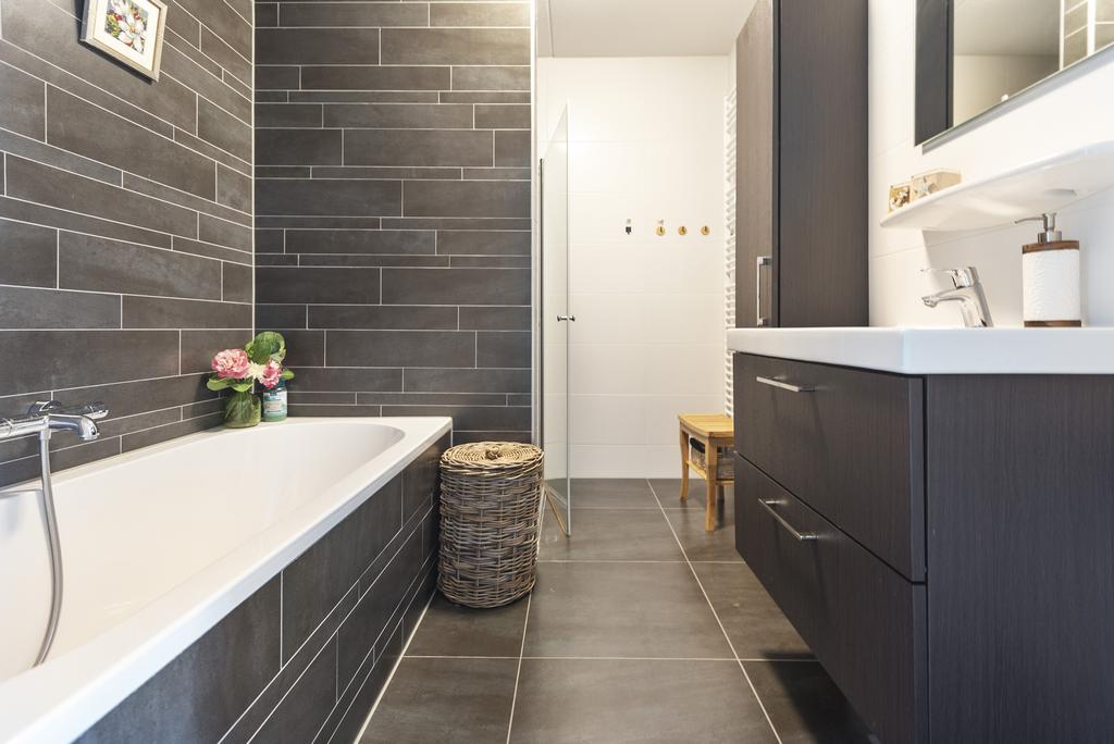De trap leidt naar een ruime overloop op de eerste verdieping, waar je een separaat vrij hangend toilet vindt en een hoek die ideaal is voor een grote linnenkast. Aan de achterzijde bevindt zich de hoofdslaapkamer, die de volledige breedte van de woning beslaat en is voorzien van een Frans balkon met openslaande deuren. De moderne badkamer heeft een groot ligbad, inloopdouche en een wastafelmeubel. Aan de voorzijde bevindt zich de tweede ruime en strak afgewerkte slaapkamer.