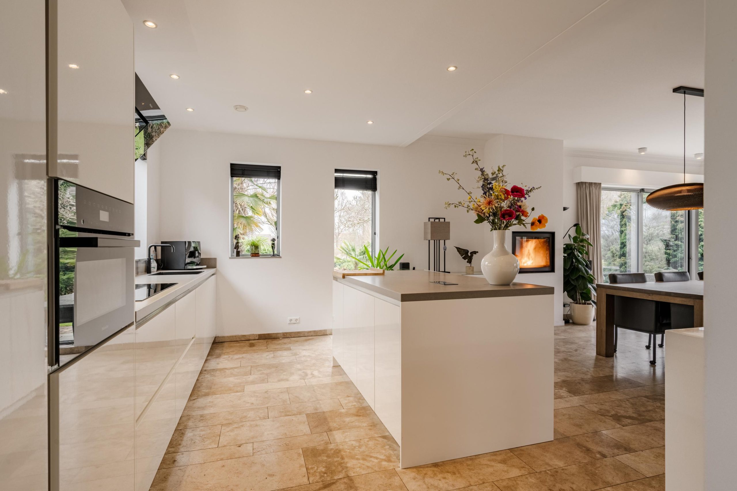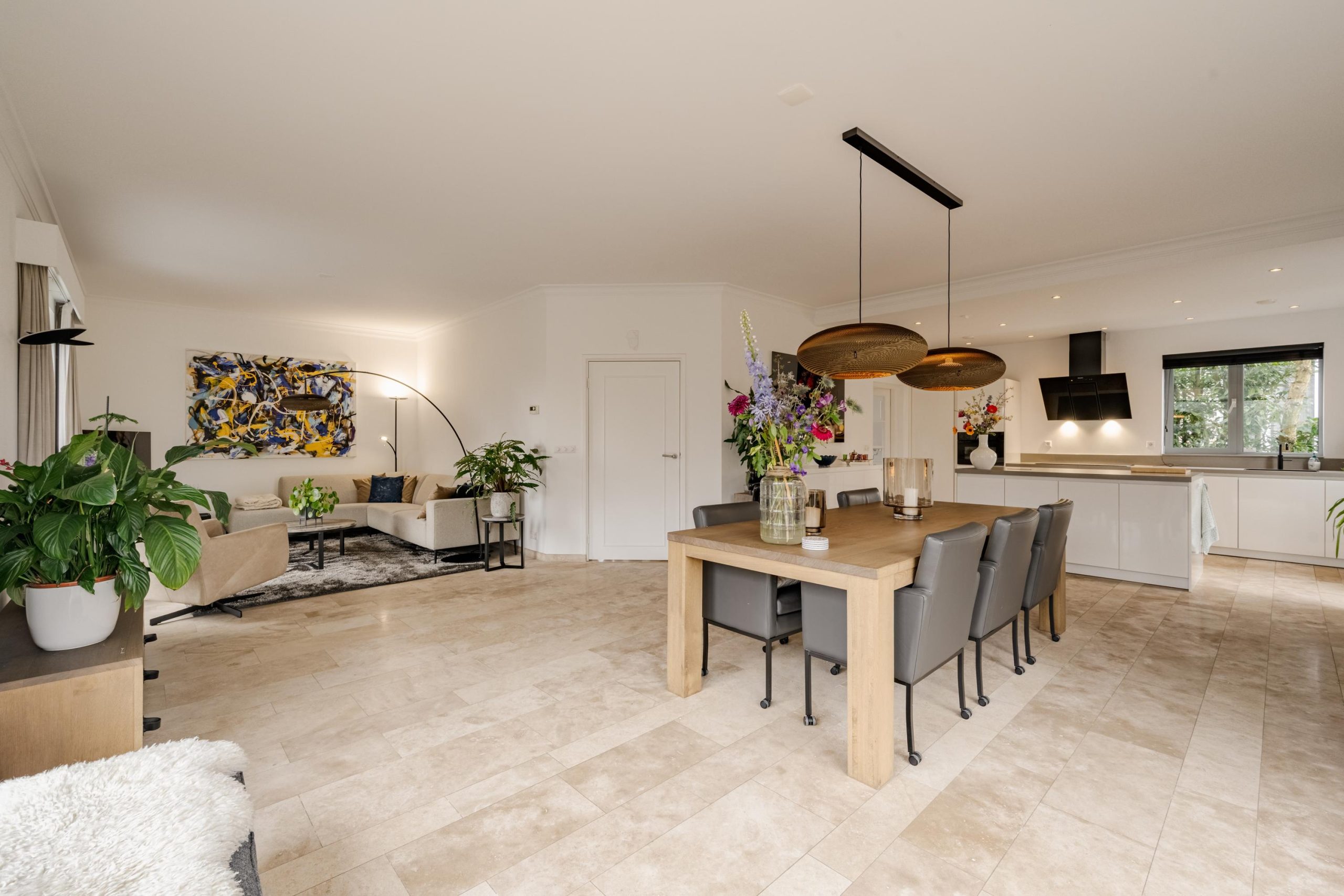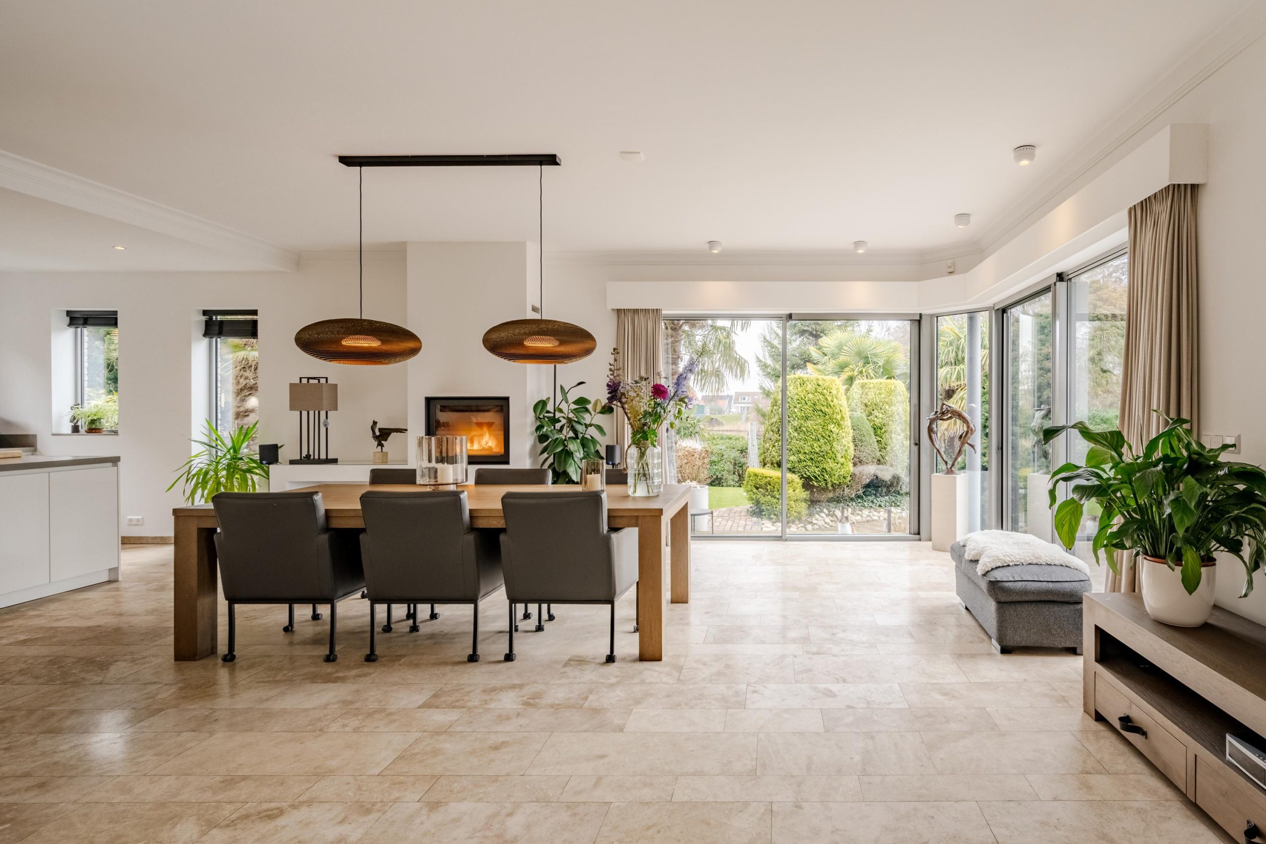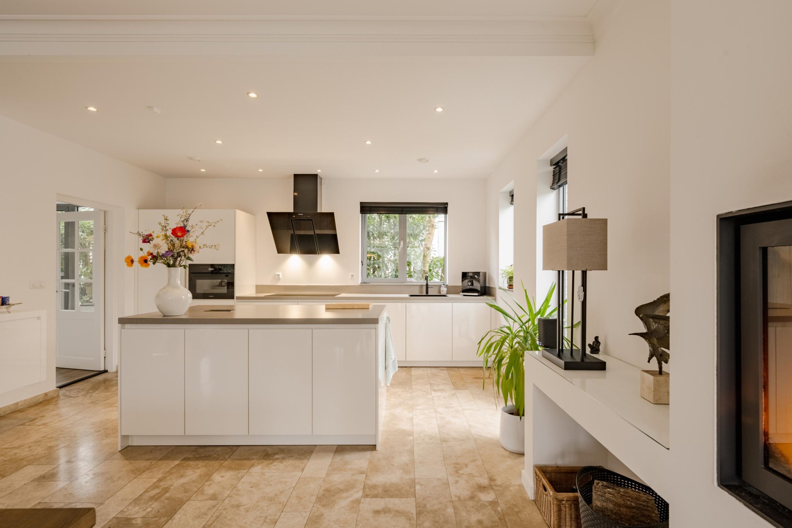 De begane grond ademt comfort. Vloerverwarming onder een in 2021 professioneel geschuurde, gereinigde en geïmpregneerde travertin vloer zorgt voor een warme en stijlvolle basis.
