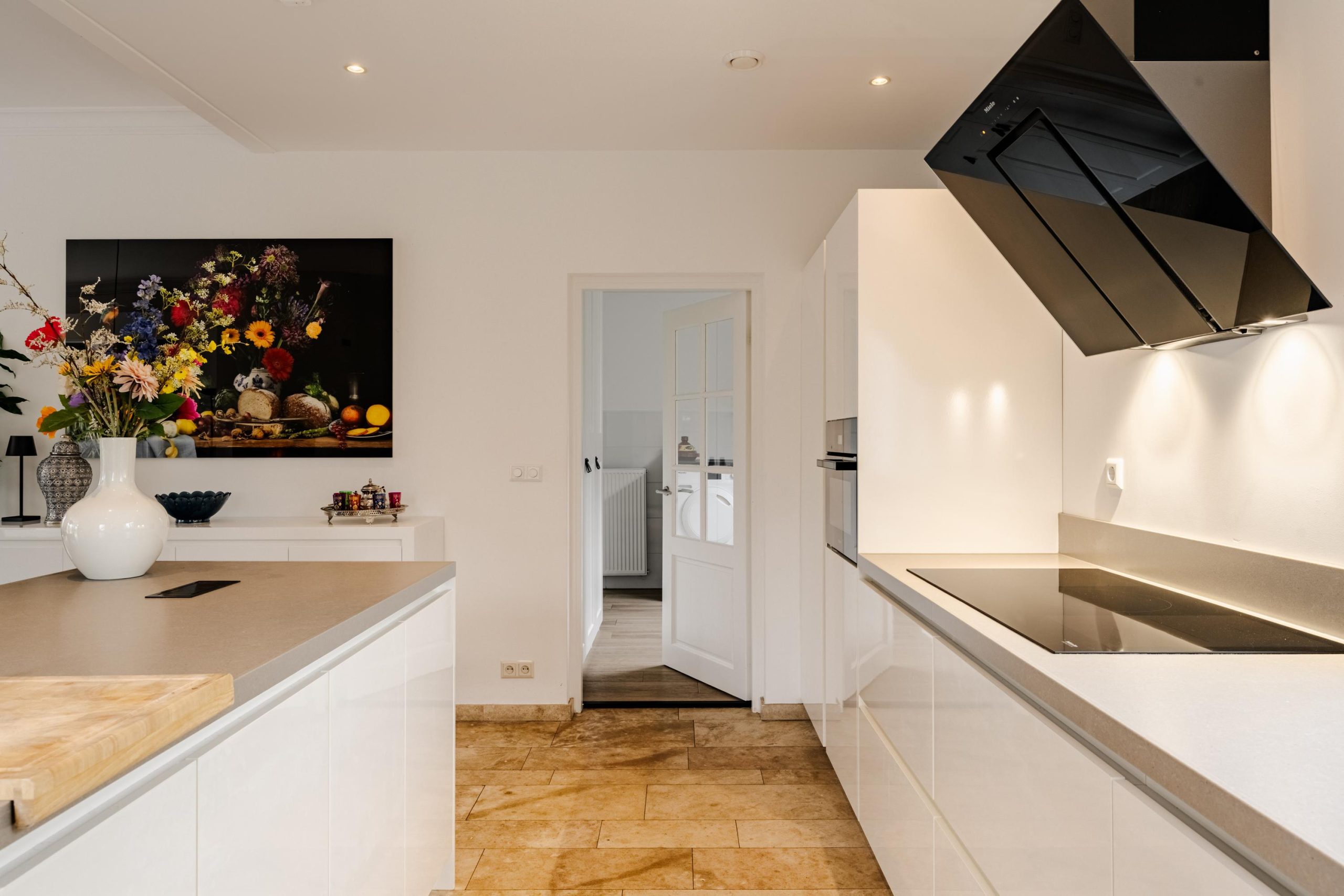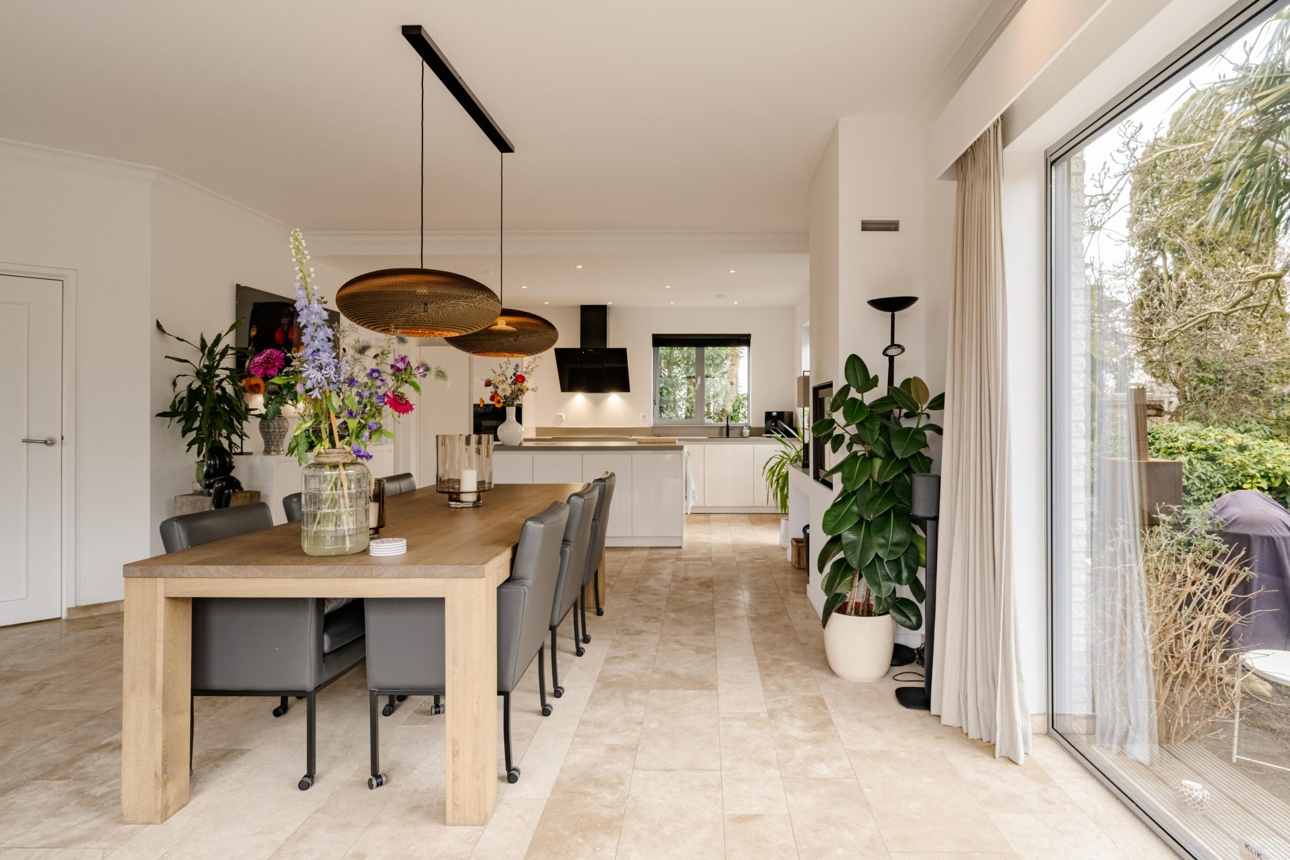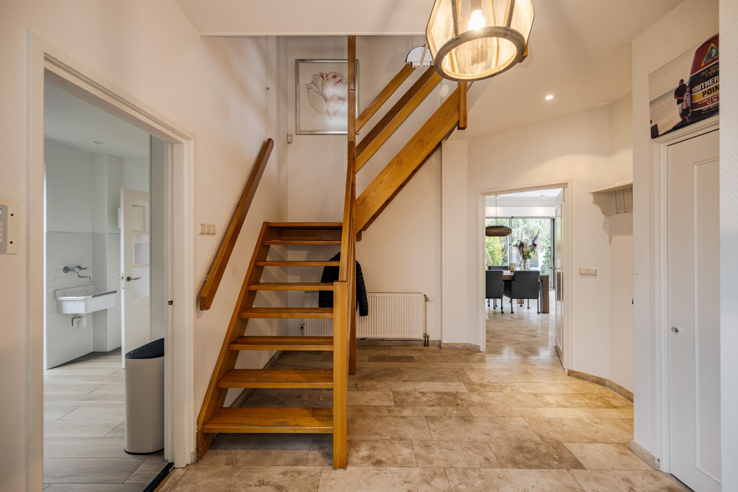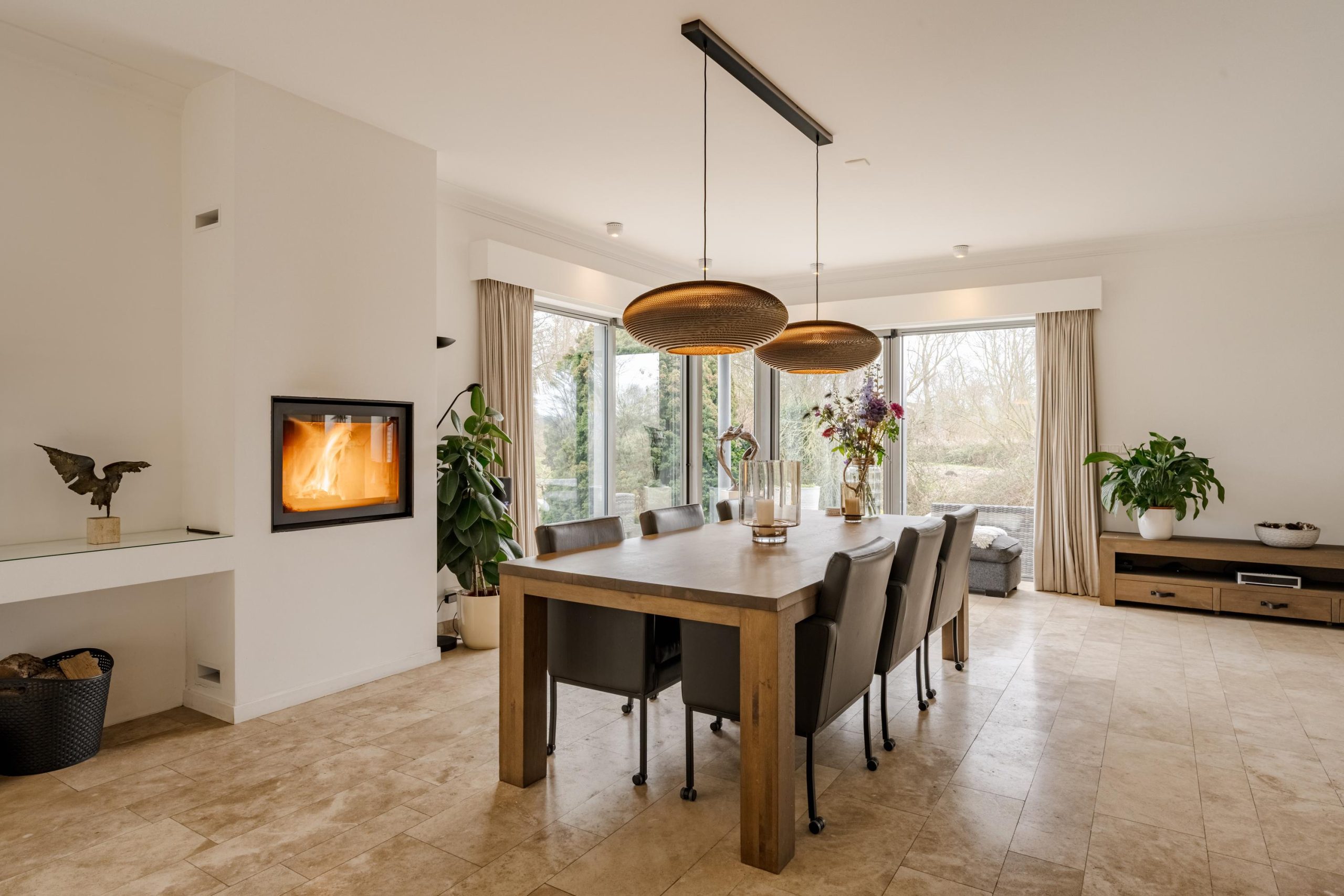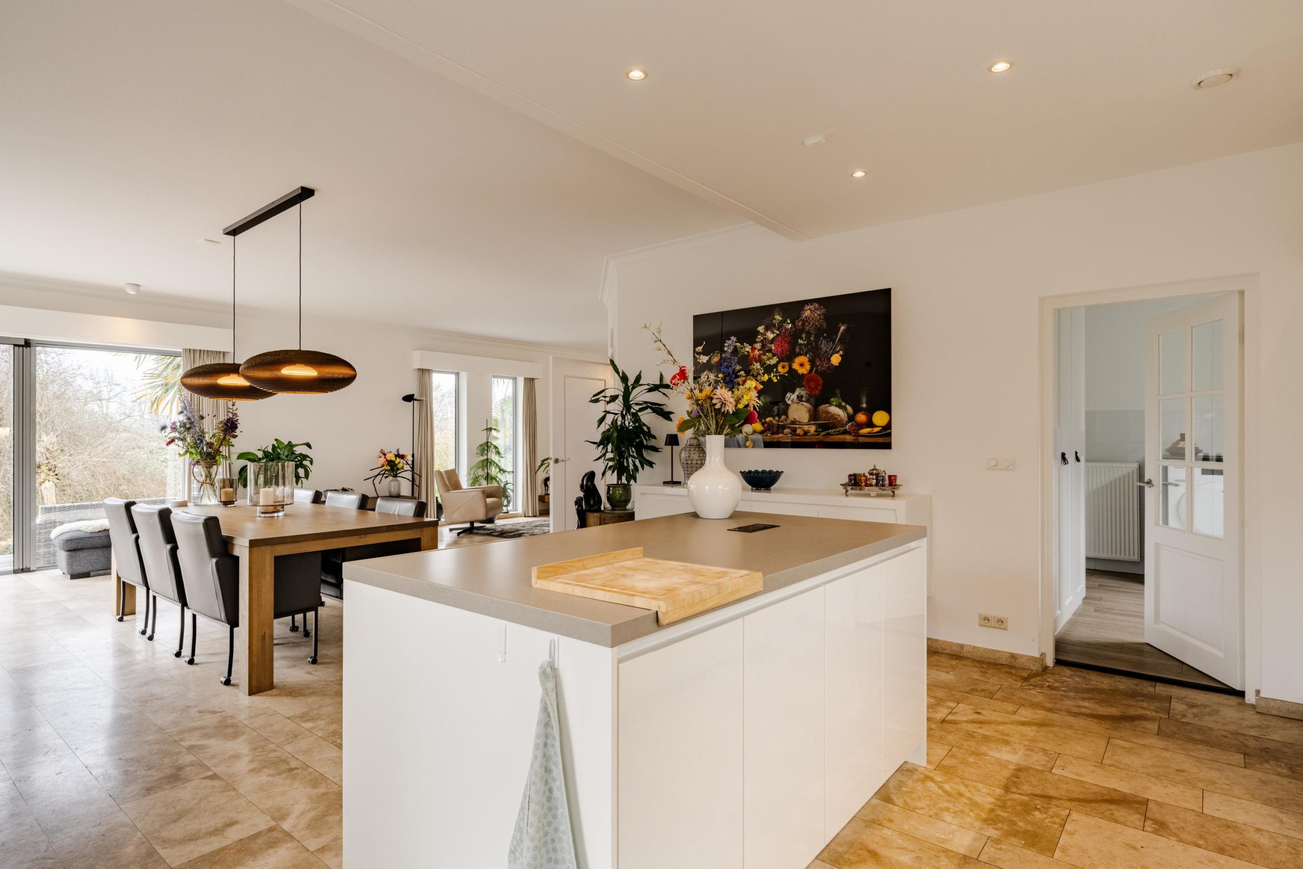 De begane grond ademt comfort. Vloerverwarming onder een in 2021 professioneel geschuurde, gereinigde en geïmpregneerde travertin vloer zorgt voor een warme en stijlvolle basis.