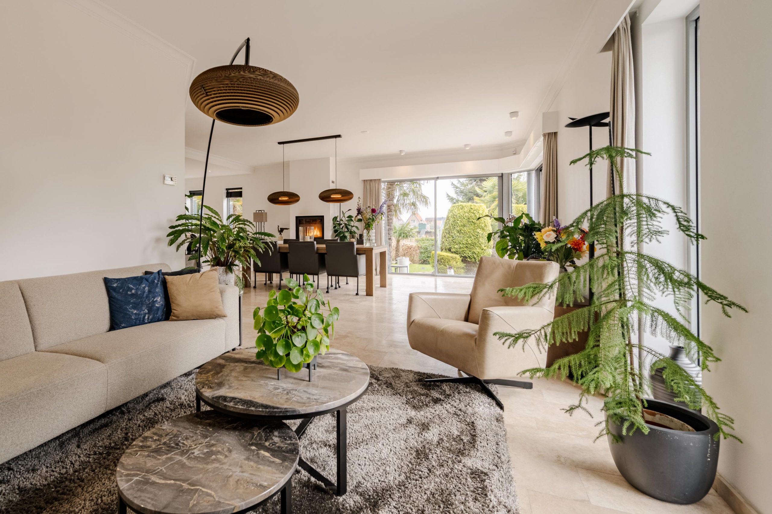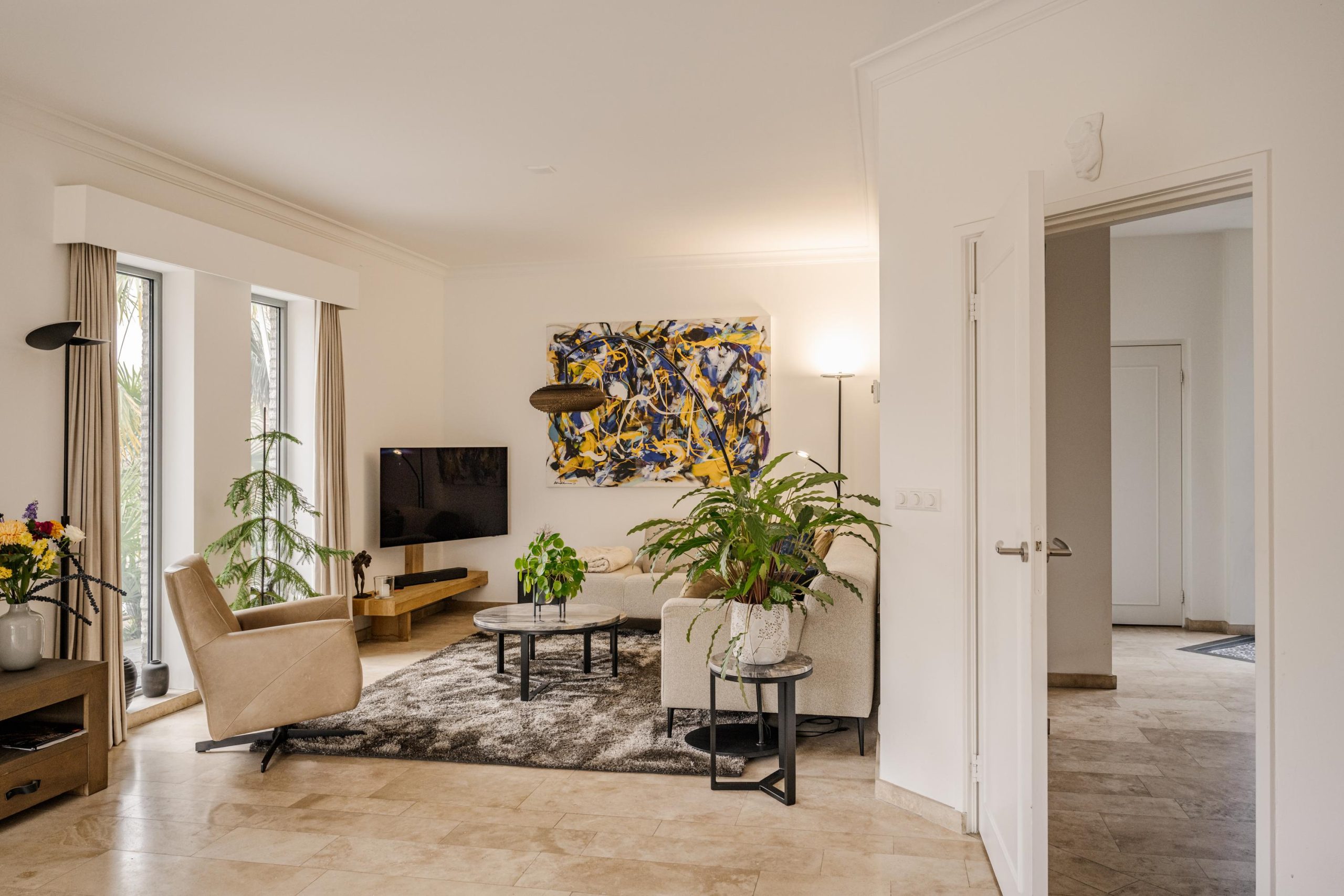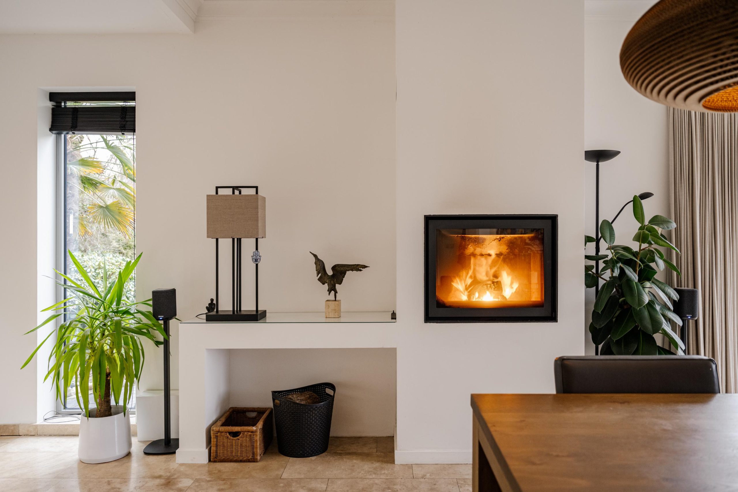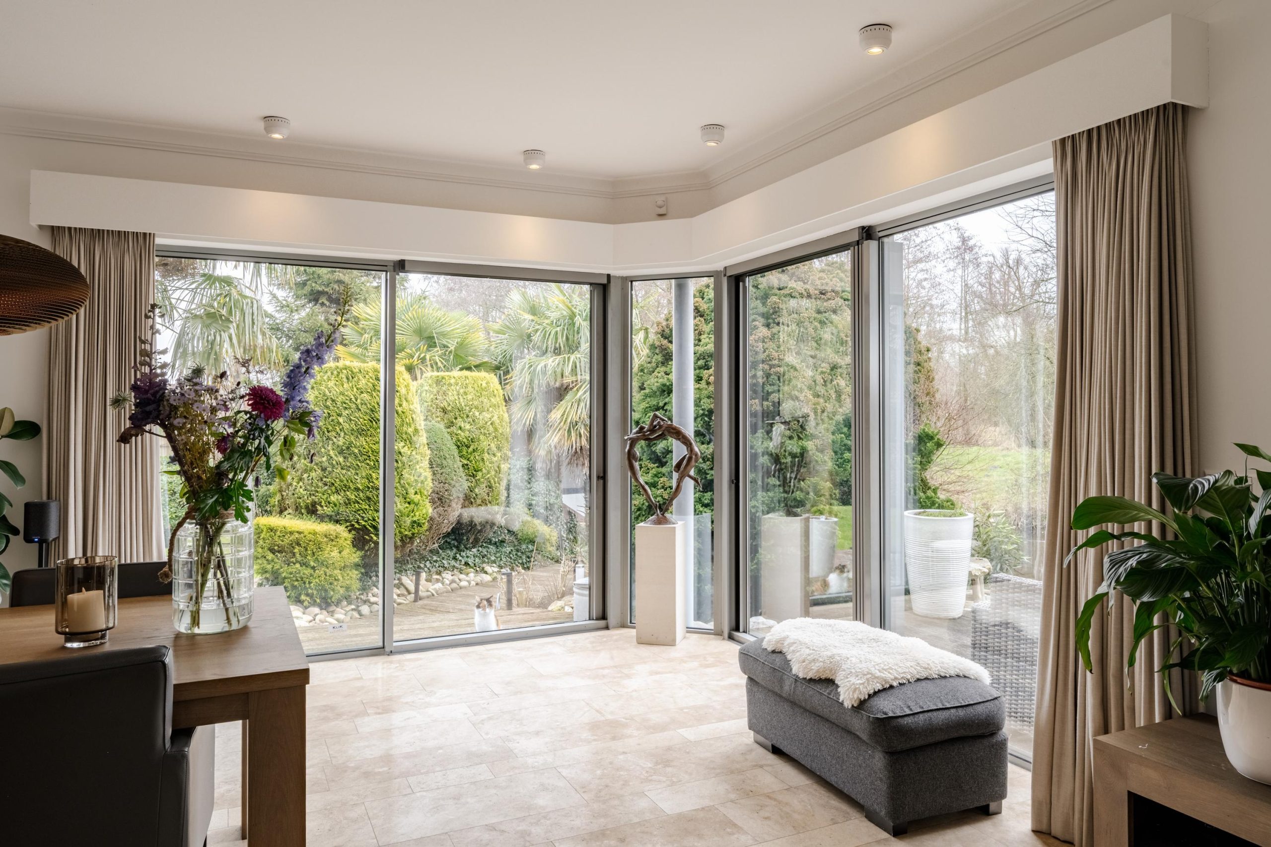 De begane grond ademt comfort. Vloerverwarming onder een in 2021 professioneel geschuurde, gereinigde en geïmpregneerde travertin vloer zorgt voor een warme en stijlvolle basis.