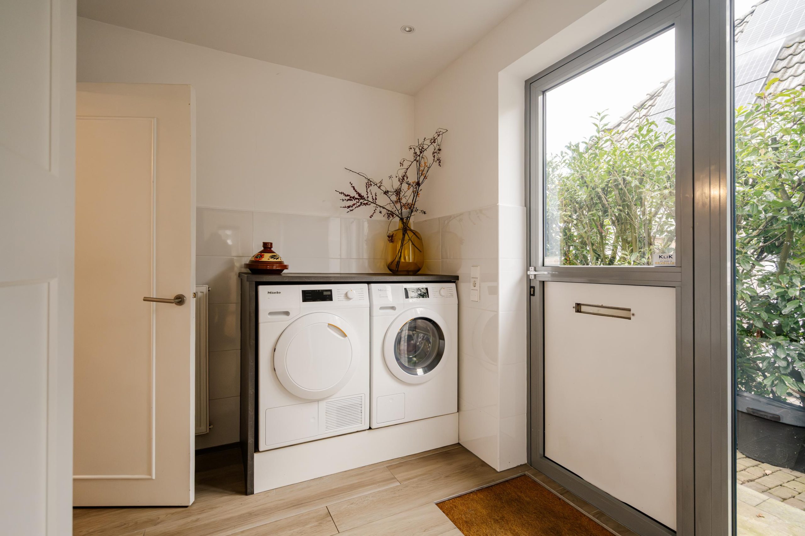 De bijkeuken is in 2022 gemoderniseerd en praktisch ingericht met maatwerkkasten, wasvoorzieningen en een wasbak. Een directe deur naar buiten en een elektrisch bedienbaar rolluik zorgen voor extra comfort en veiligheid.
