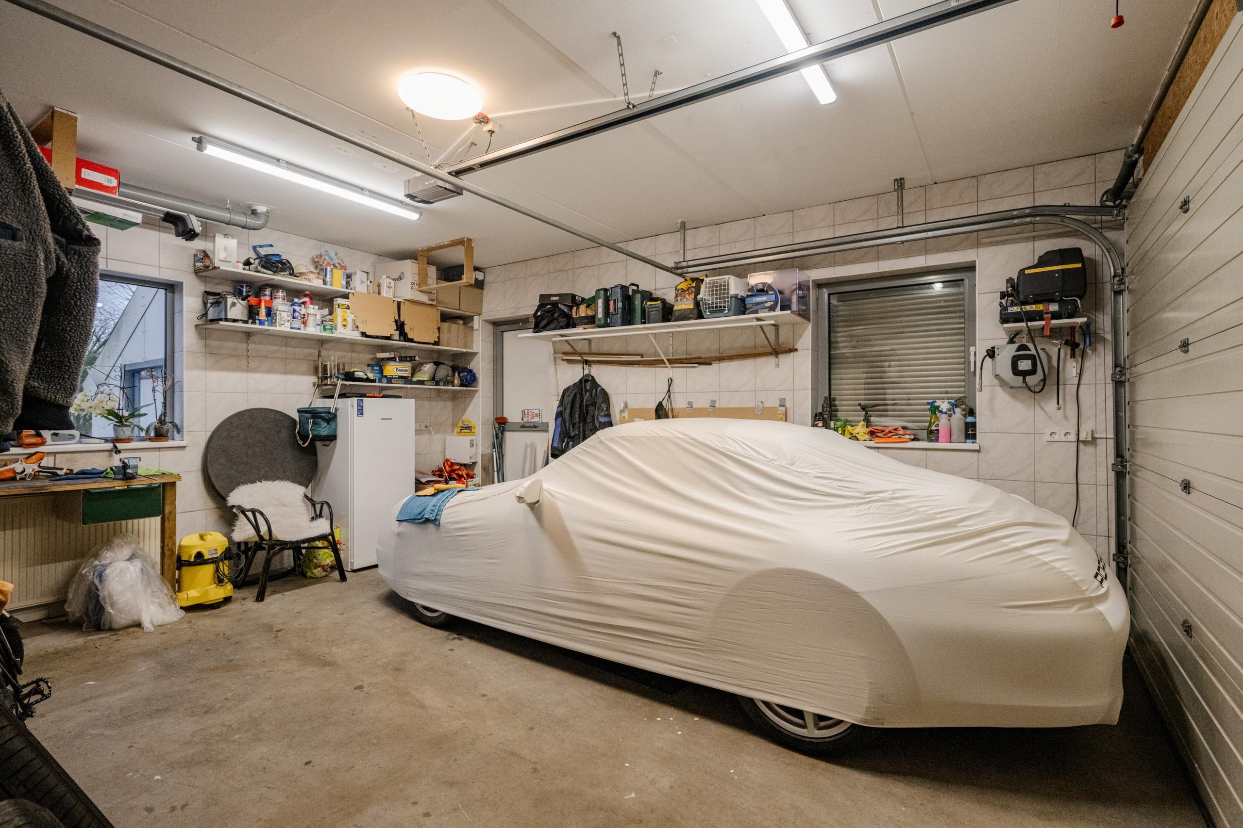 De geïsoleerde garage biedt plaats aan twee auto’s en is voorzien van verwarming, een elektrische garagedeur, een aparte buitendeur en rolluiken. Ideaal voor autoliefhebbers, hobbyisten of extra opslag.