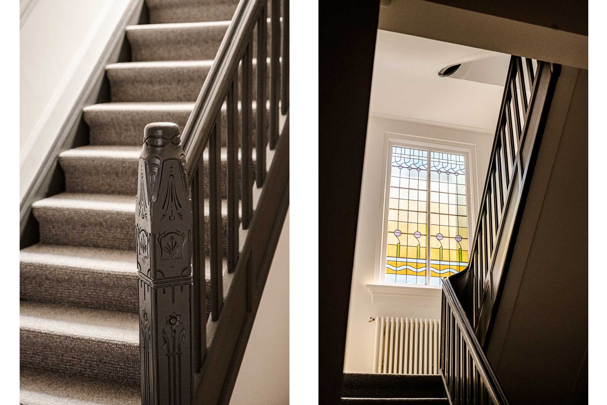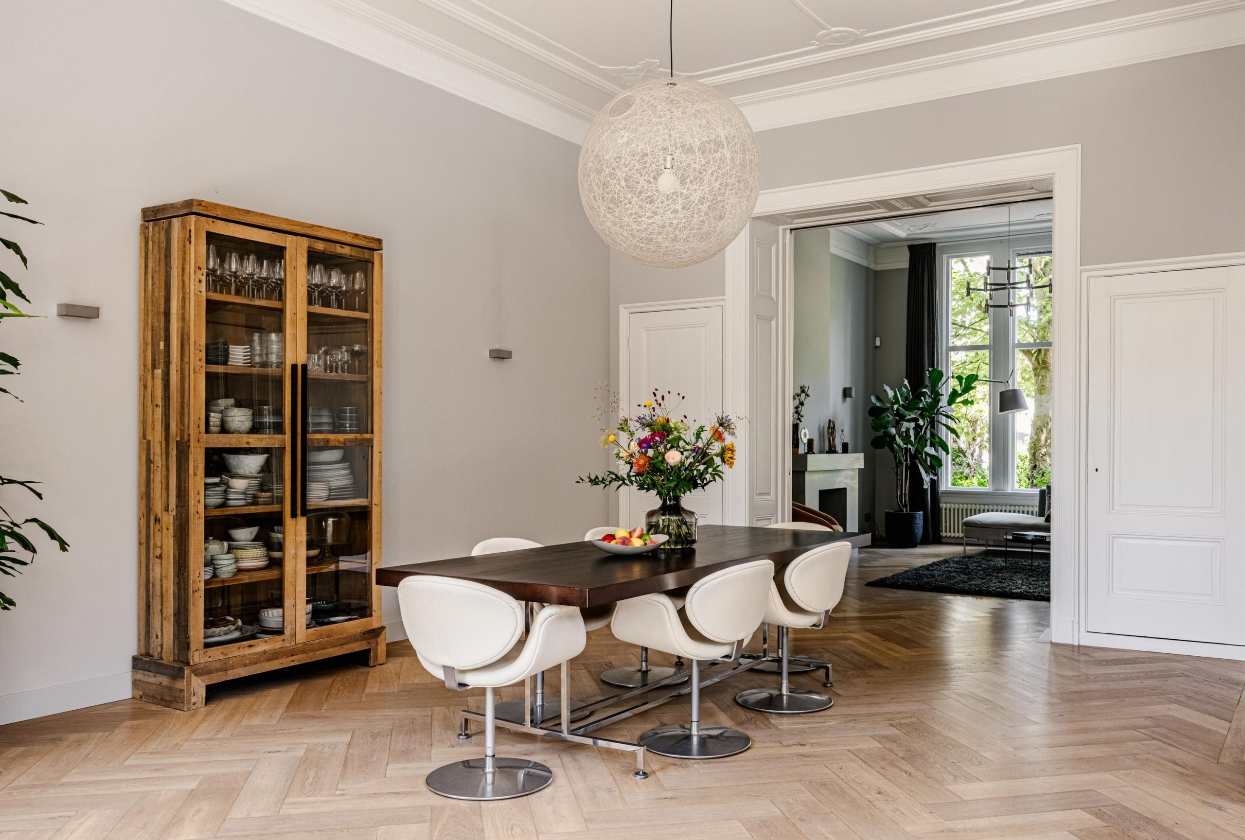 Je komt binnen in een ruime entree. Via een prachtige tochtdeur en de marmeren vloeren stap je de royale hal in, waar je meteen de indrukwekkende plafondhoogte (3,60 m) en ornamenten opmerkt. Aan de voorzijde liggen de woonkamer en een aparte t.v.-kamer, gescheiden maar verbonden in sfeer, beide voorzien van grote raampartijen en veel lichtinval. De eetkamer aan de achterzijde is ruim, licht en vormt samen met de open keuken het hart van het huis. De moderne keuken met kook-/spoeleiland is perfect voor kookliefhebbers en gezelschappen. De glazen achterwand over de hele breedte van het huis, met ingebouwde open haard, maakt van deze ruimte echt iets bijzonders. Dubbele openslaande deuren geven toegang tot de fraai aangelegde achtertuin op het zuiden, een groene oase van rust in de stad. Via de keuken kom je in de luxe en uitgebreide wijn-inloopkast.