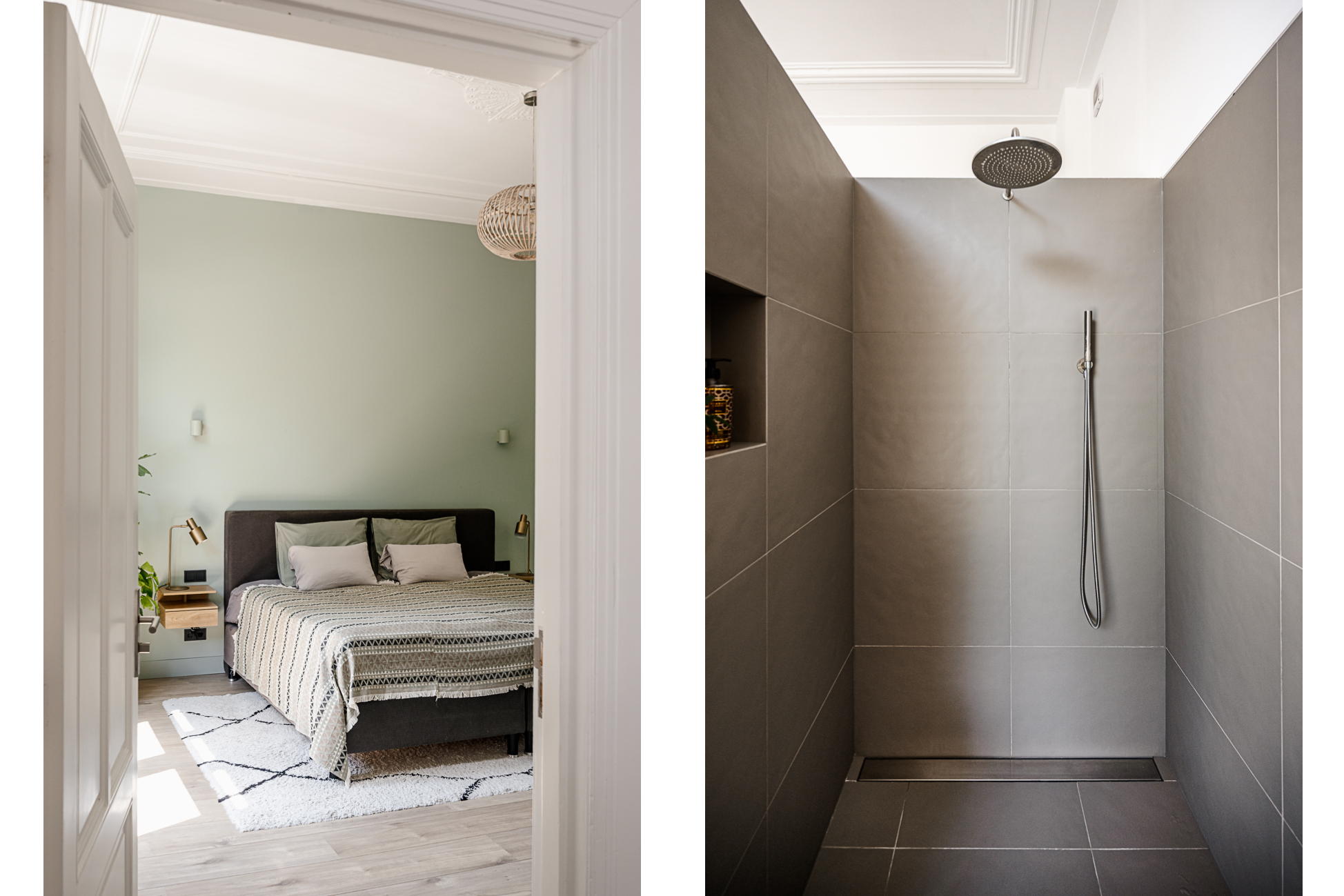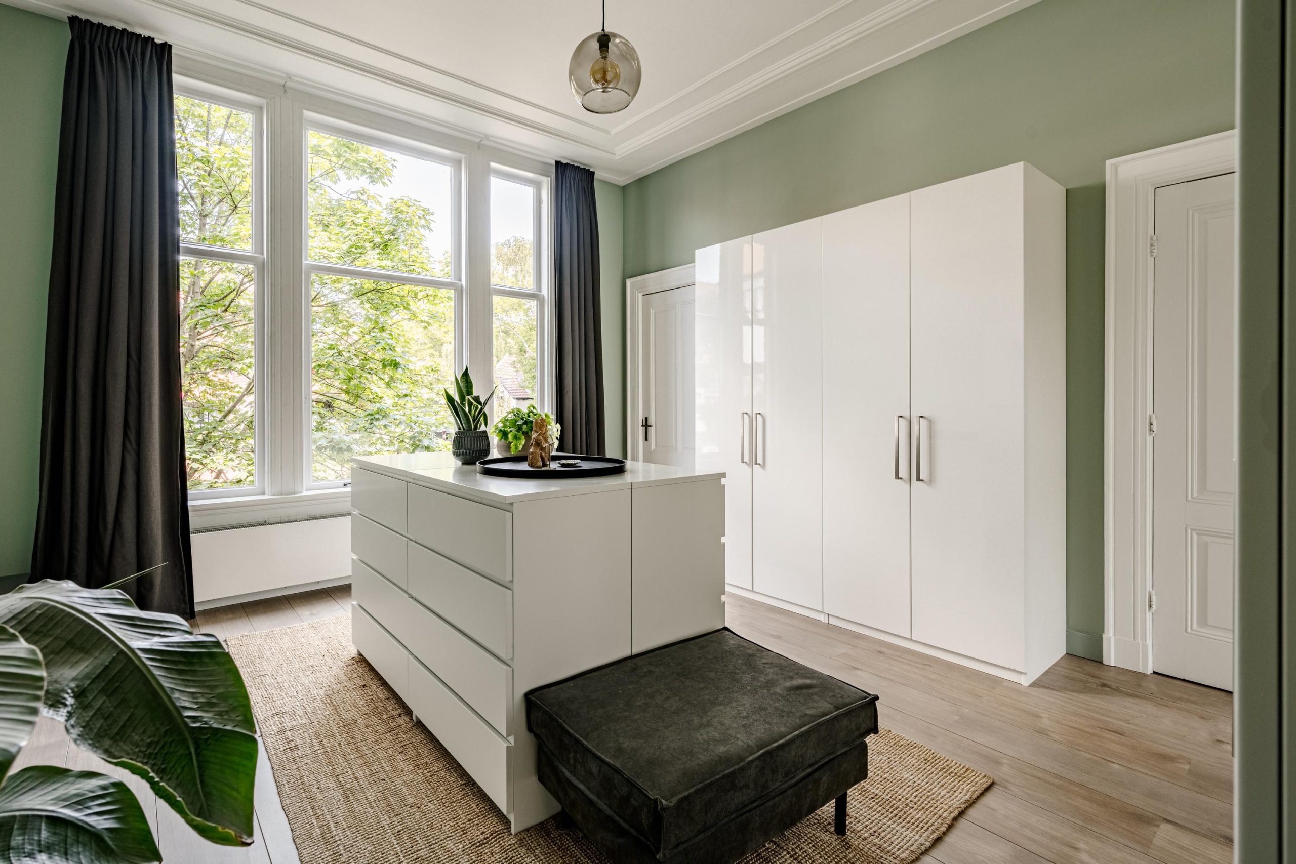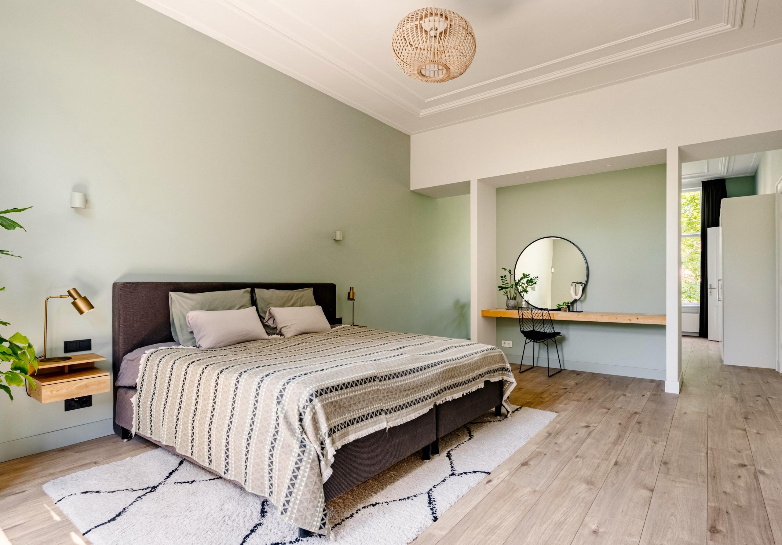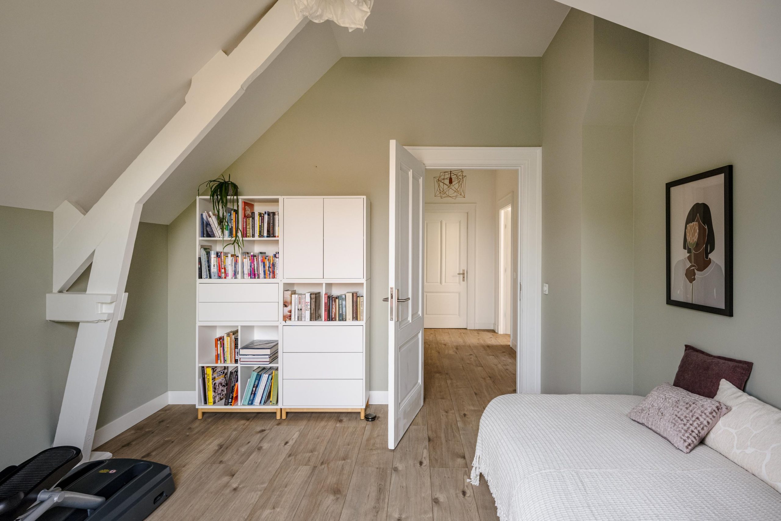 Op deze verdieping bevinden zich twee ruime kamers aan de voorzijde, momenteel in gebruik als werkkamer en kledingkamer. Aan de achterzijde ligt de riante master bedroom met een plafondhoogte van maar liefst 3,40 meter. Deze slaapkamer beschikt over dubbele openslaande deuren richting het dakterras en grenst direct aan een luxe badkamer met ligbad, ruime inloopdouche, toilet en stijlvol wastafelmeubel. Daarnaast is er op deze verdieping een bergruimte.