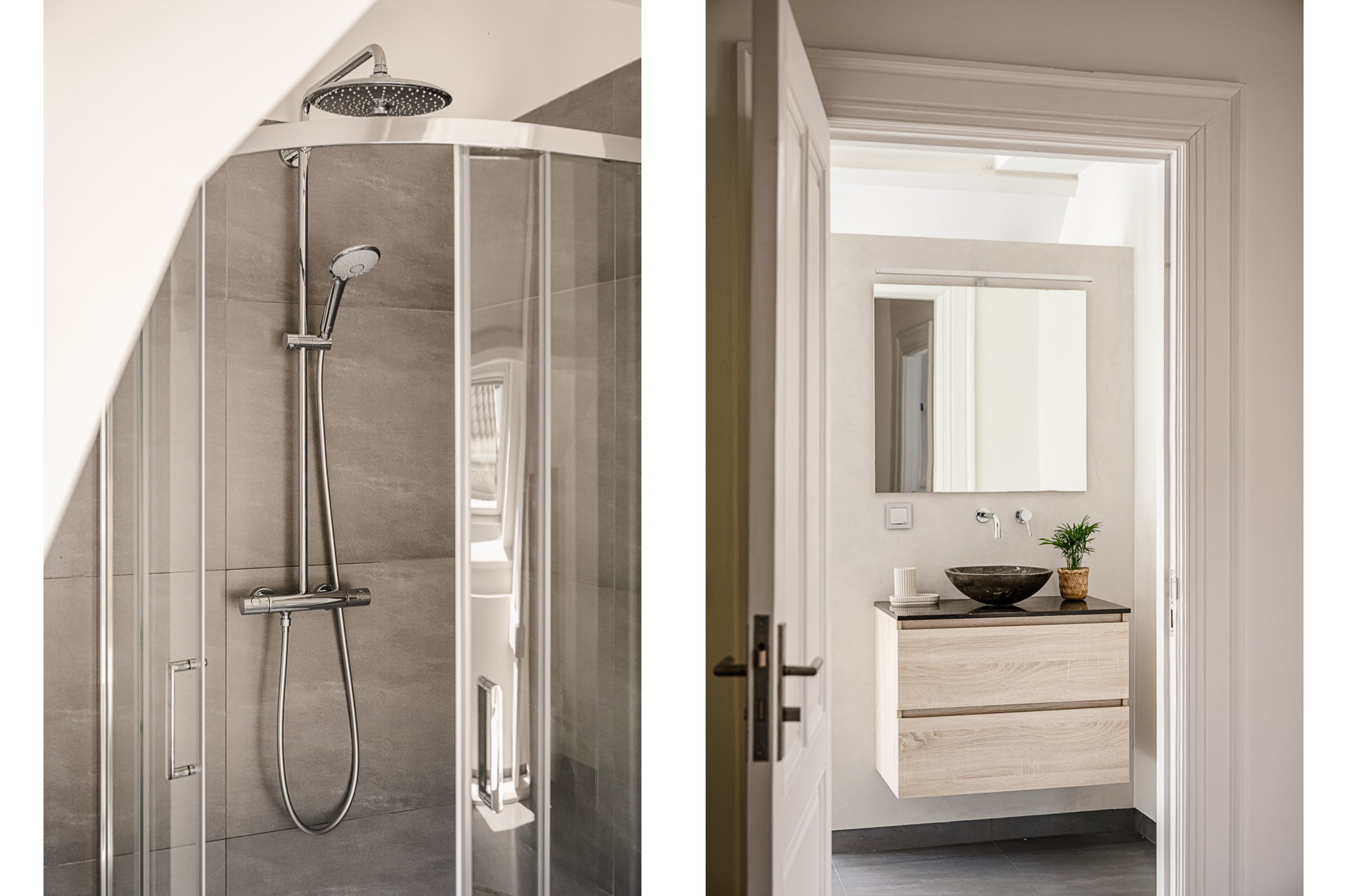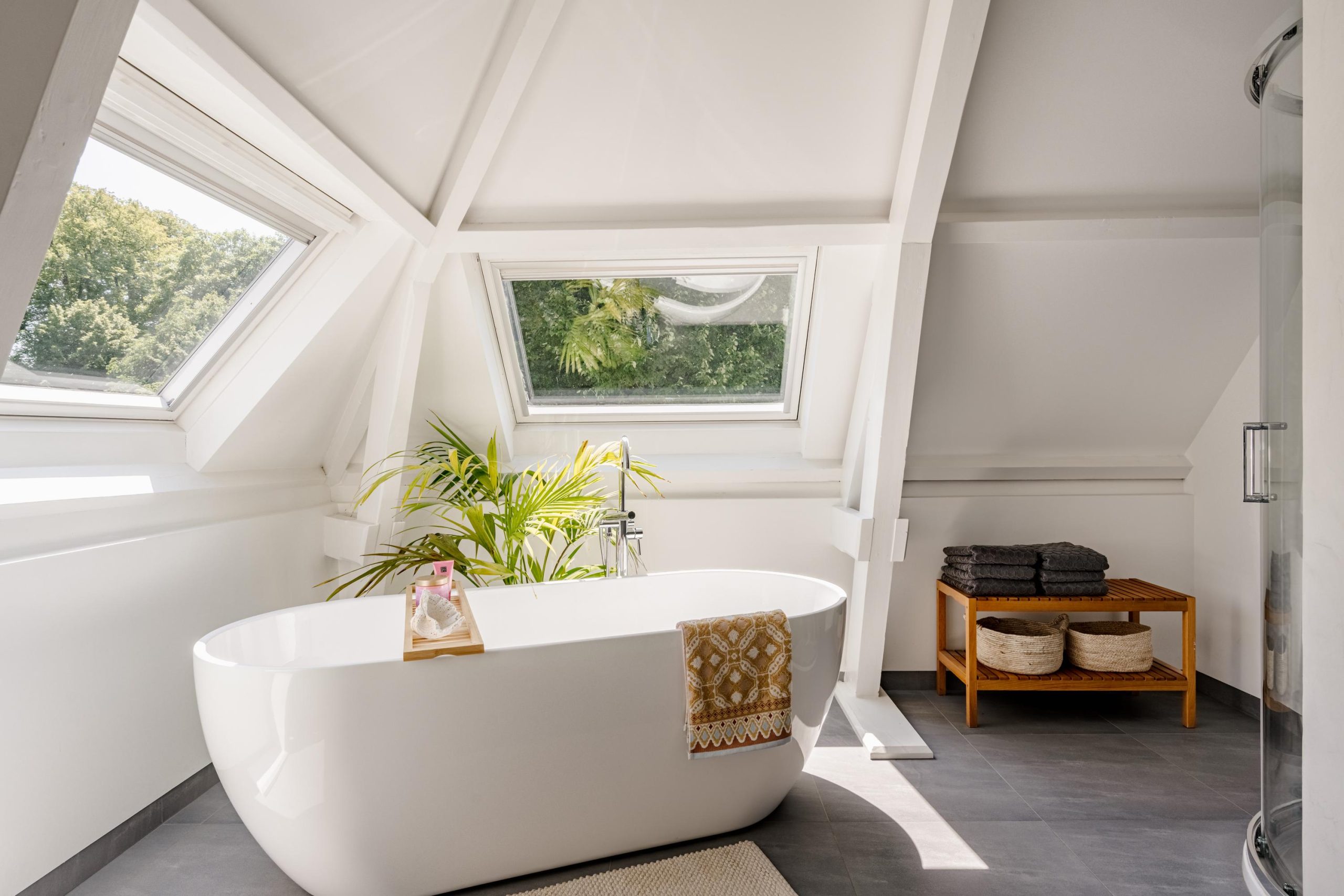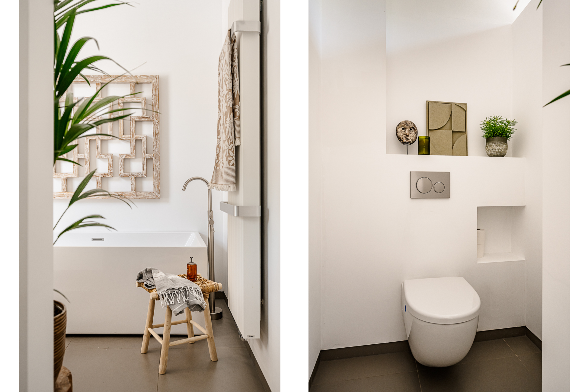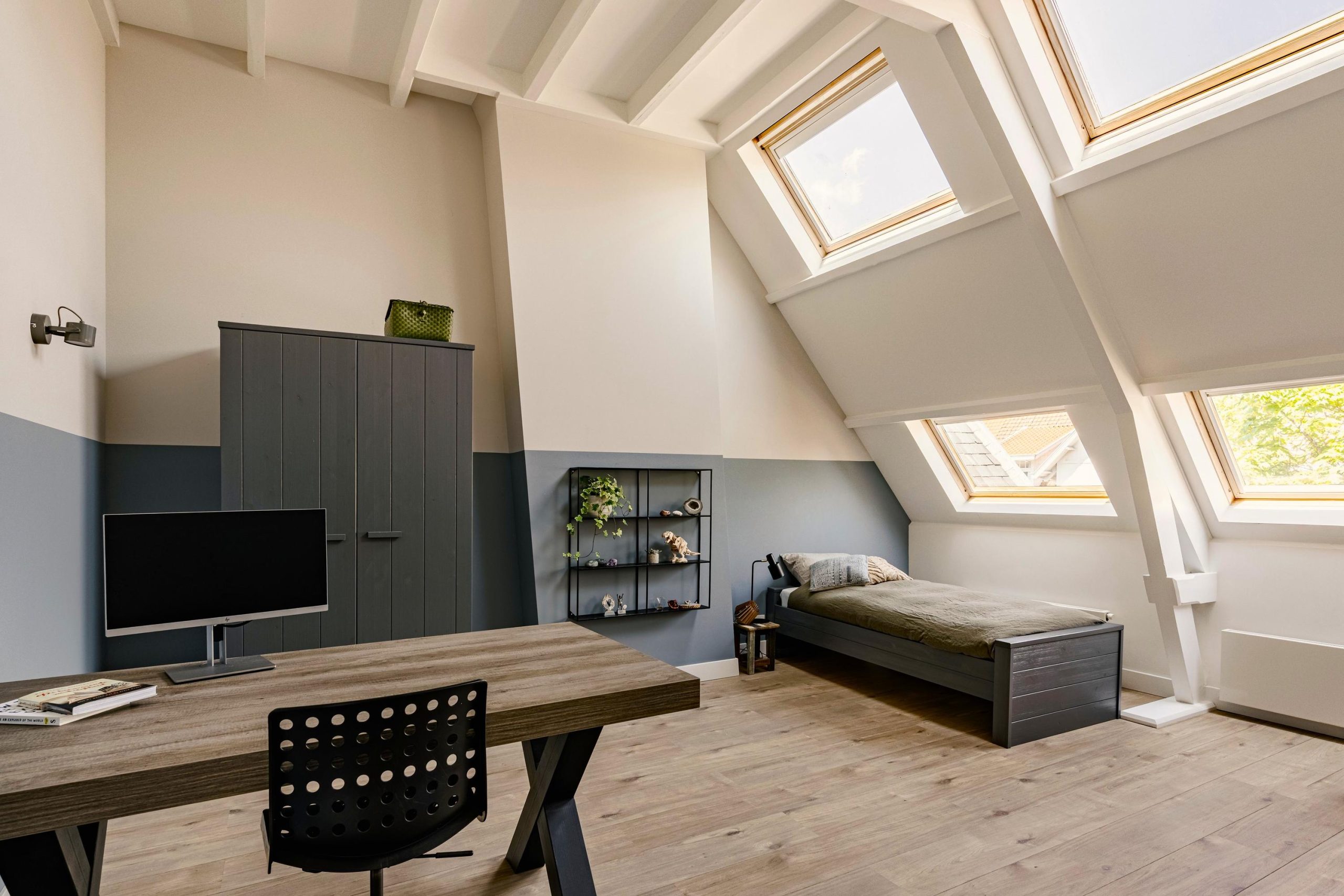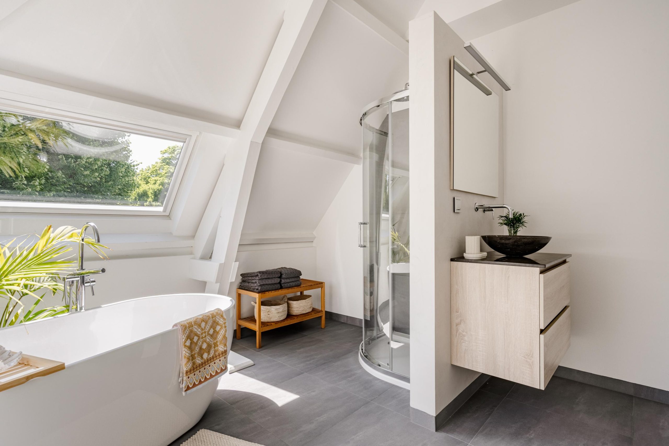 Ook hier is de ruimte optimaal benut. Drie ruime slaapkamers, waaronder een tweede master met eigen inloopkast. De moderne tweede badkamer is voorzien van een vrijstaand ligbad, inloopdouche, wastafel en toilet. Ook is er een aparte wasruimte met opstelling voor wasmachine en droger, en een aparte C.V.-ruimte.
