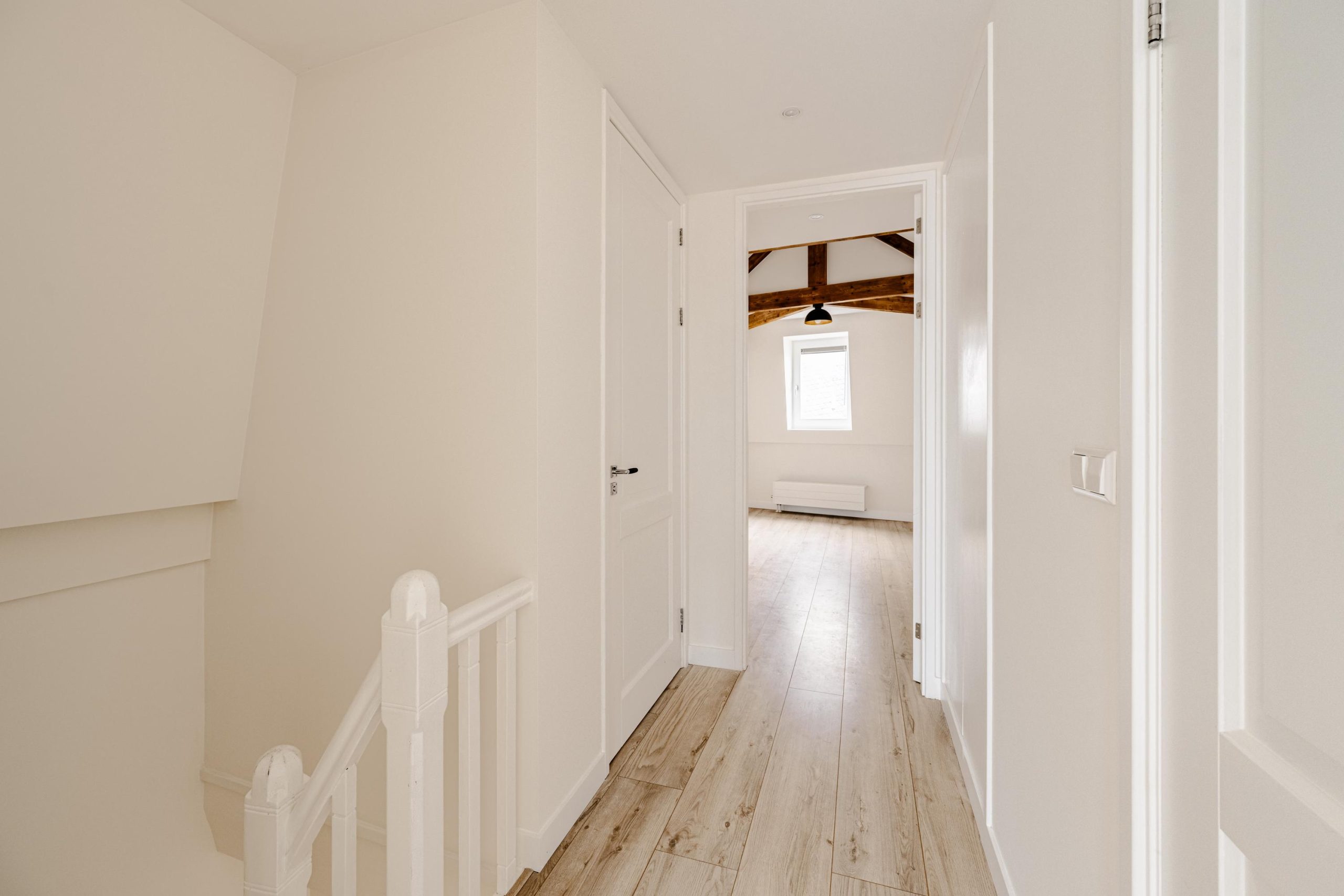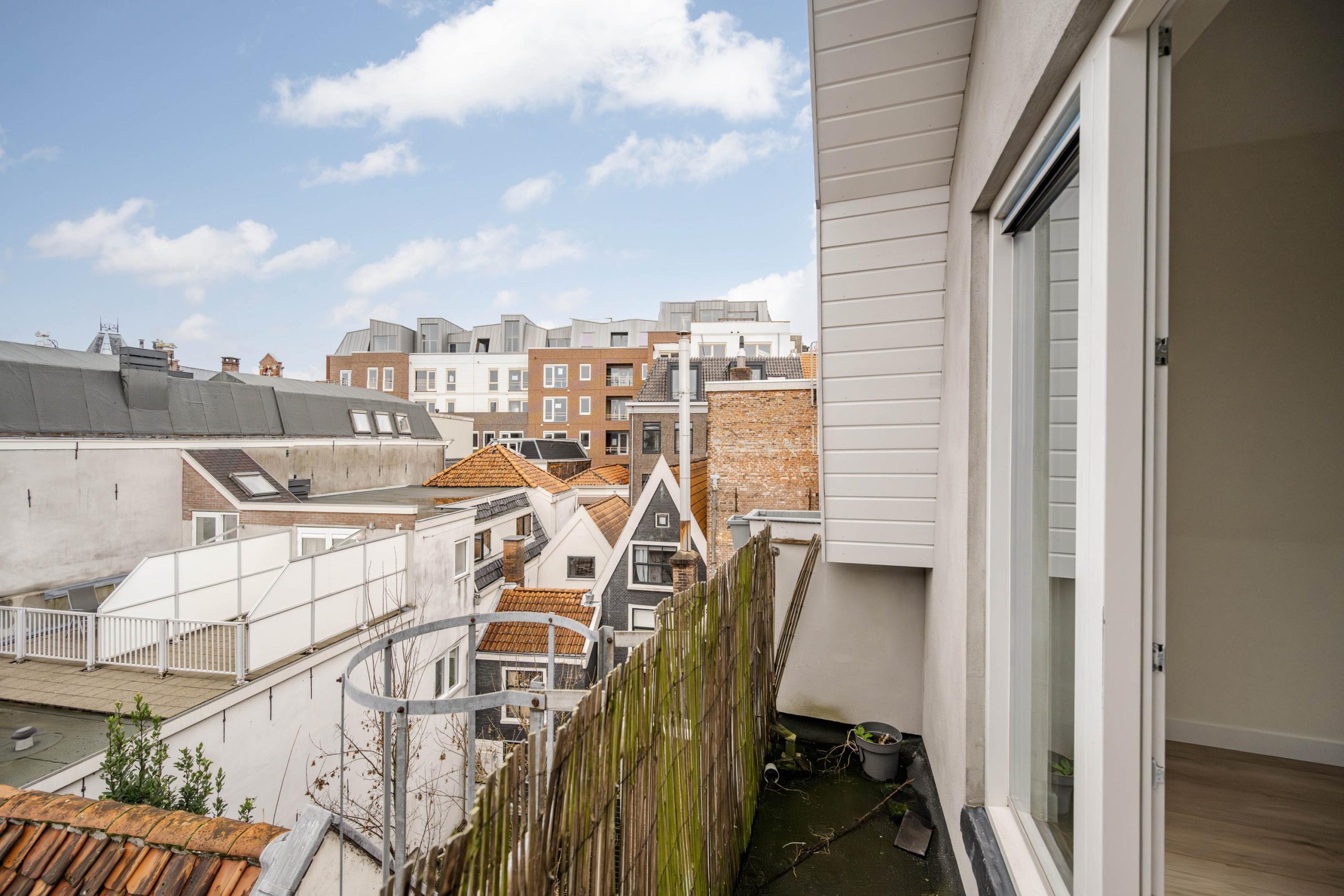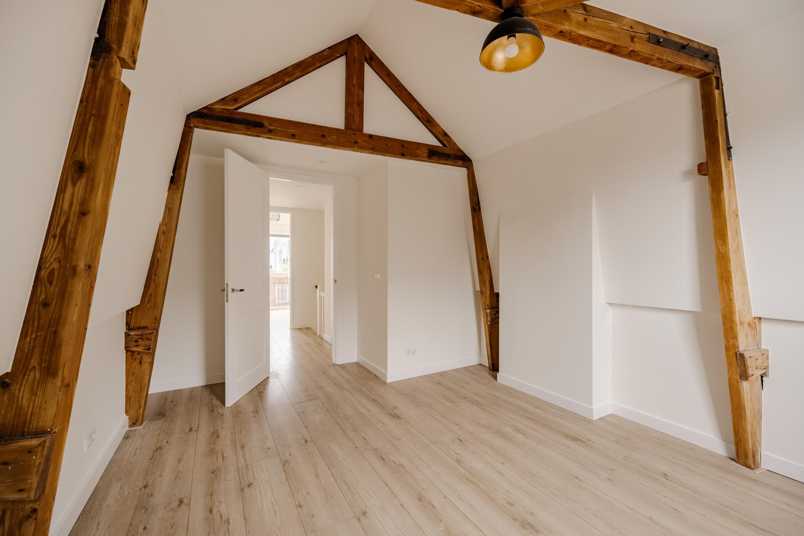 Aan de voorzijde bevindt zich een ruime slaapkamer met prachtig zicht op de stad én extra lichtinval via een zijraam. De houten spanten in het zicht geven deze kamer een warme, authentieke uitstraling. Aan de achterzijde bevindt zich een derde slaapkamer met toegang tot het balkon – een fijn plekje om even te ontsnappen aan de stadse dynamiek.
