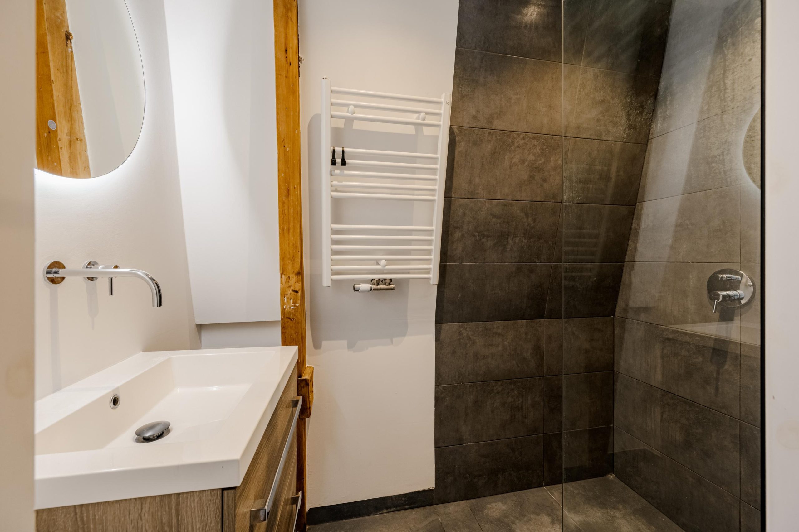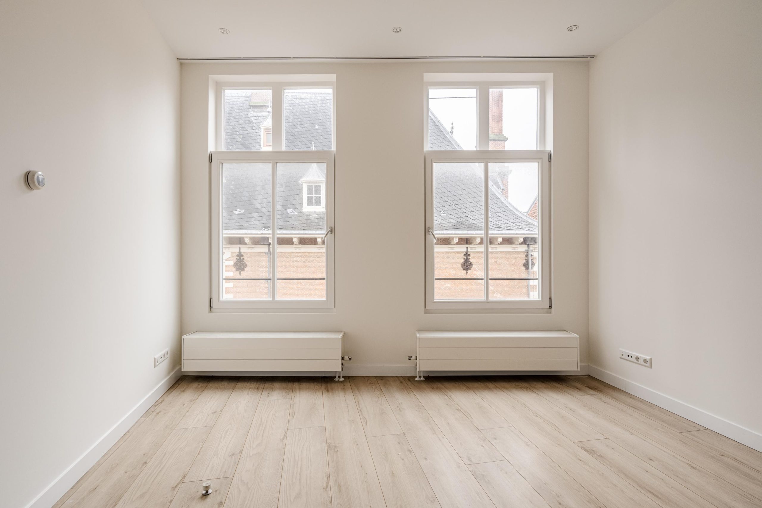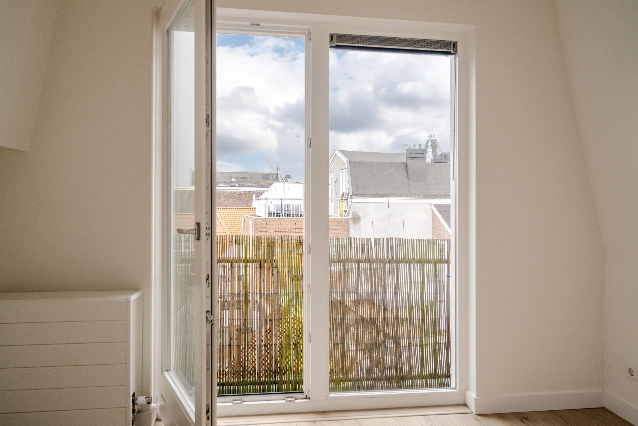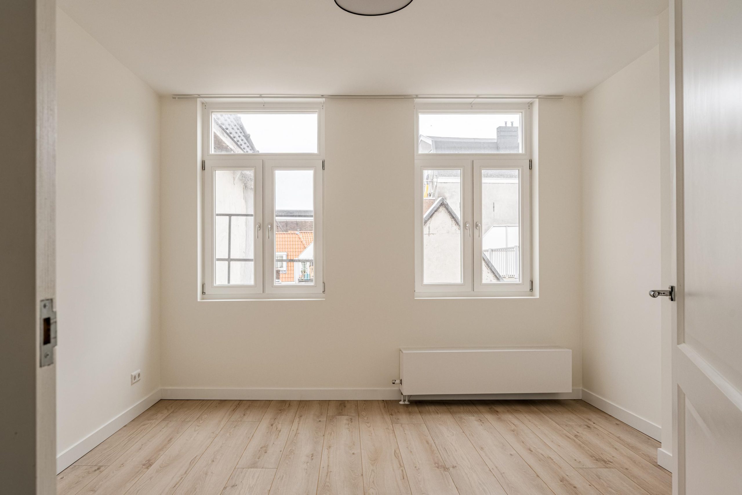 Aan de voorzijde bevindt zich een ruime slaapkamer met prachtig zicht op de stad én extra lichtinval via een zijraam. De houten spanten in het zicht geven deze kamer een warme, authentieke uitstraling. Aan de achterzijde bevindt zich een derde slaapkamer met toegang tot het balkon – een fijn plekje om even te ontsnappen aan de stadse dynamiek.