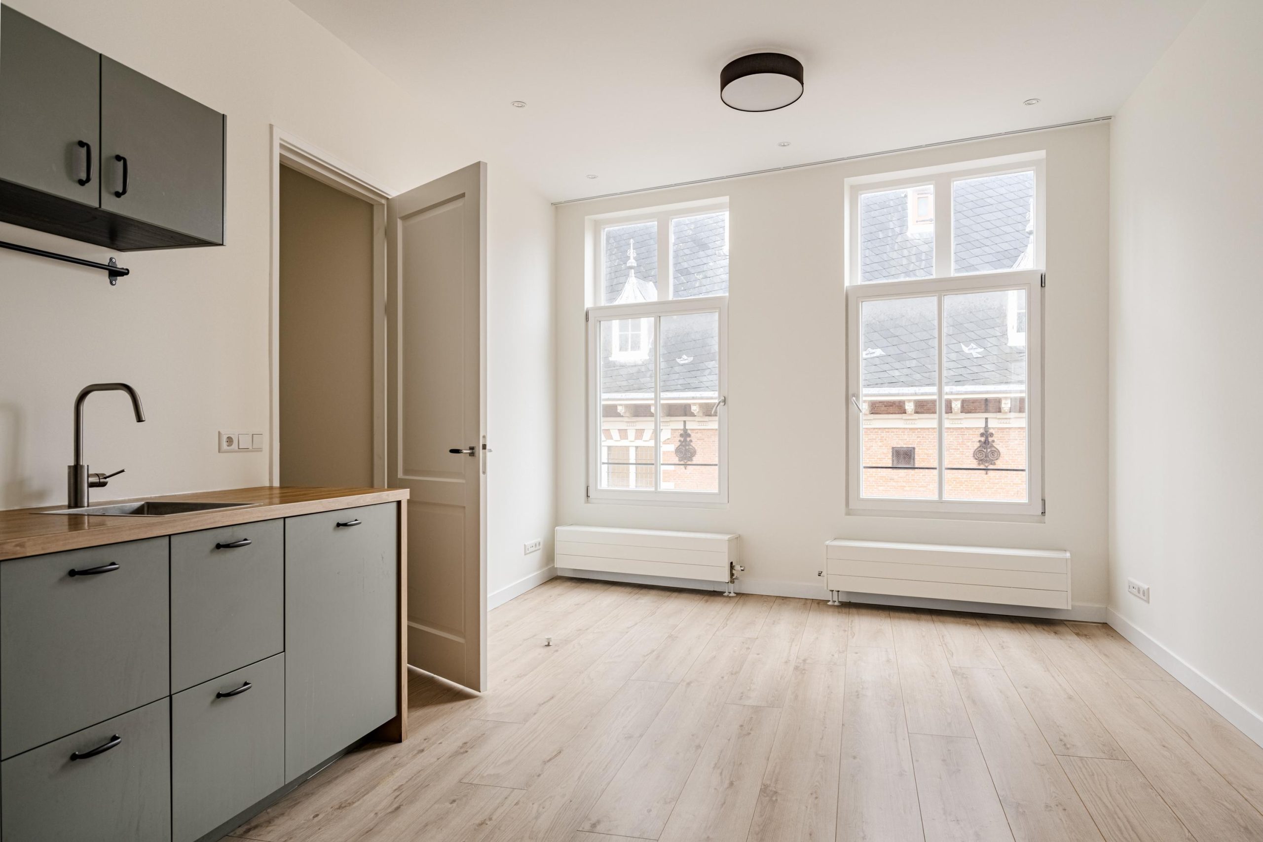 Via het gemeenschappelijke trappenhuis bereik je de entree van het appartement op de tweede etage. Je komt binnen in een hal met meterkast en intercom. De lichte woonkamer heeft grote raampartijen, een plafondhoogte van bijna 3 meter en biedt direct uitzicht op het oude stadhuis en de sfeervolle Zijlstraat. Dankzij de ligging op het zuiden geniet je hier volop van het daglicht.