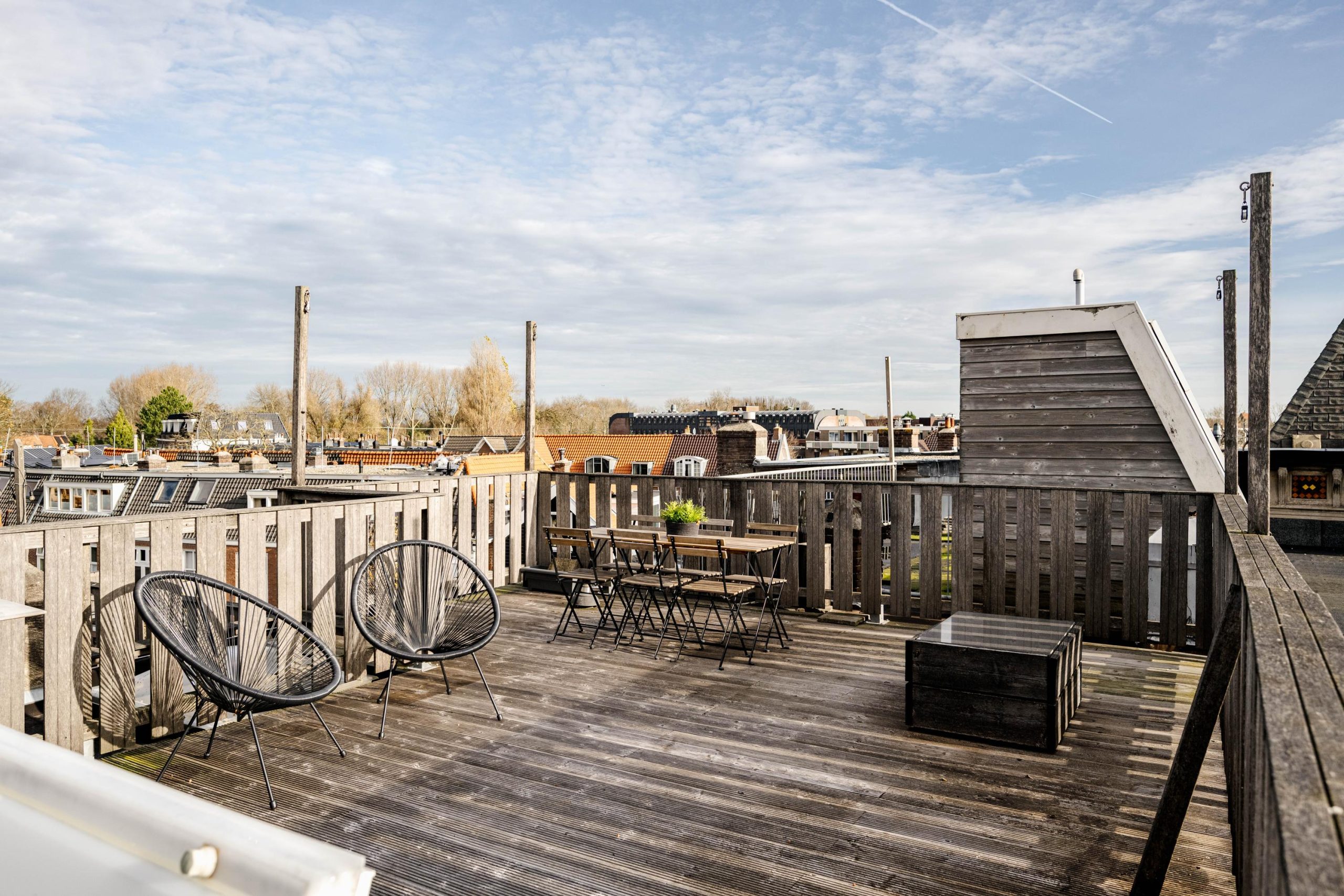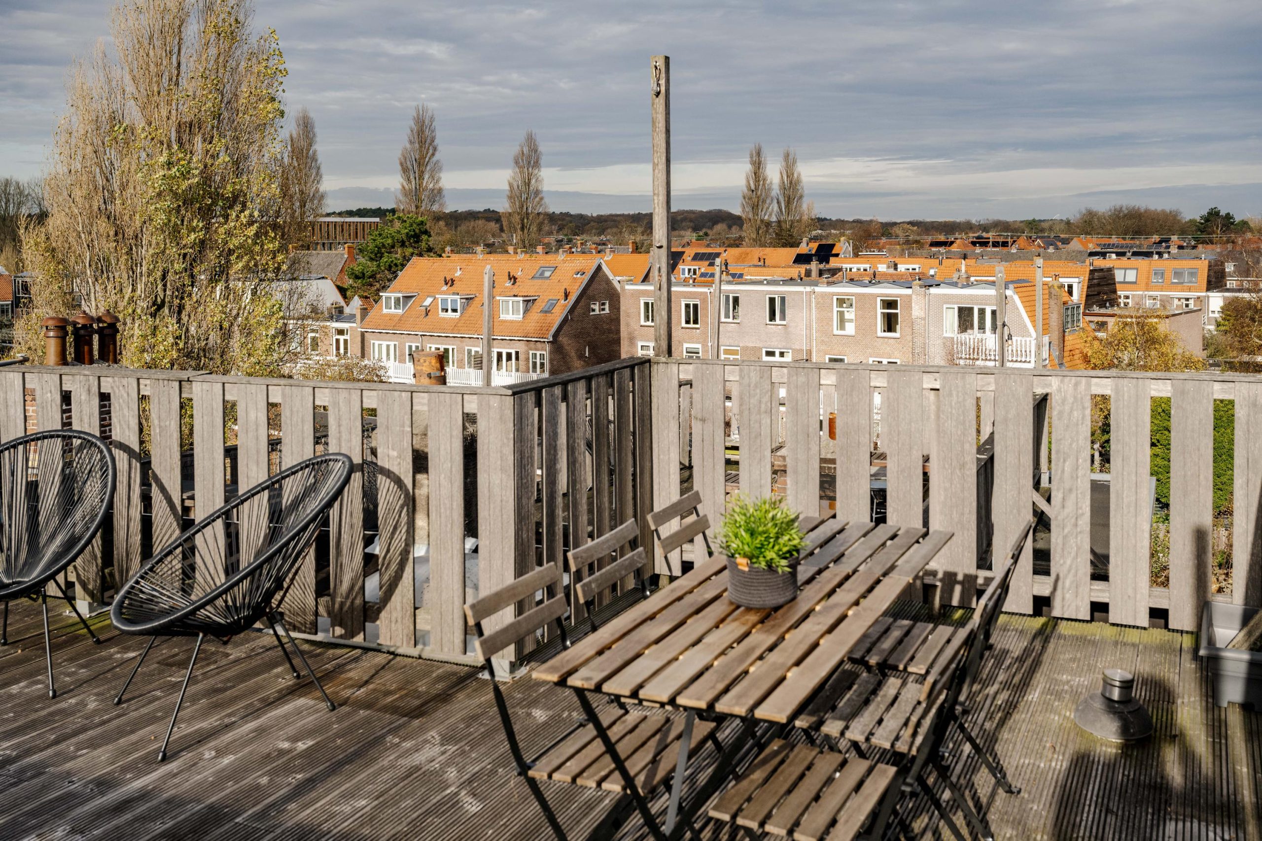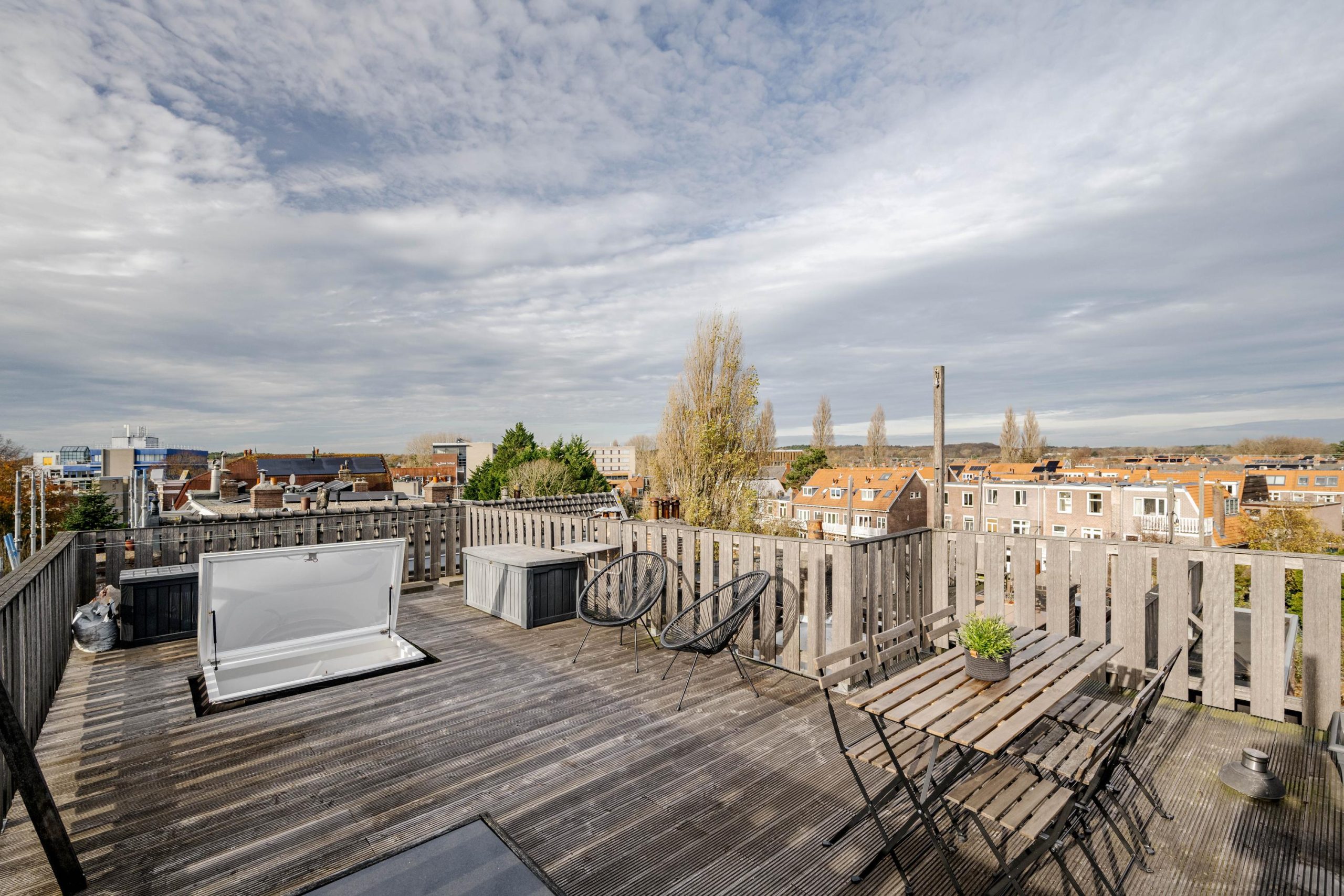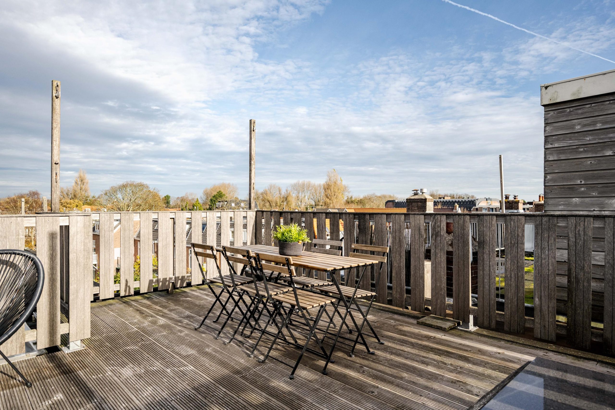 Vanuit de woonkamer leidt een vaste trap naar het royale dakterras. De totale oppervlakte van het terras is ca. 38m². Dit is zonder twijfel een van de grootste pluspunten van de woning. Een zonnige plek waar je vanaf het voorjaar tot ver in de avond kunt genieten van het uitzicht over de stad en de duinen. Hier zit je echt bovenop Haarlem.