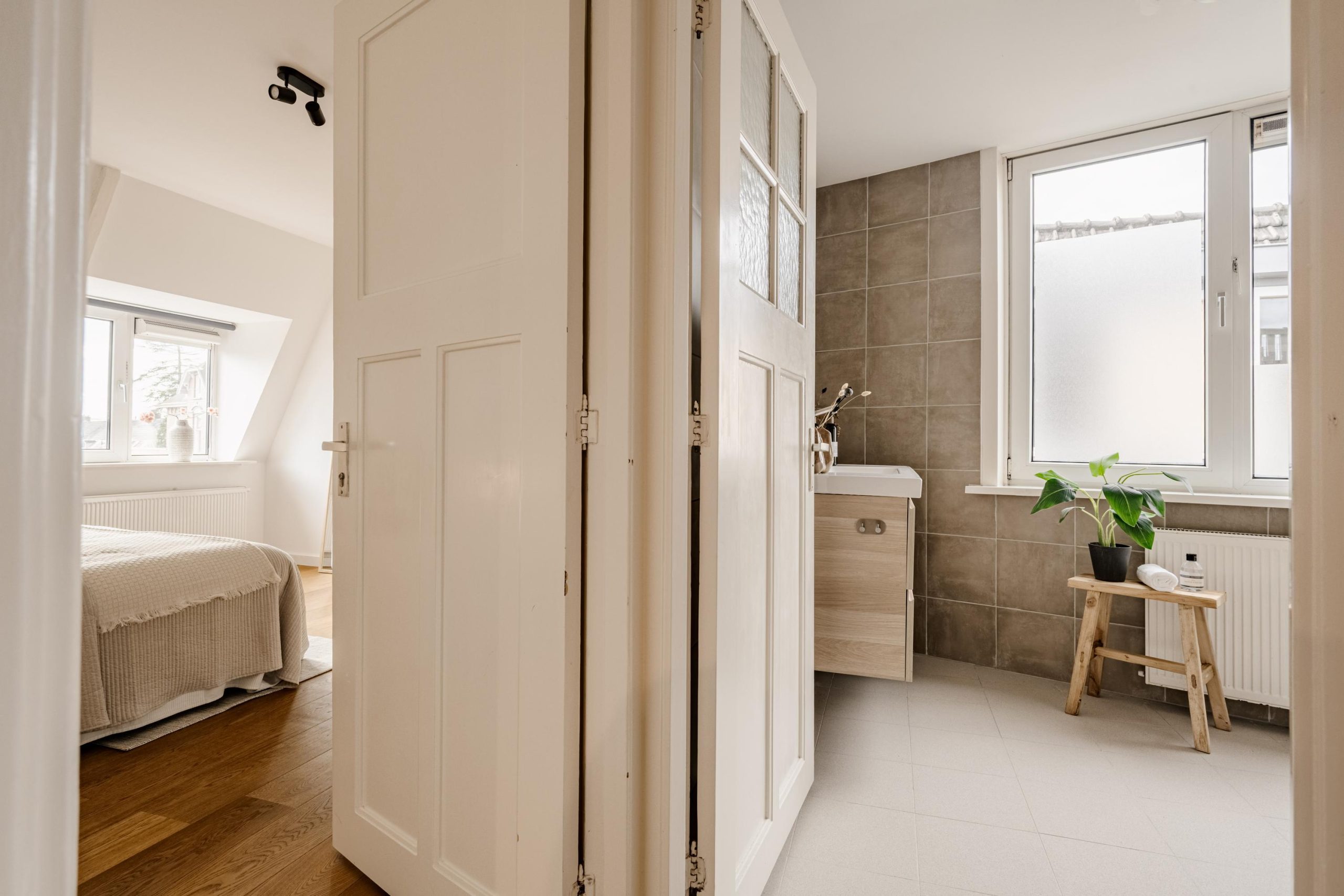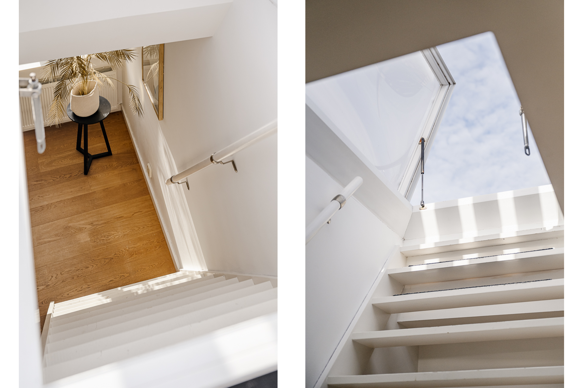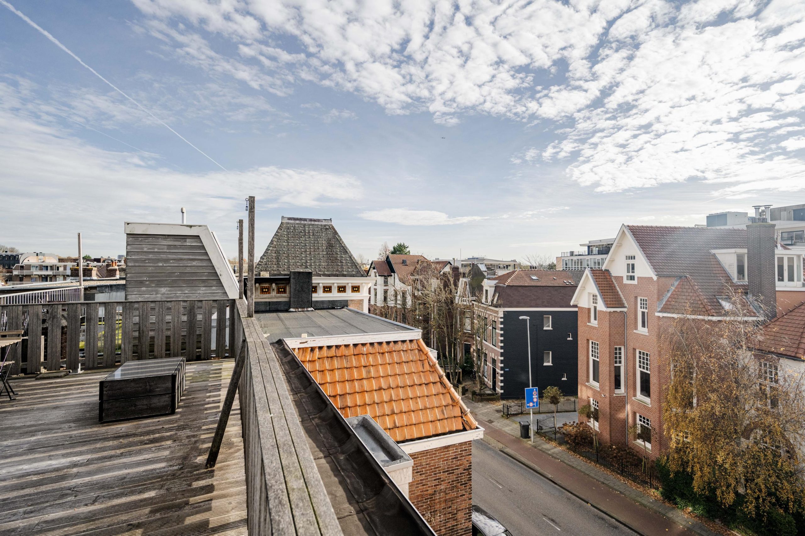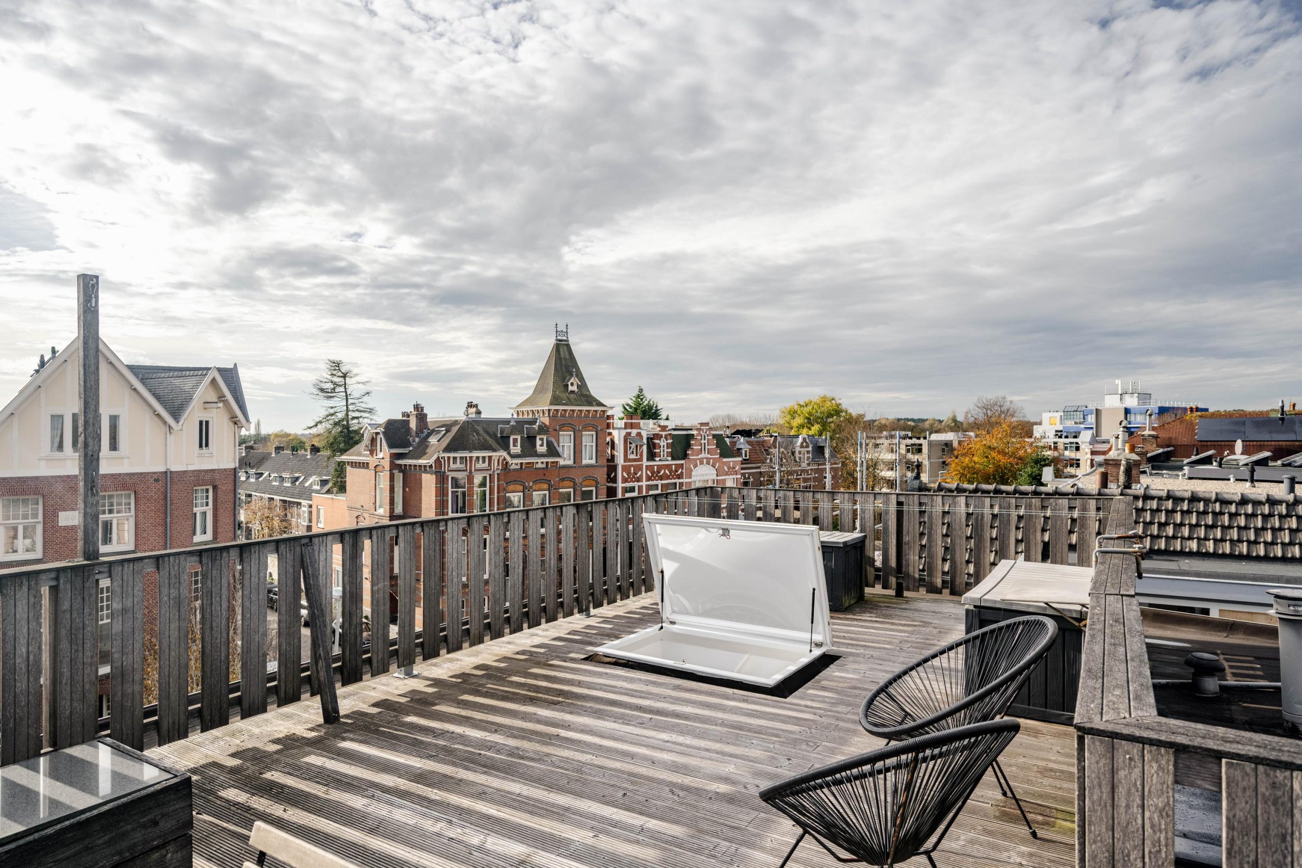 Vanuit de woonkamer leidt een vaste trap naar het royale dakterras. De totale oppervlakte van het terras is ca. 38m². Dit is zonder twijfel een van de grootste pluspunten van de woning. Een zonnige plek waar je vanaf het voorjaar tot ver in de avond kunt genieten van het uitzicht over de stad en de duinen. Hier zit je echt bovenop Haarlem.