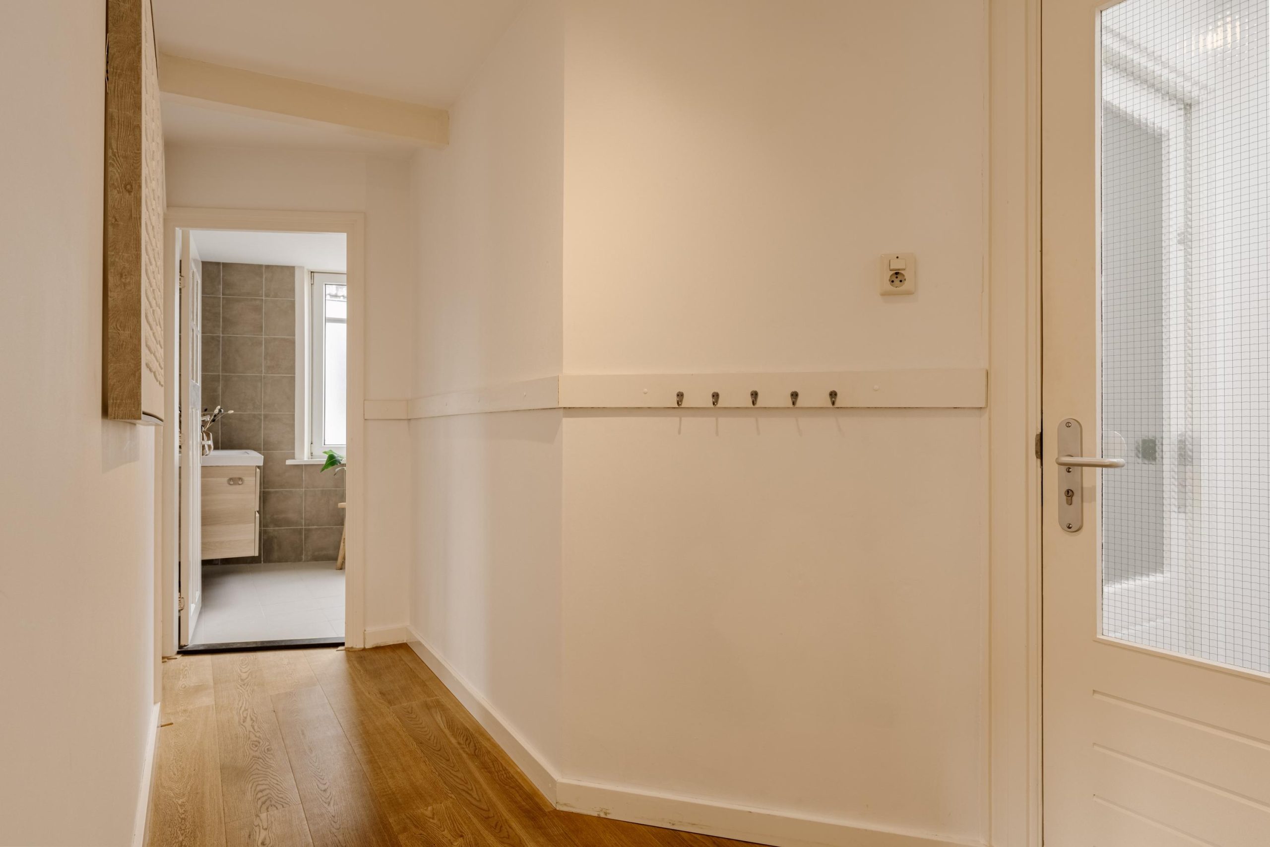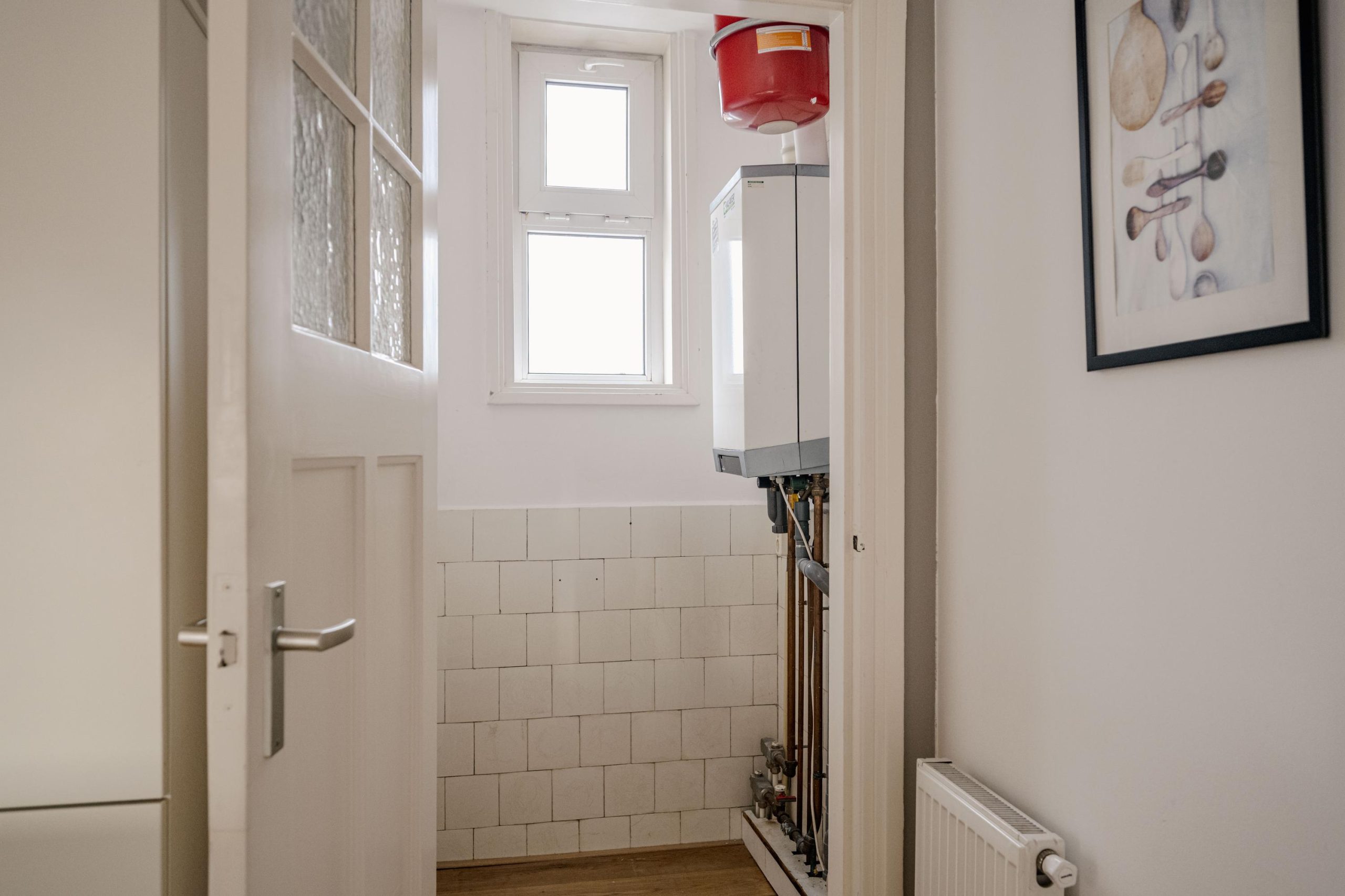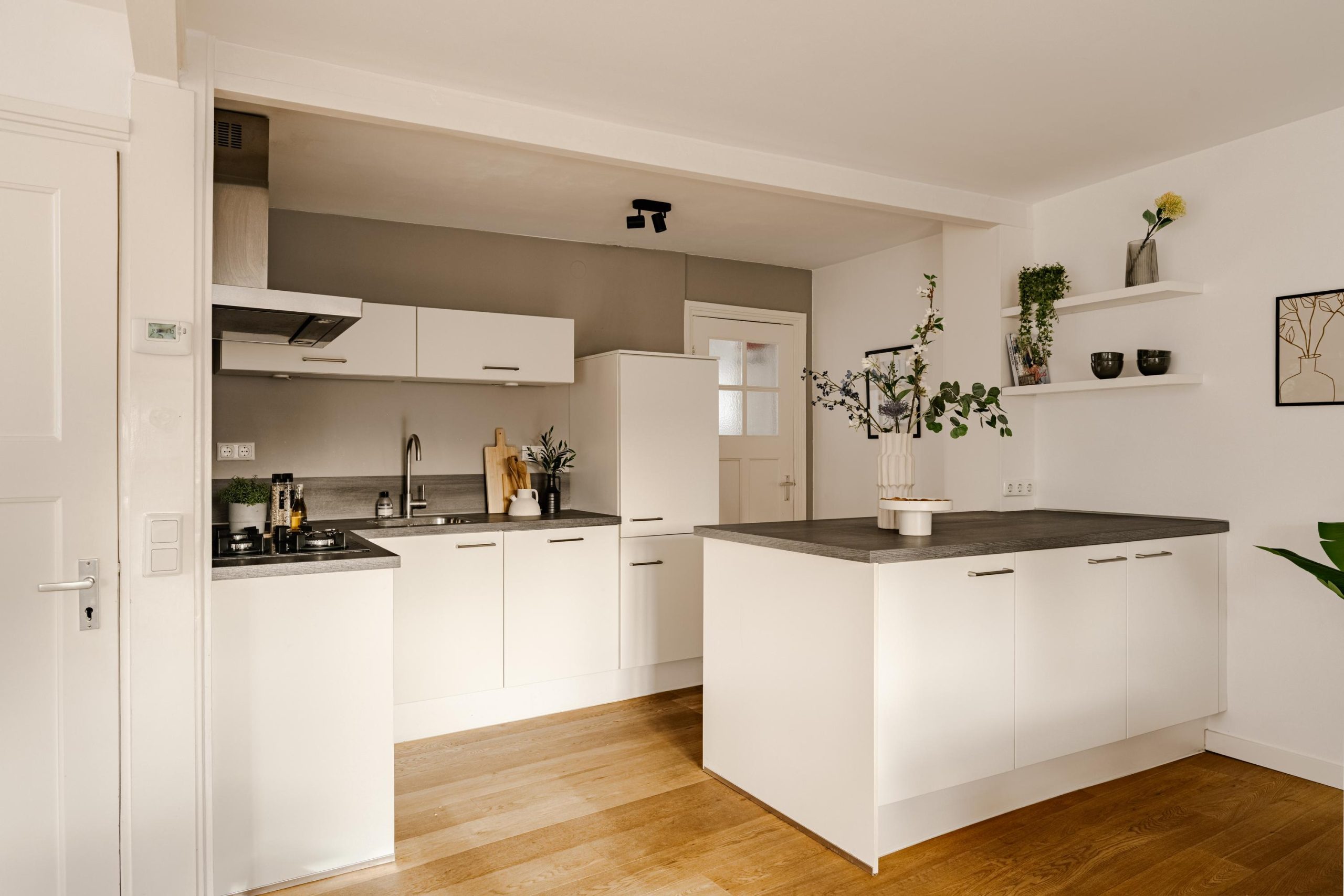 Hal/gang, lichte woonkamer met open keuken, compleet met moderne inbouwapparatuur. Aangrenzend ligt de praktische wasruimte met de cv-opstelling. De badkamer is ingericht met een inloopdouche, toilet en wastafelmeubel. Aan de voorzijde bevindt zich de ruime slaapkamer met een vaste kastenwand en een nette eikenhouten vloer die doorloopt in de woonkamer en gang.