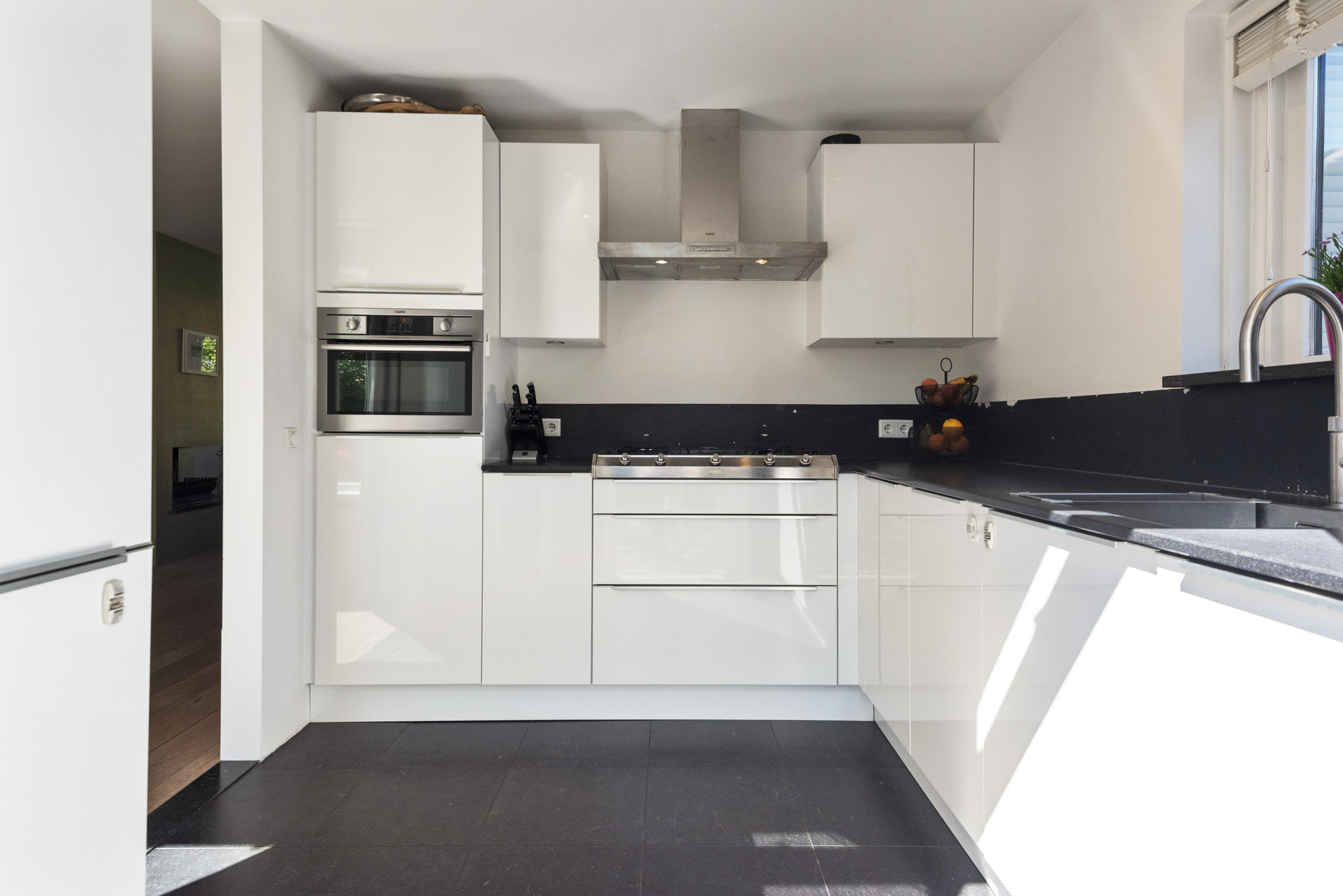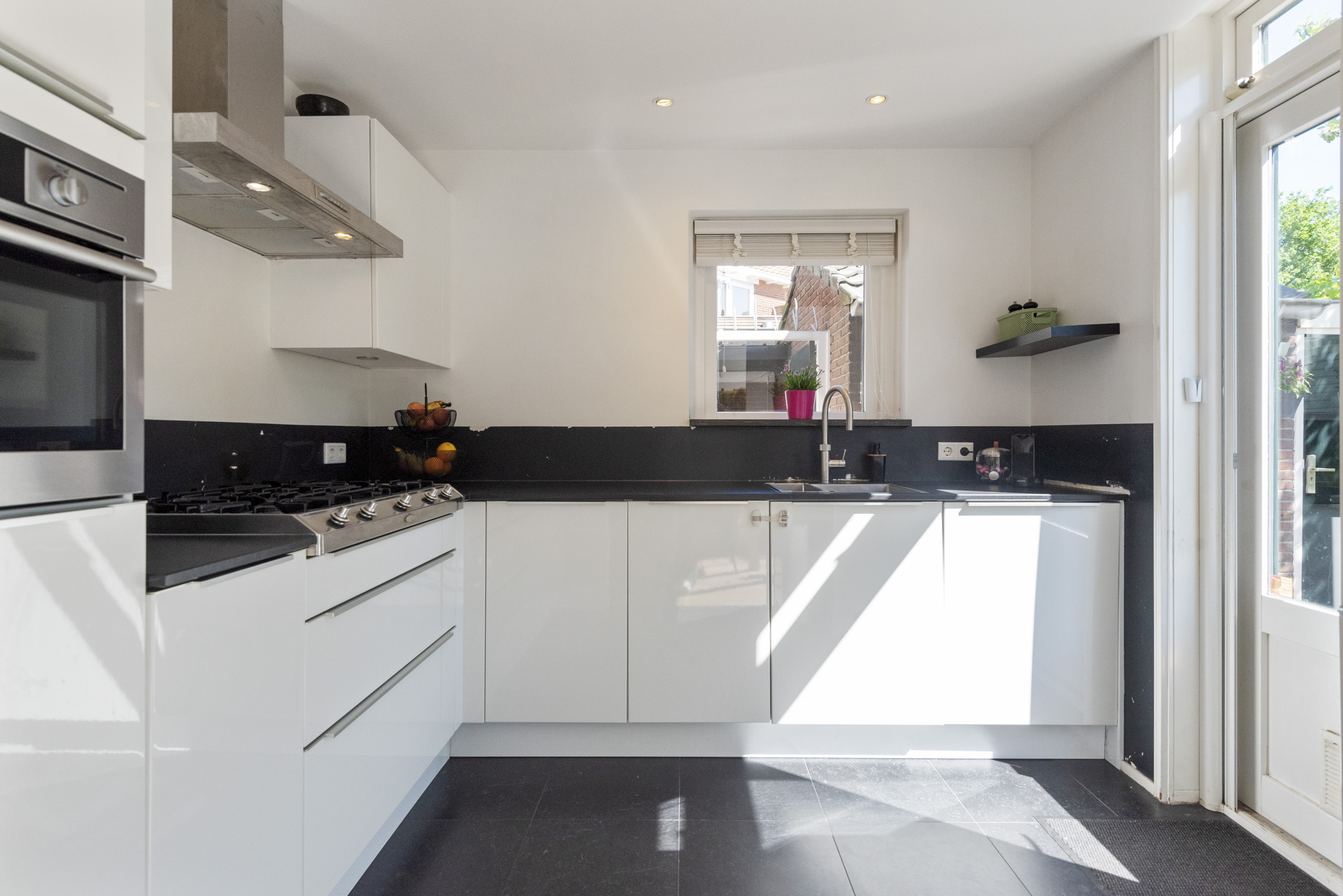 Via de entree kom je in een brede, lichte hal met volop ruimte voor garderobe, ideaal ook voor een gezin. Hier bevinden zich de meterkast en het toilet. Vanuit de hal stap je de lichte L-vormige woonkamer binnen, voorzien van een eikenhouten vloer en een open haard. Aan de achterzijde is een royale eetkamer gecreëerd die mooi in verbinding staat met de tuin. De keuken heeft een prettige maatvoering, veel werkruimte en diverse inbouwapparatuur. Het zwarte stenen werkblad en het vijfpits Boretti fornuis geven de keuken een stoere uitstraling. Vanuit de keuken loop je direct de zonnige achtertuin in, die ook via een poort naast het huis bereikbaar is.