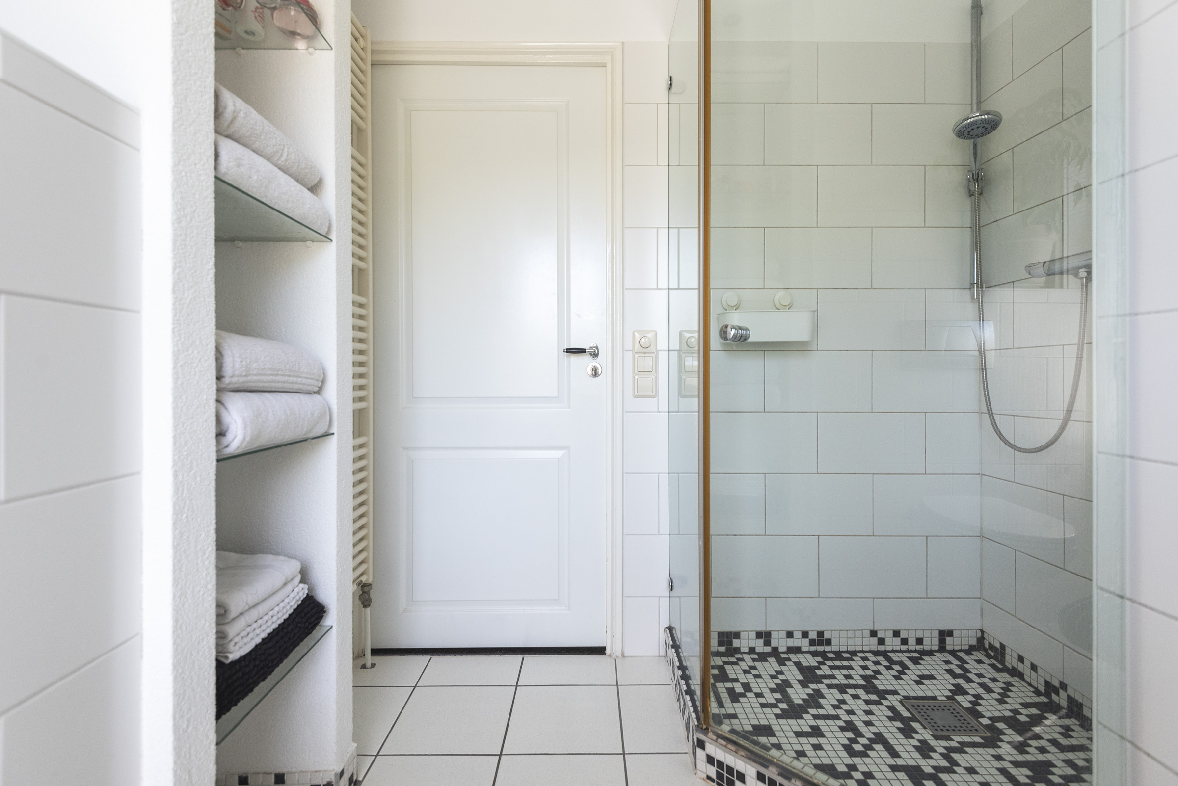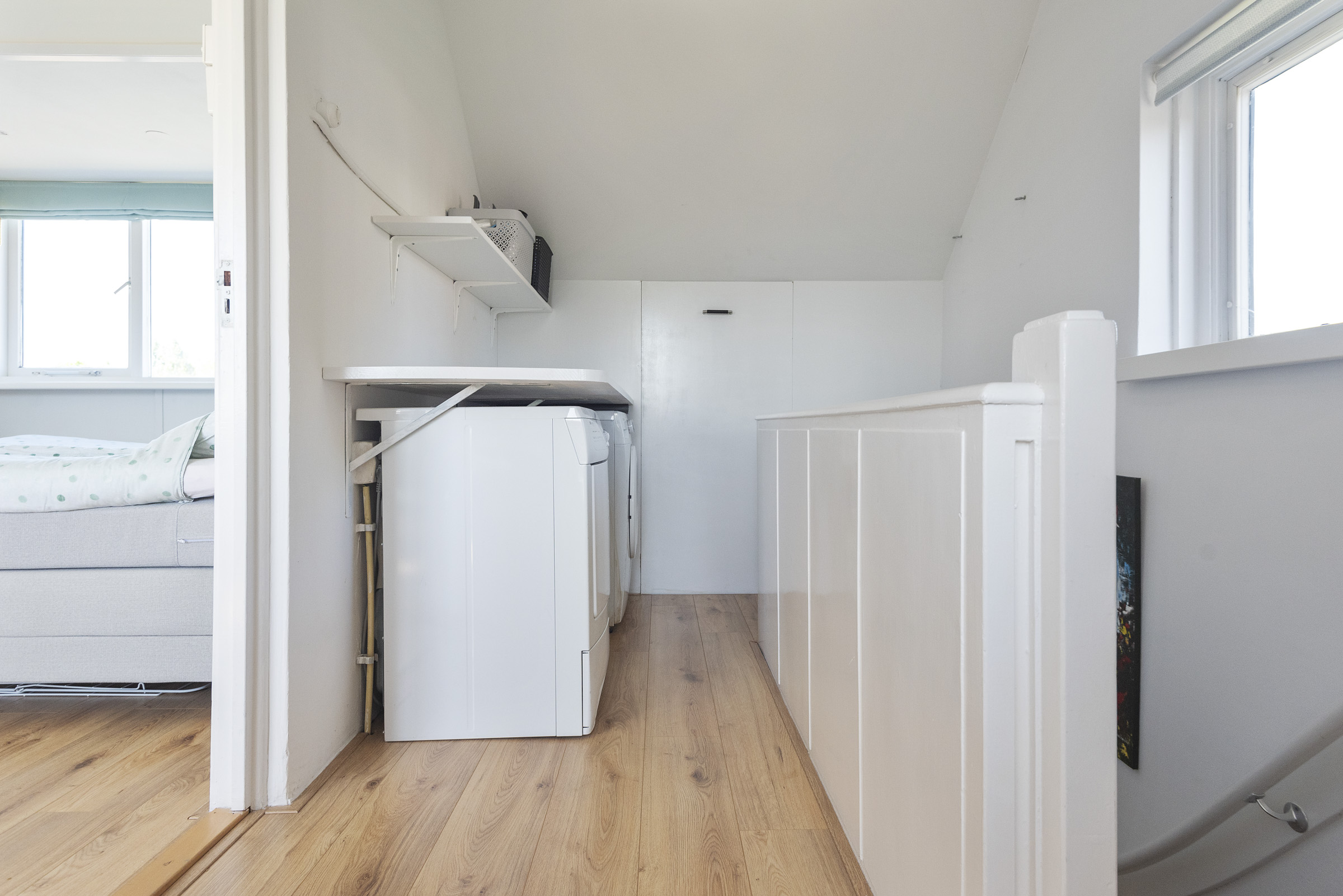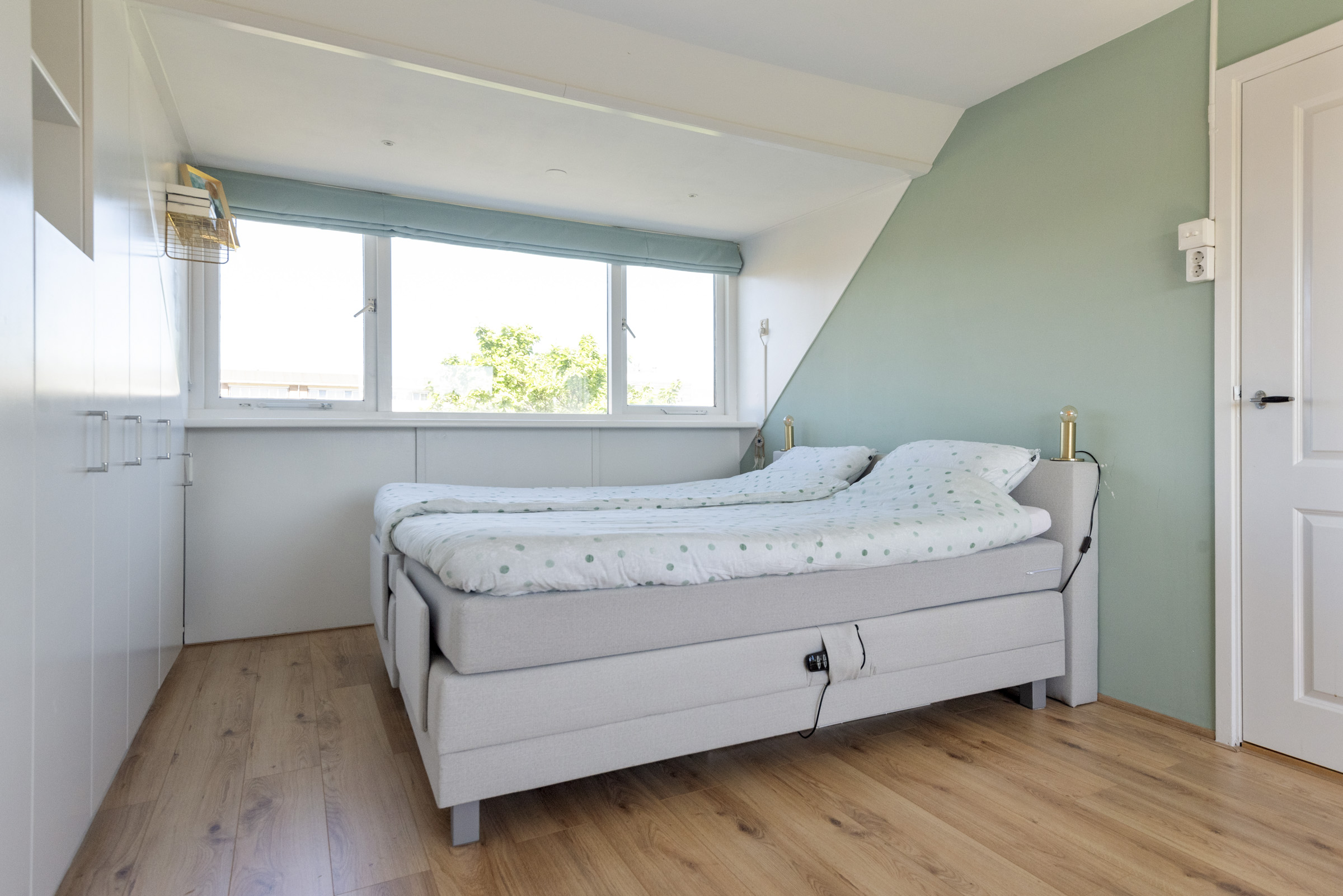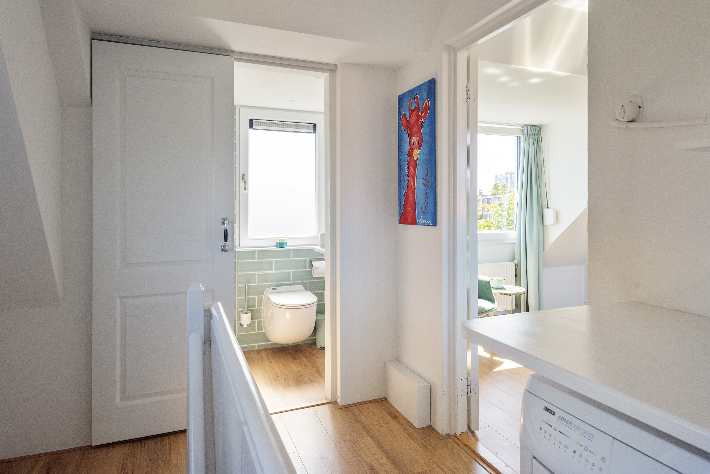 De tweede verdieping biedt een royale vierde slaapkamer met veel lichtinval dankzij de grote dakkapellen aan beide zijden. De vaste kastenwand zorgt hier voor praktische bergruimte. Daarnaast is er een tweede badkamer met douche, toilet en wastafel, een aparte wasruimte en extra opbergruimte achter de knieschotten op de overloop.