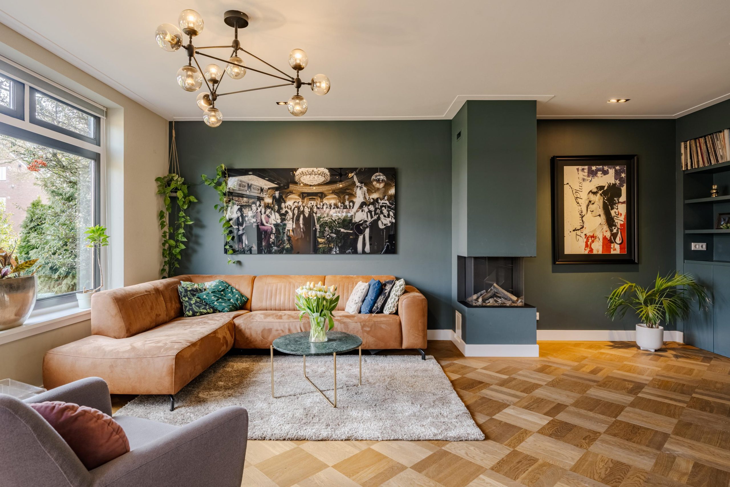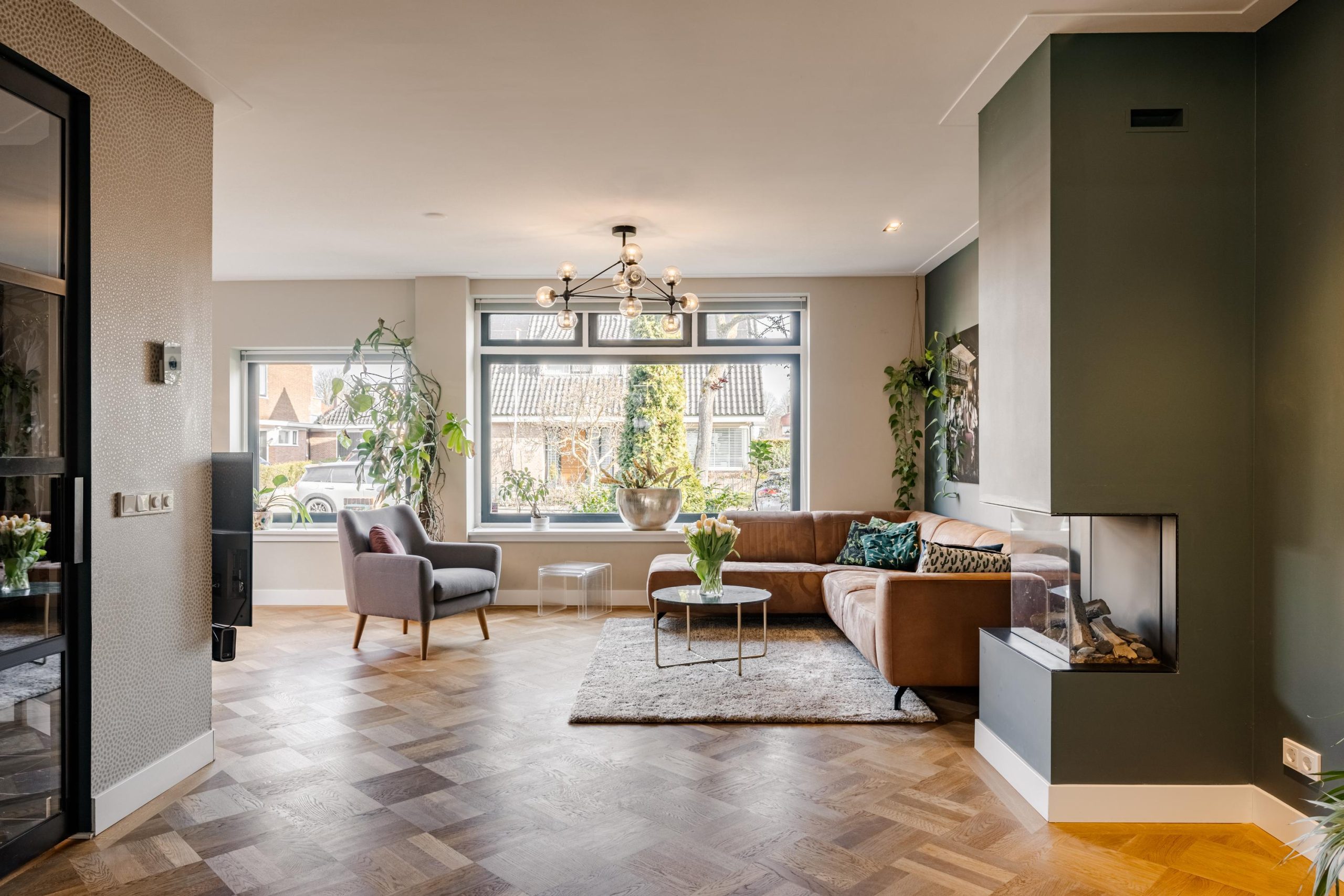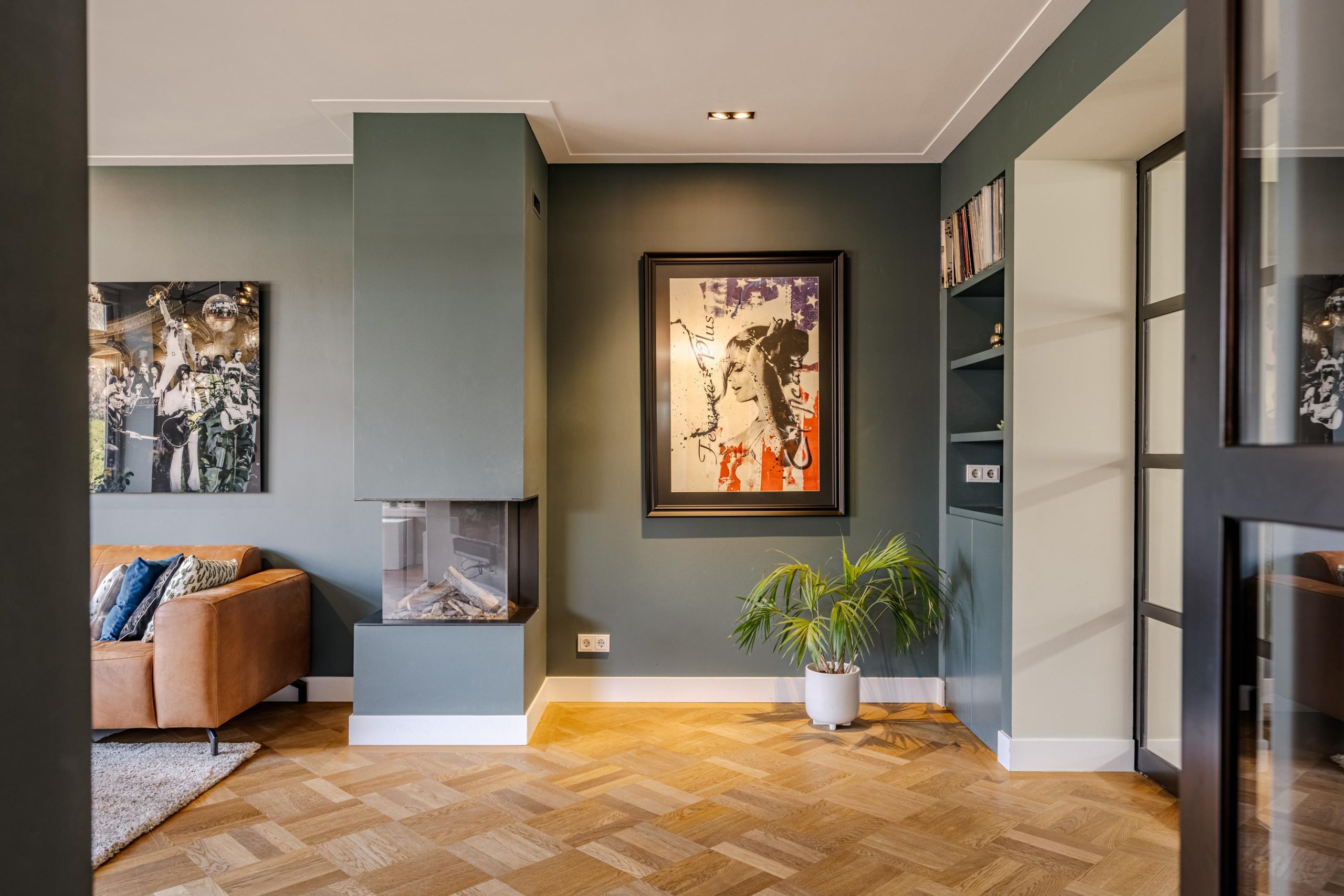 Aan de voorzijde ligt de lichte woonkamer met een plafondhoogte van circa 2.56 meter, een sfeervolle gashaard en een moderne en-suite doorgang. Een fijne plek om samen te komen of juist rustig te ontspannen.