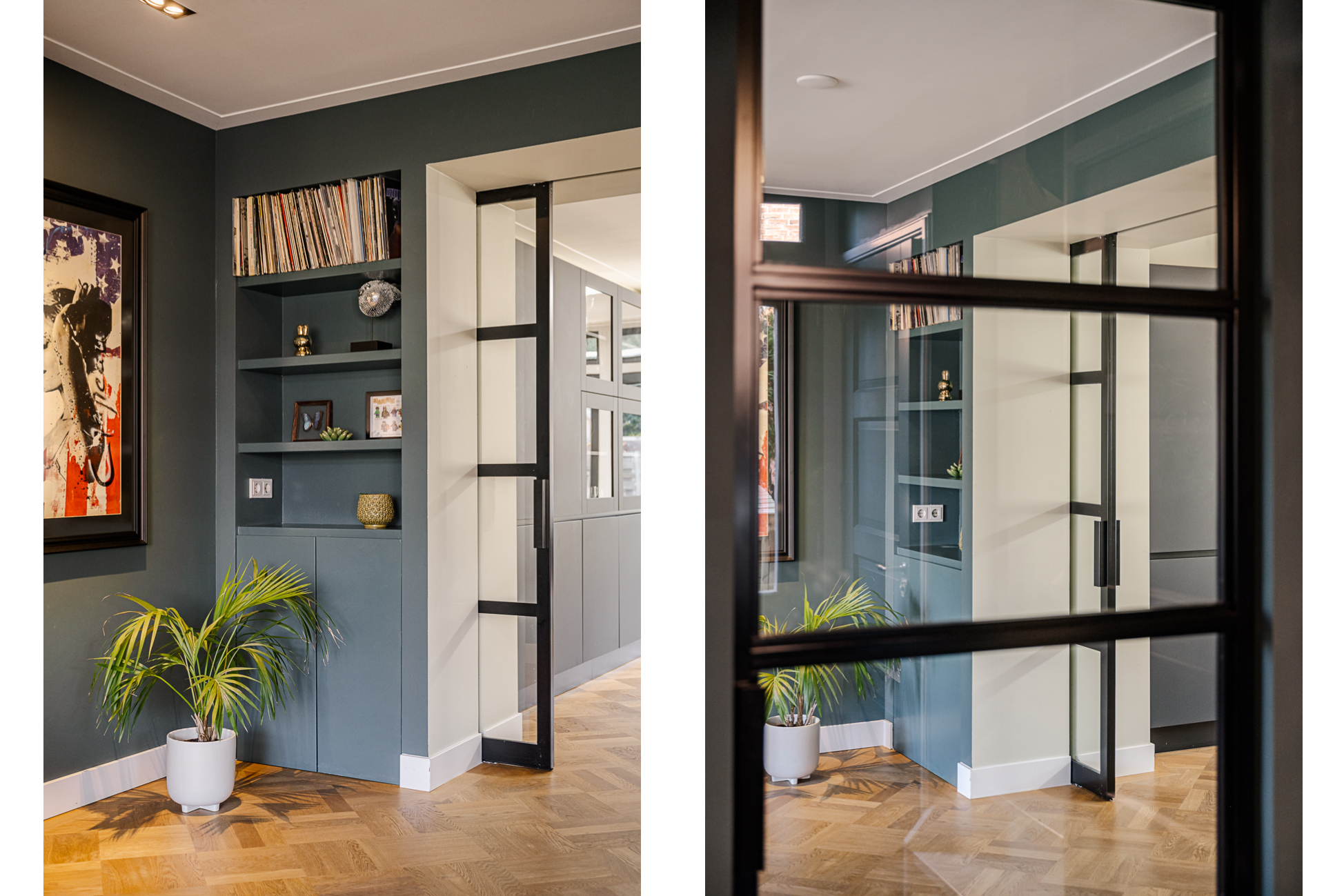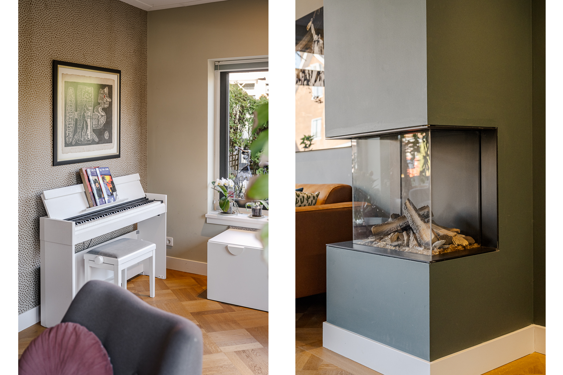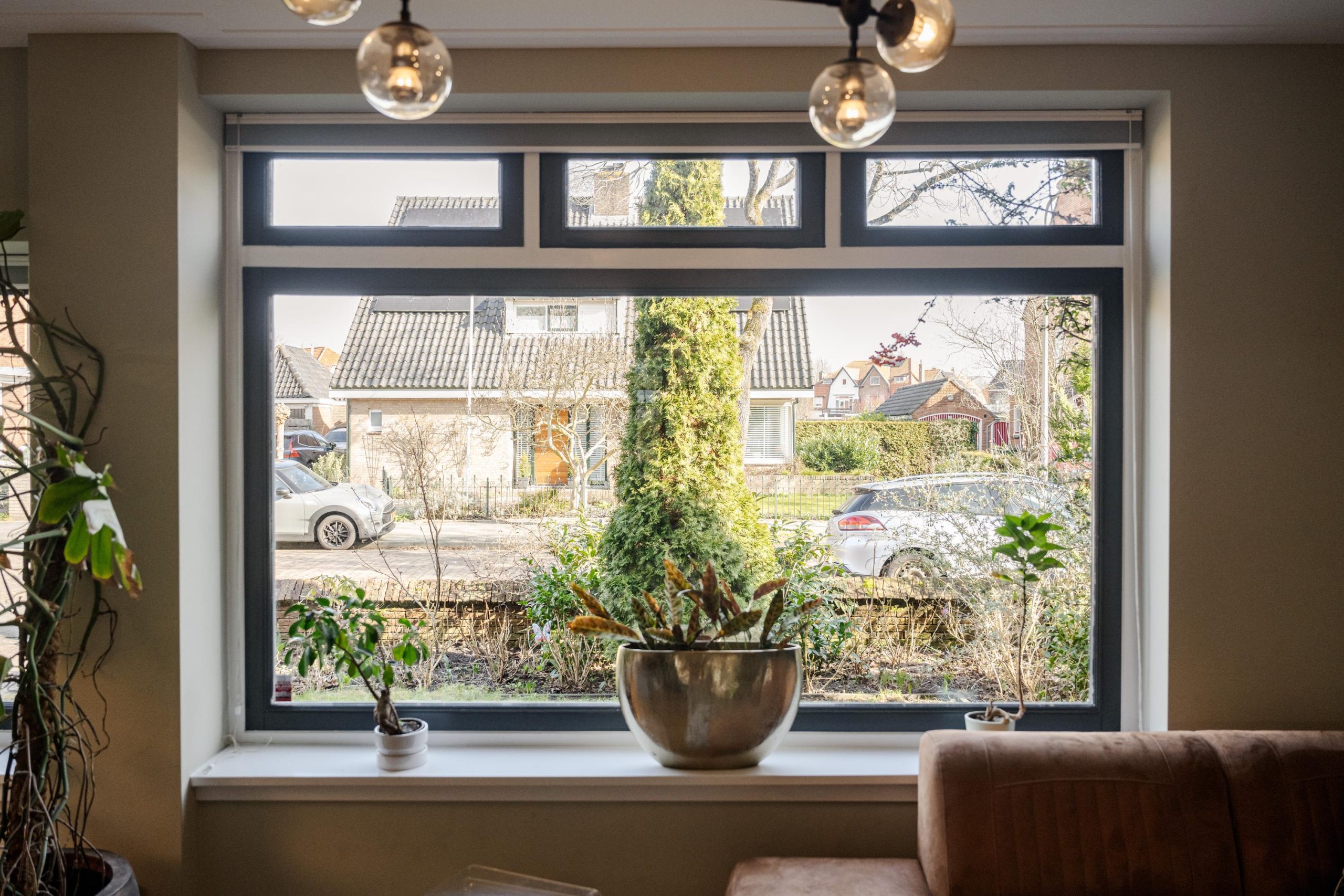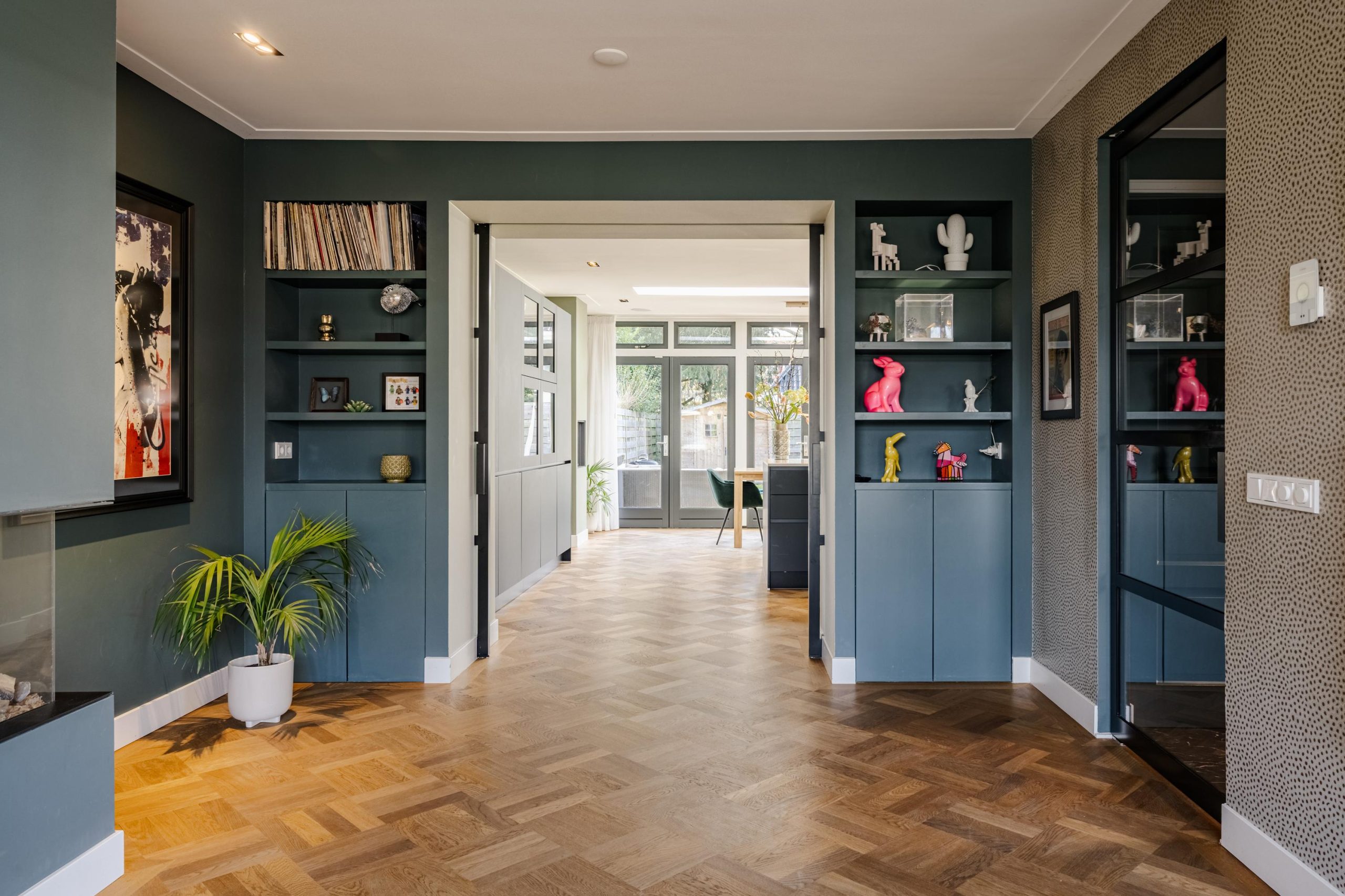 Aan de voorzijde ligt de lichte woonkamer met een plafondhoogte van circa 2.56 meter, een sfeervolle gashaard en een moderne en-suite doorgang. Een fijne plek om samen te komen of juist rustig te ontspannen.