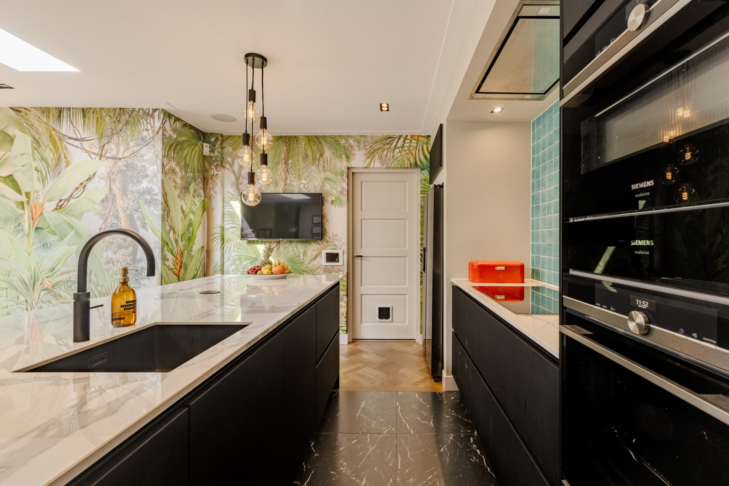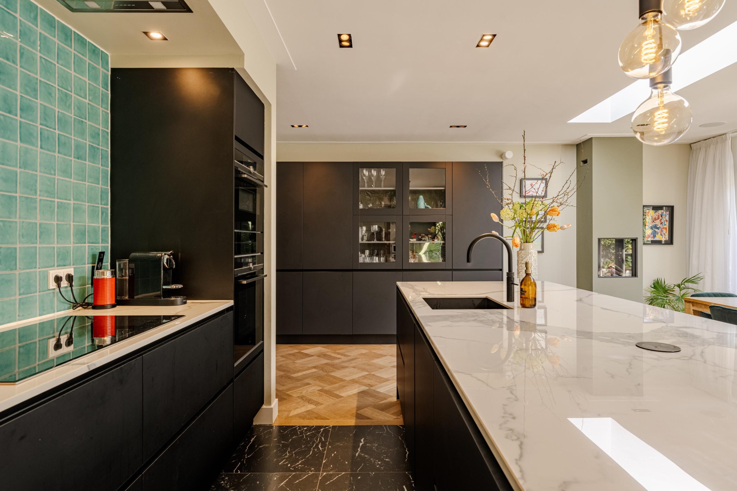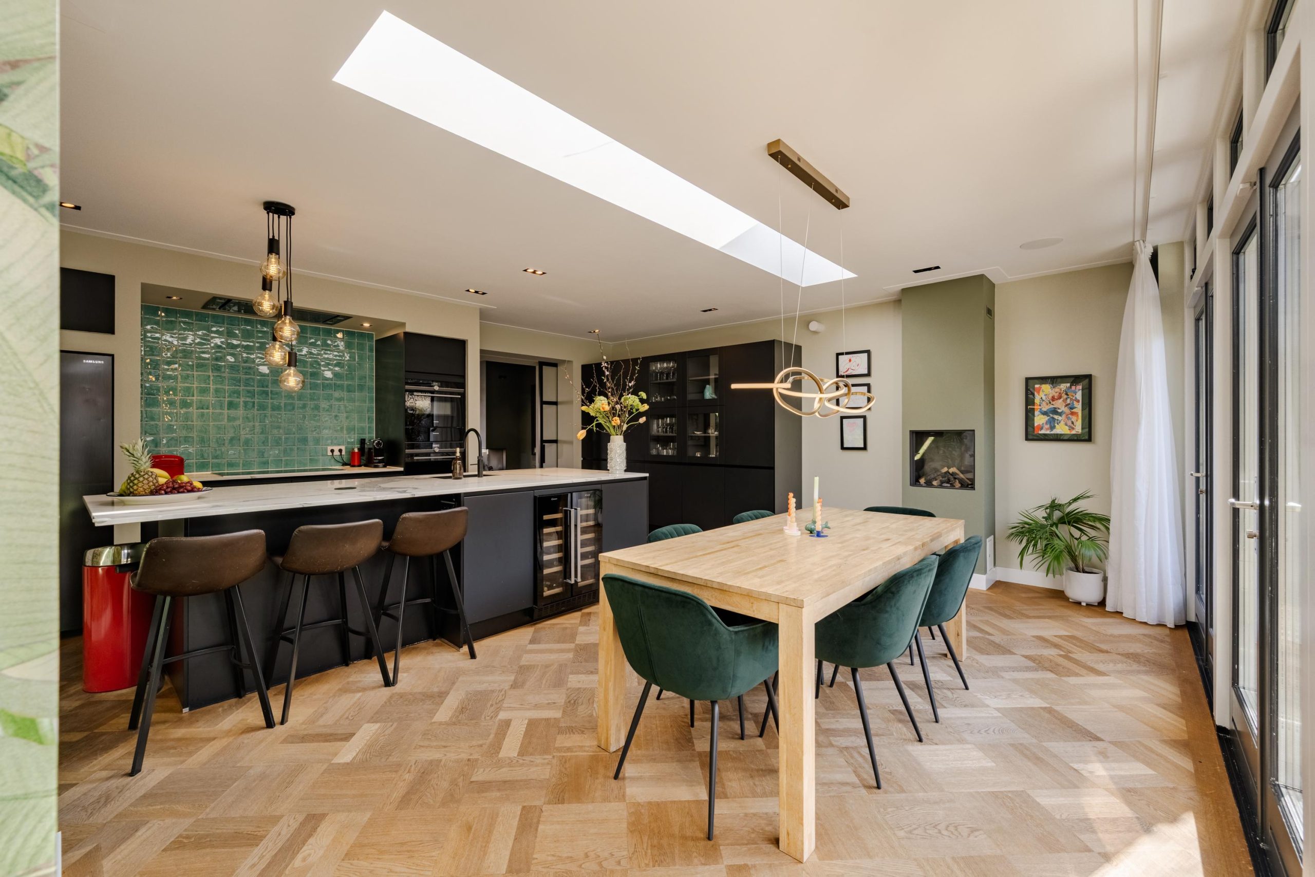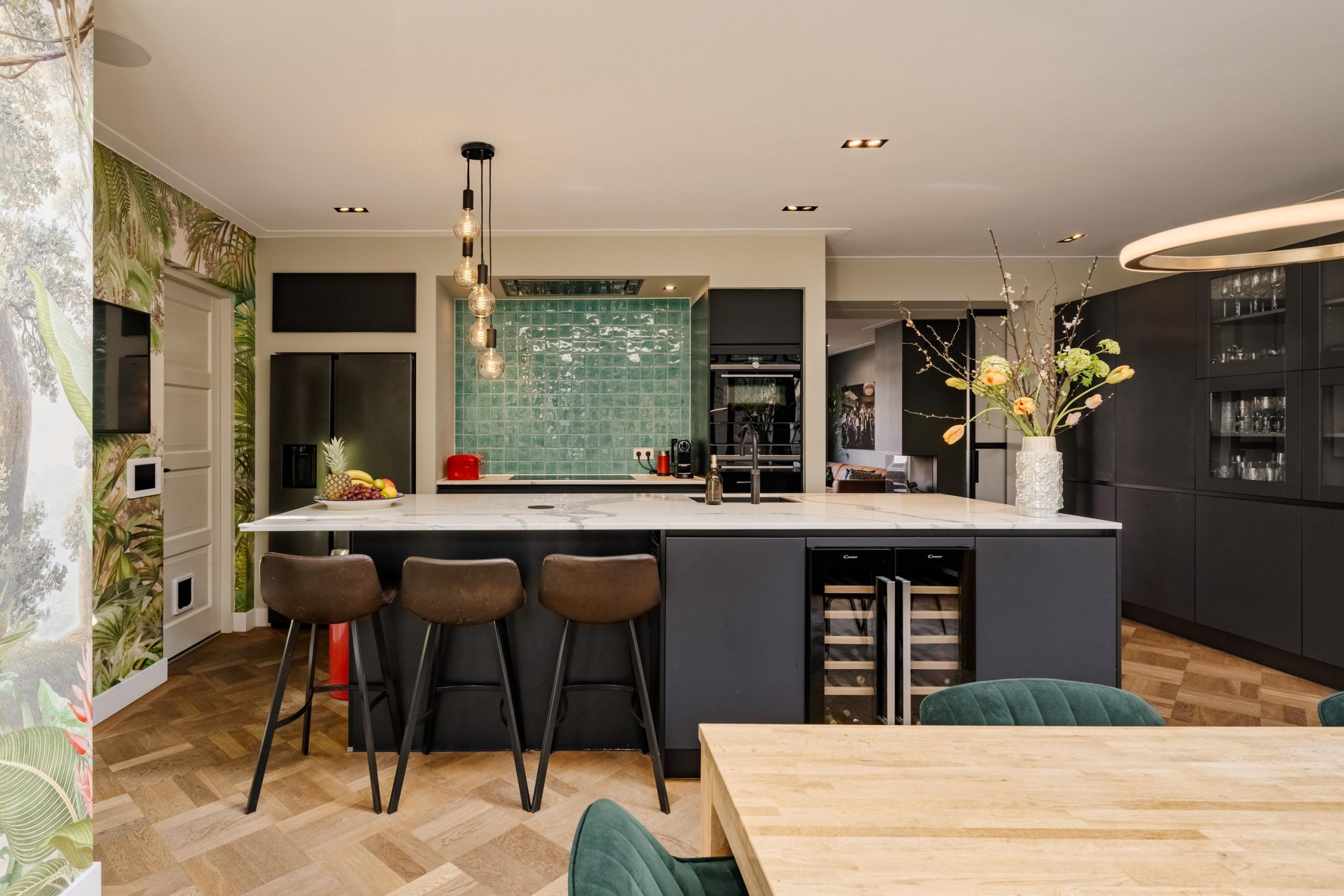 Aan de achterzijde bevindt zich de riante woonkeuken met lichtstraat. Dankzij de grote glaspartijen en openslaande deuren naar de tuin stroomt het daglicht rijkelijk naar binnen. Het kookeiland met bar vormt het middelpunt van de ruimte. De keuken is uitgerust met onder andere een Quooker, wijnklimaatkast, Amerikaanse koelkast, combi-oven, separate oven en warmhoudlade.