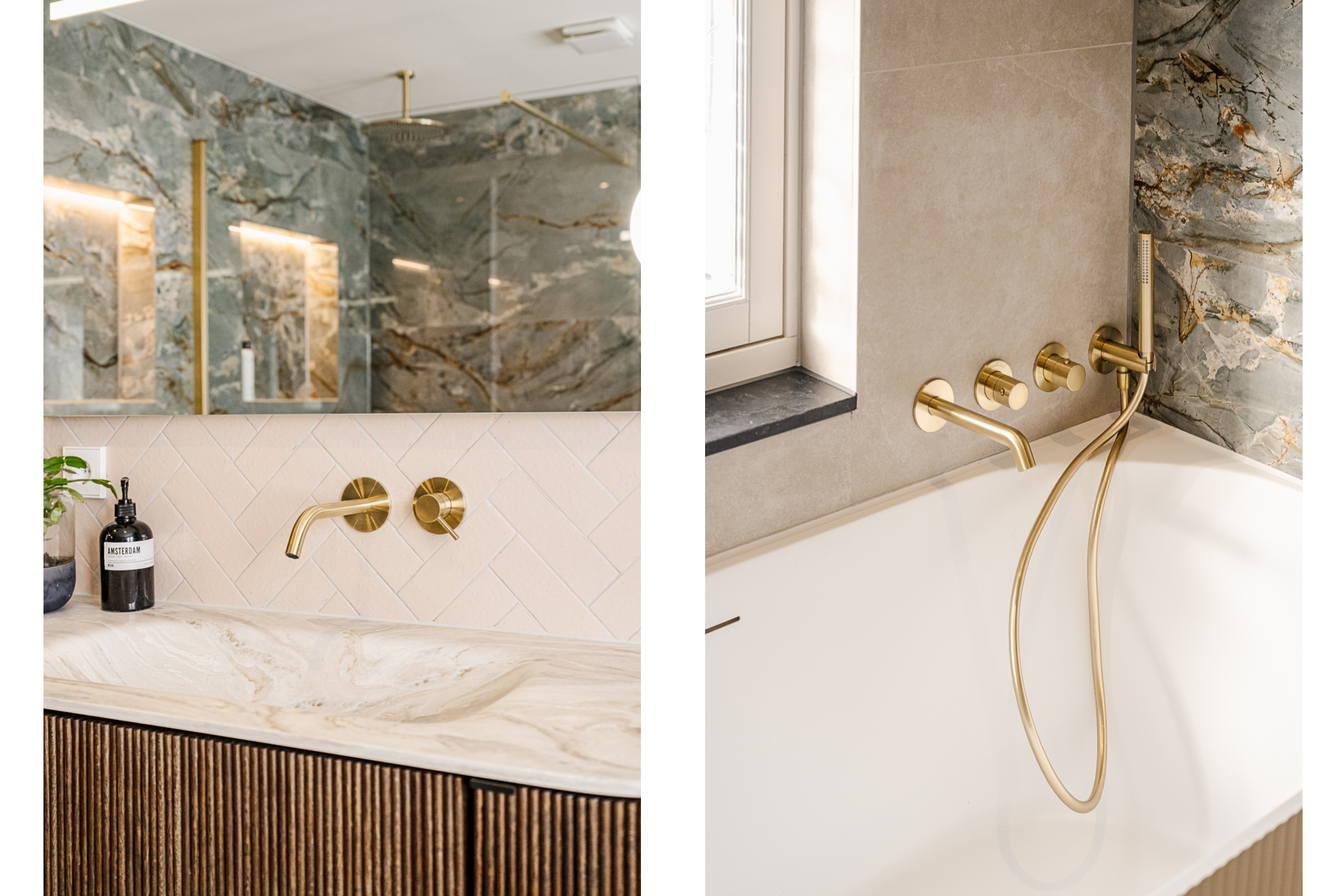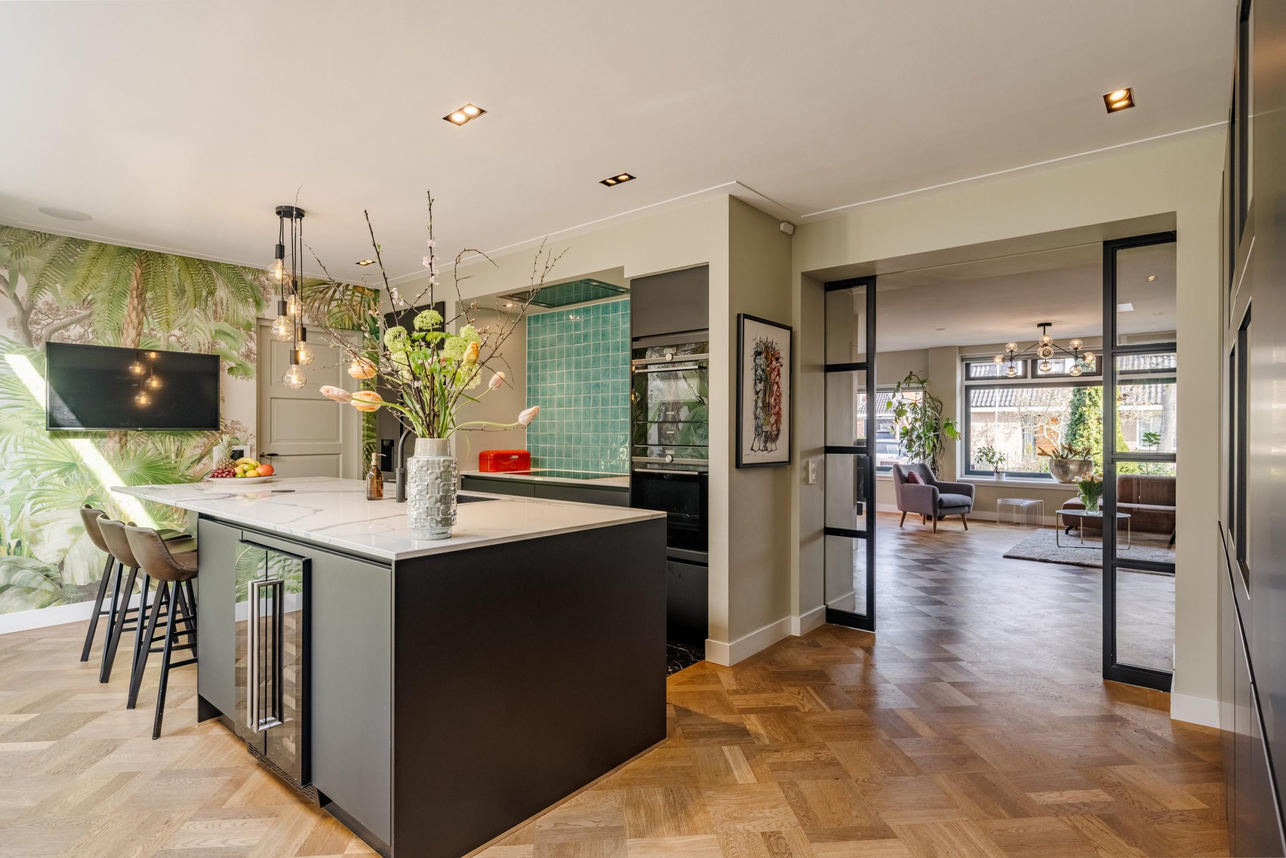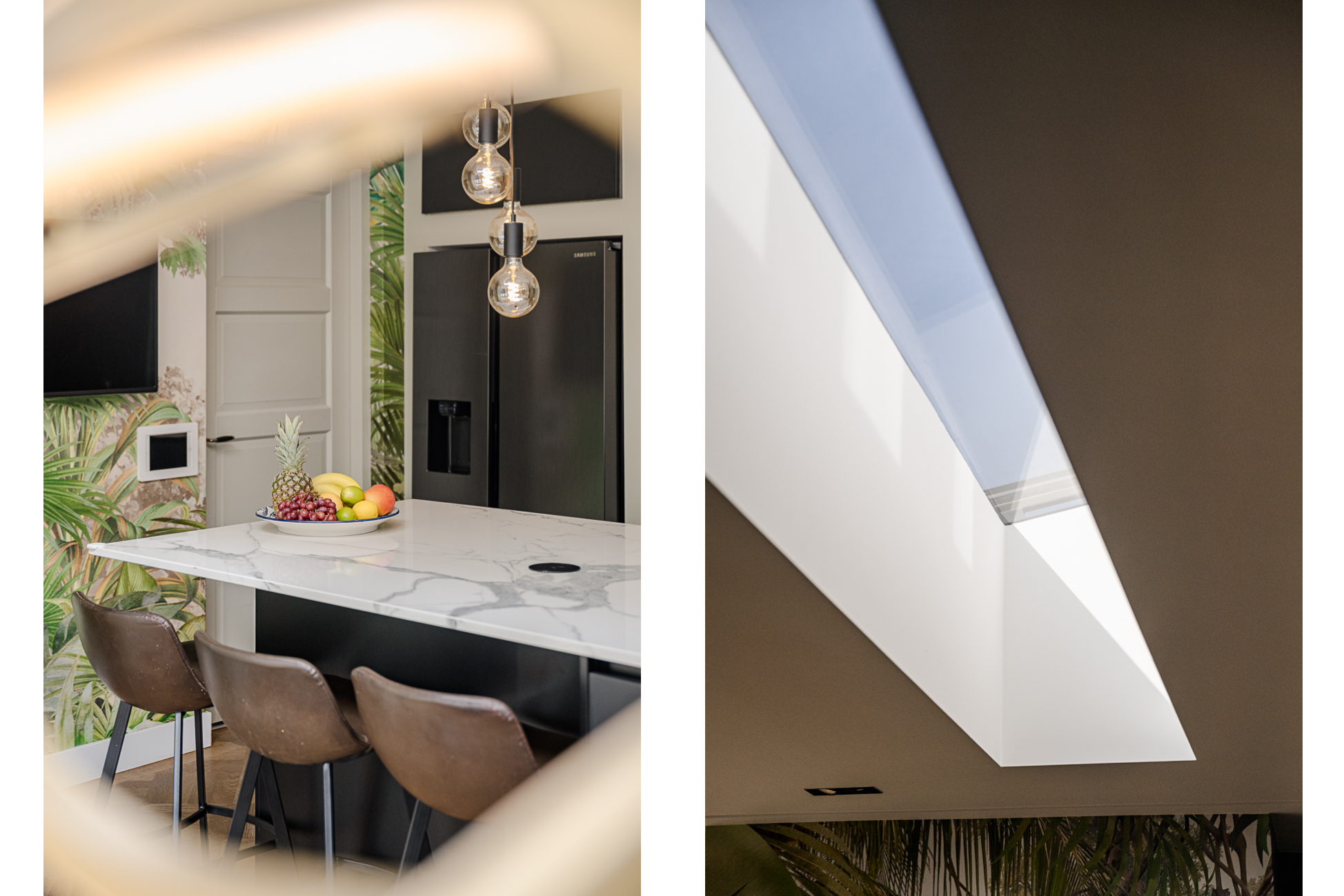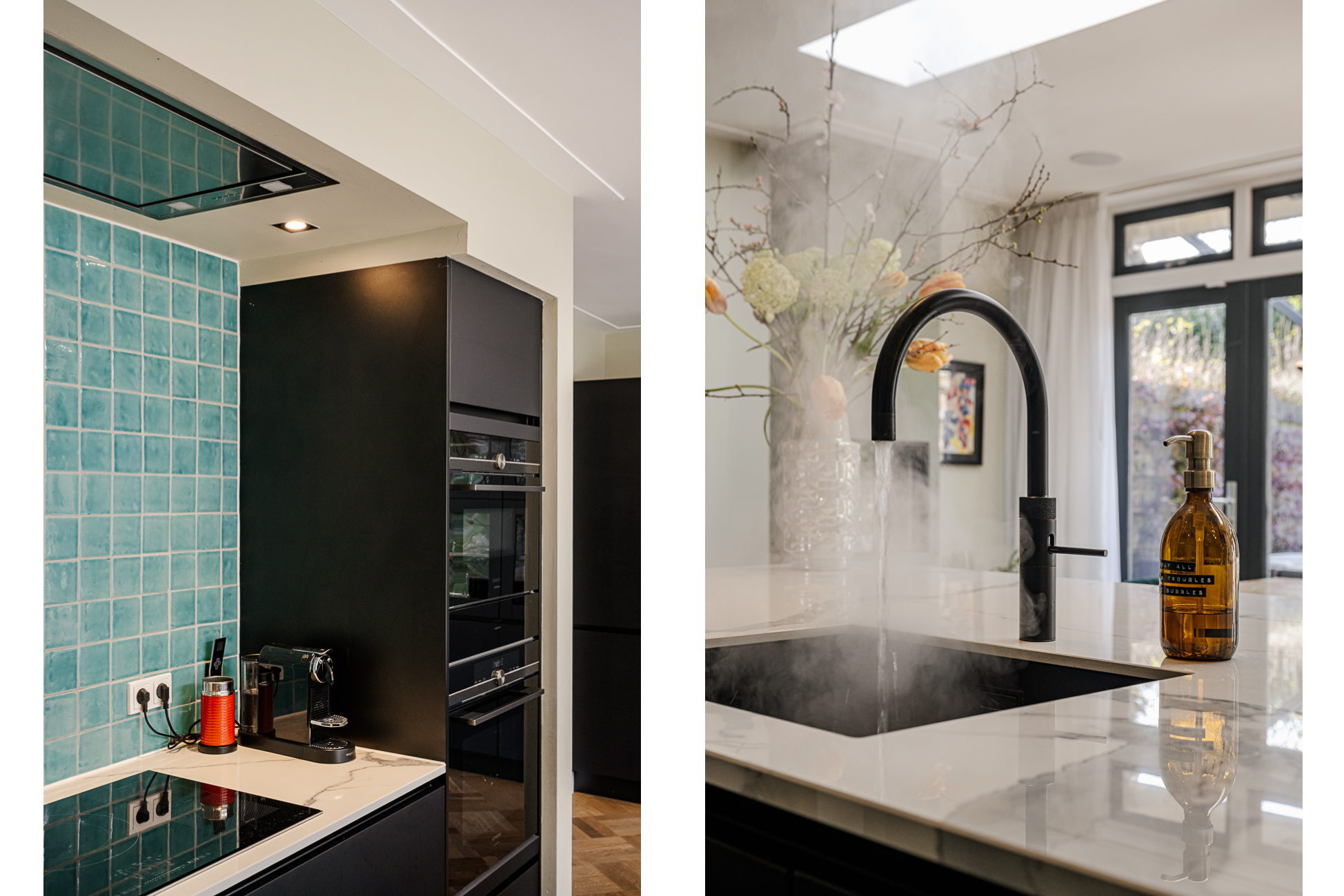 Aan de achterzijde bevindt zich de riante woonkeuken met lichtstraat. Dankzij de grote glaspartijen en openslaande deuren naar de tuin stroomt het daglicht rijkelijk naar binnen. Het kookeiland met bar vormt het middelpunt van de ruimte. De keuken is uitgerust met onder andere een Quooker, wijnklimaatkast, Amerikaanse koelkast, combi-oven, separate oven en warmhoudlade.