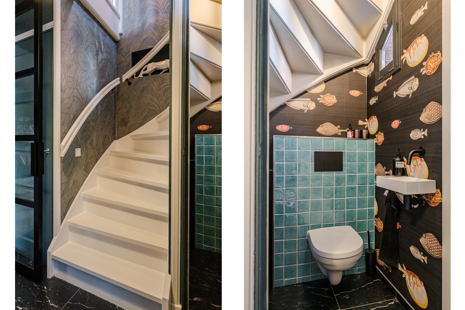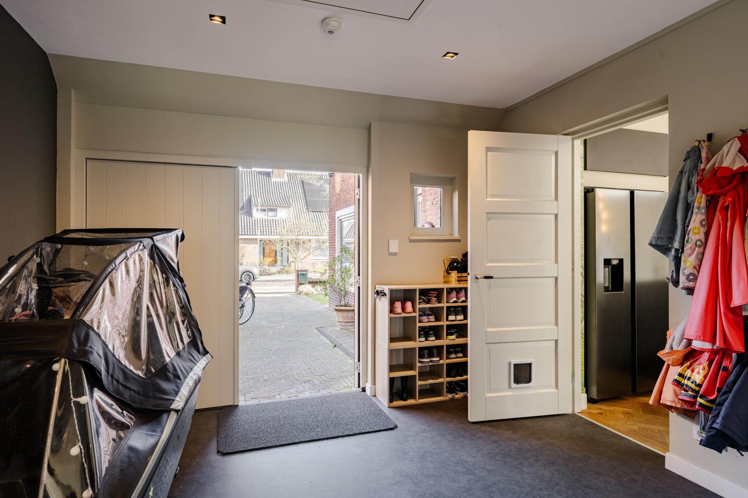 Je betreedt de woning via een royale entree met garderobe onder de trap, modern toilet en een uitgebreide meterkast met 22 groepen en 6 aardlekschakelaars. In de bergkast bevindt zich de thuisbatterij voor opslag van zonne-energie.