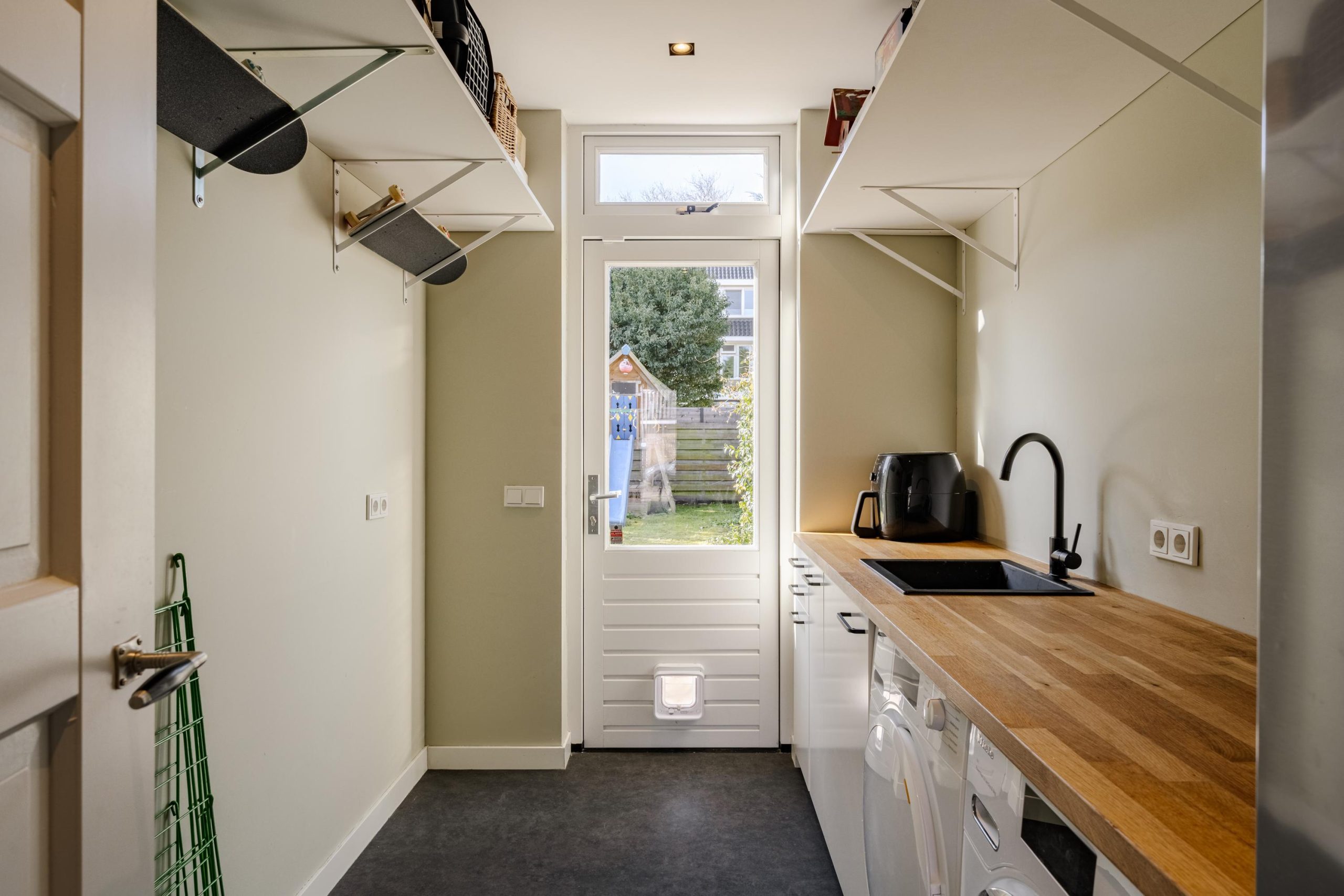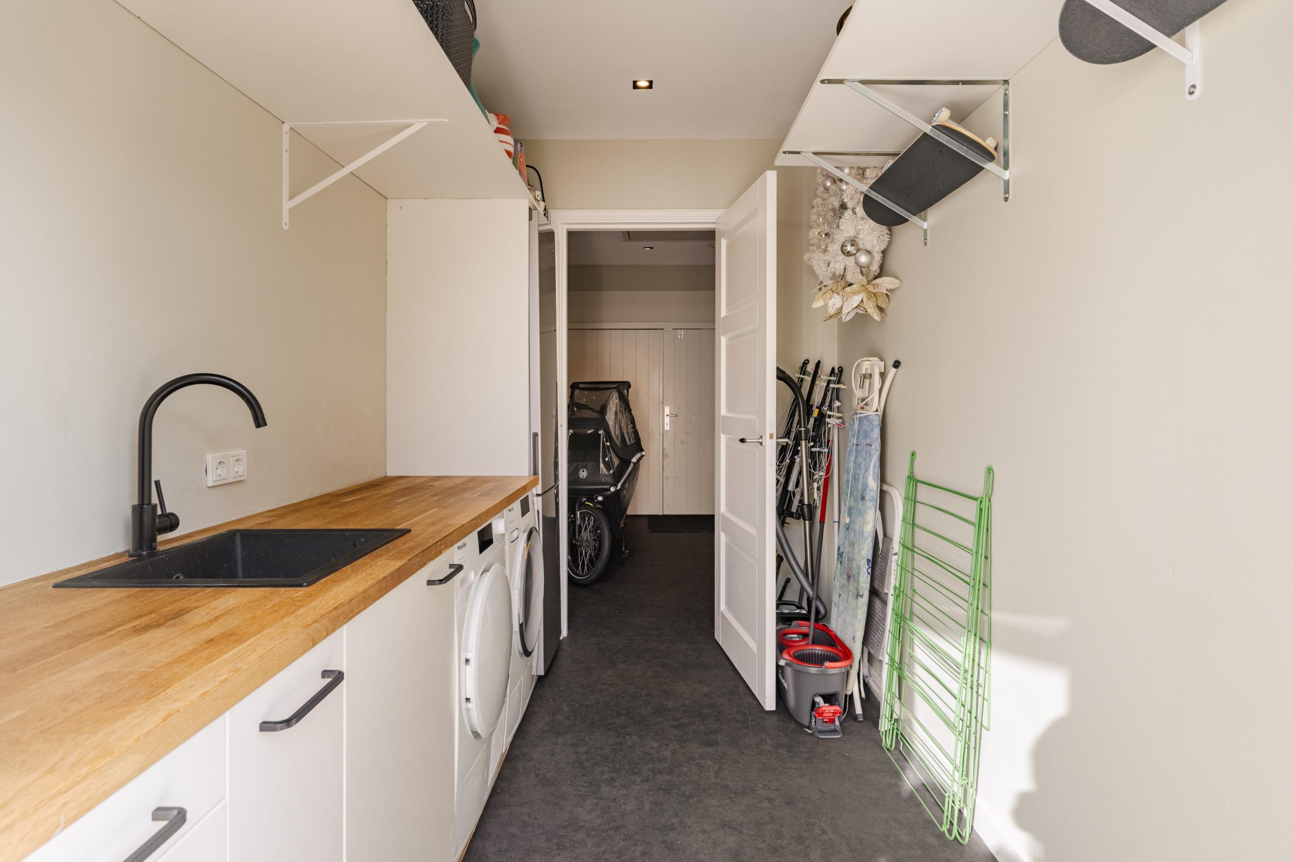De woonkeuken is voorzien van vloerverwarming en een tweede gashaard. Aangrenzend vind je de speelkamer en de garage met bergzolder en de bijkeuken met wasmachine- en drogeraansluiting. Ideaal voor opslag, hobbyruimte of het veilig stallen van fietsen.